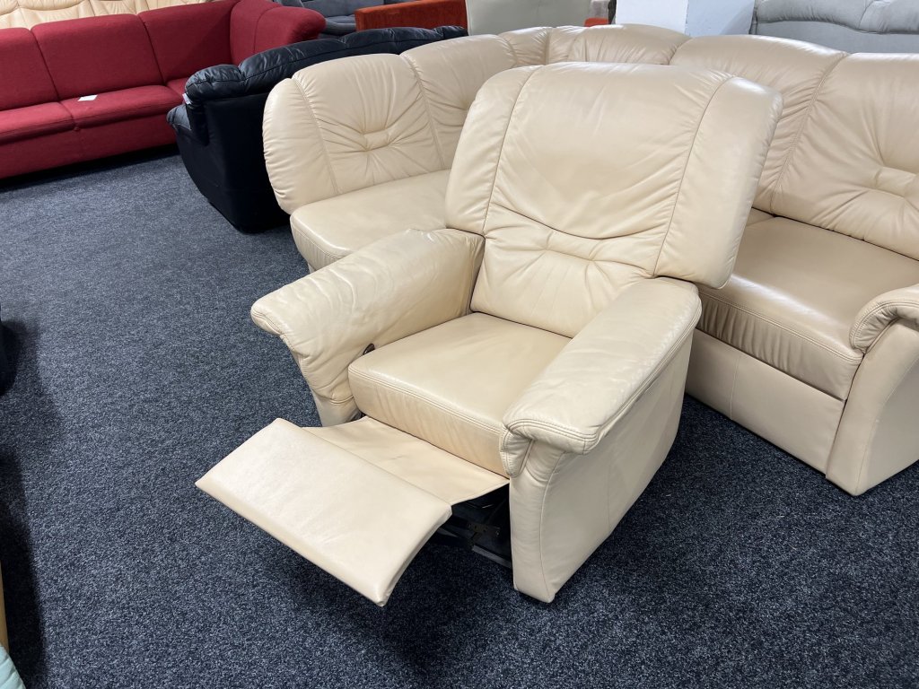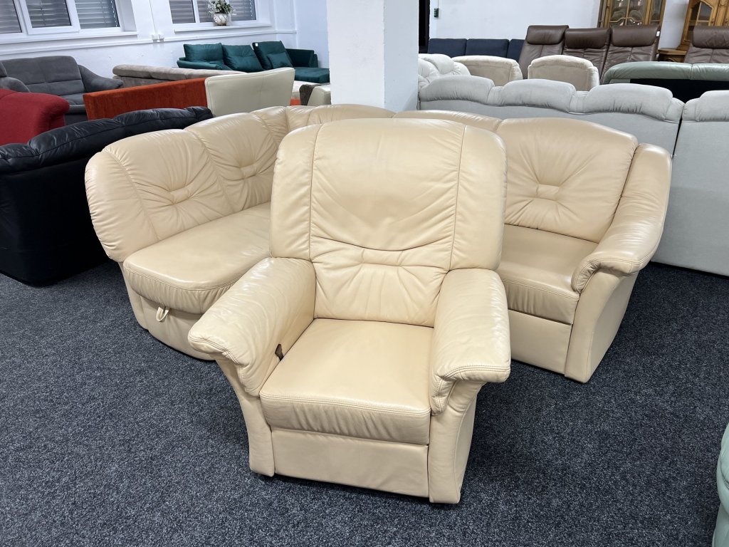 Rohová sedací souprava v koženém provedení s odpovídajícím křeslem nabízí praktické funkce, rozkládací mechanismus a úložný prostor. Souprava je celočalouněná a ve stavu zánovní.