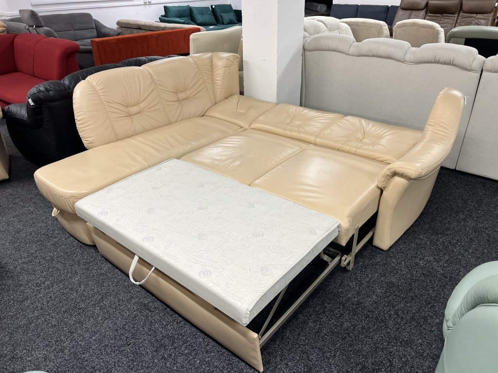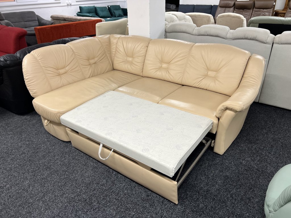 Sedací souprava rohová rozkládací + křeslo, kožená, zánovní