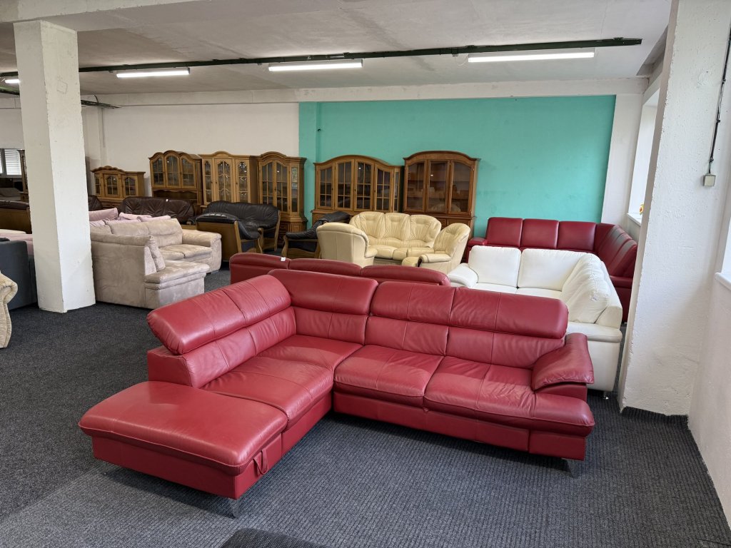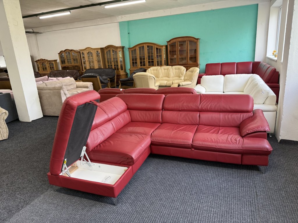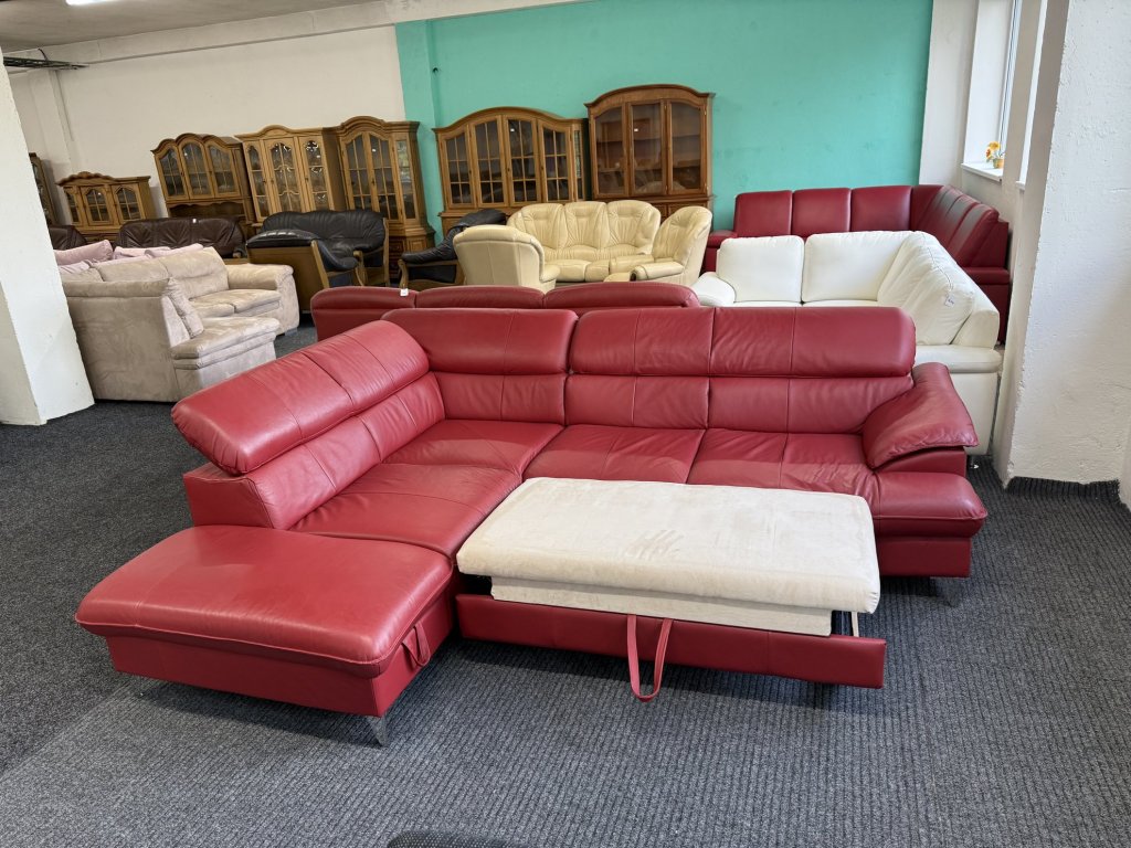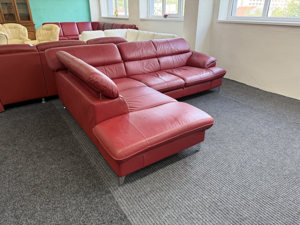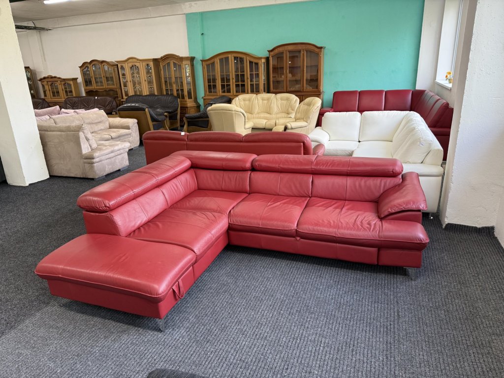 Rohová sedací souprava z pravé kůže v červené barvě. Celočalouněné provedení umožňuje její umístění volně do prostoru. Sedačka je rozkládací, doplněná o menší úložný prostor a polohovací opěrky hlavy.