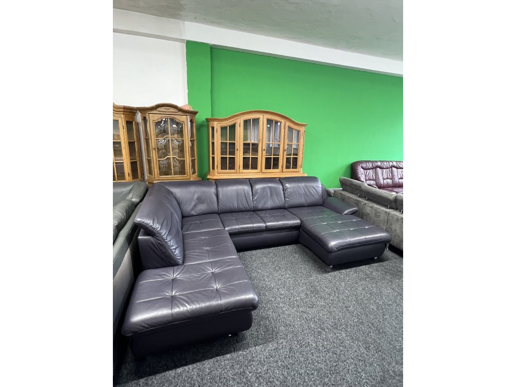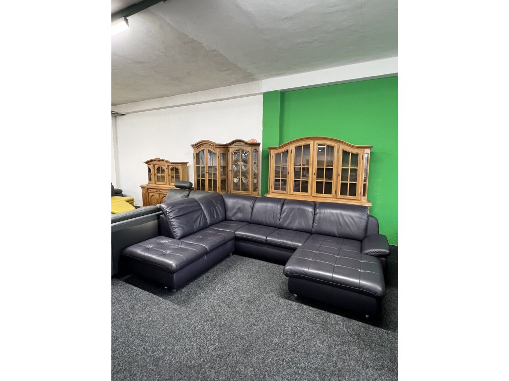 Prostorná sedací souprava tvaru U v koženém provedení. Vybavena polohovacími opěrkami hlavy. Zánovní stav.