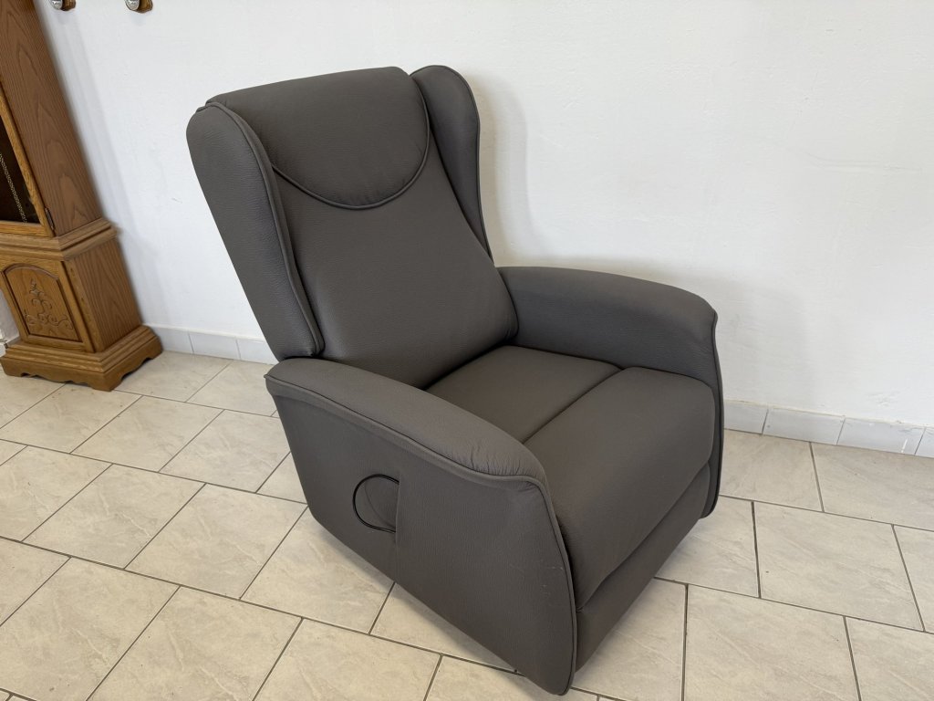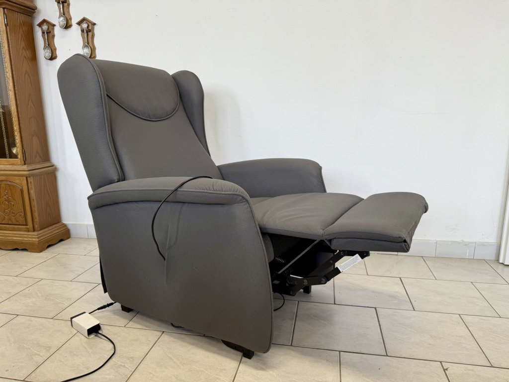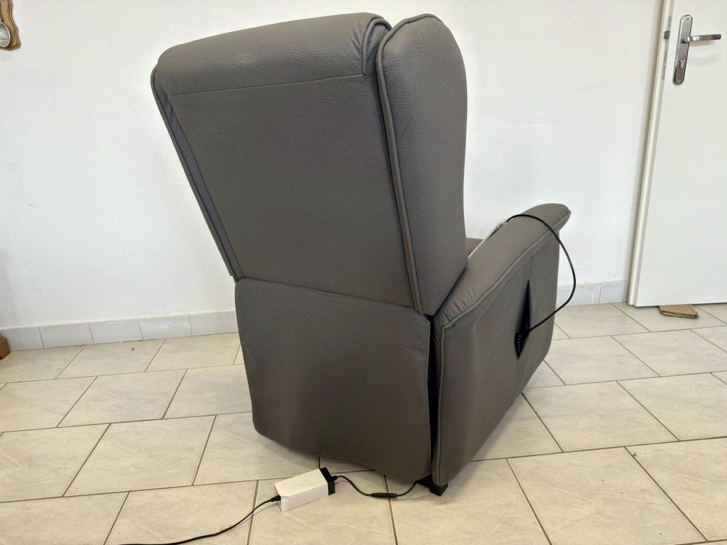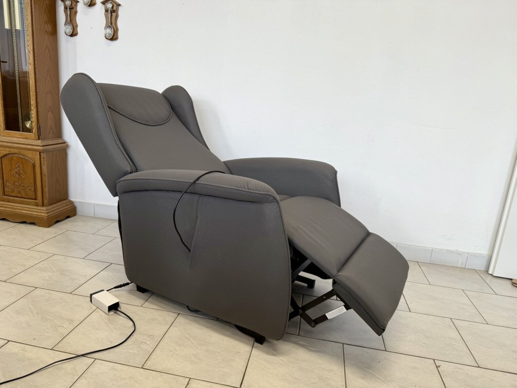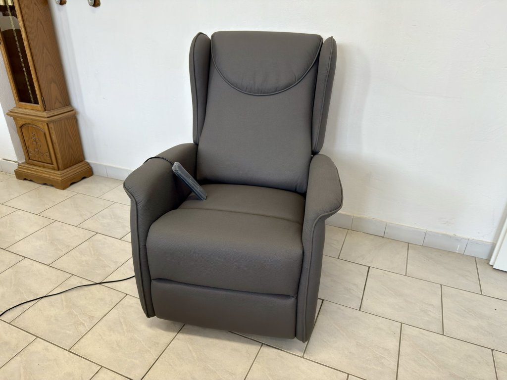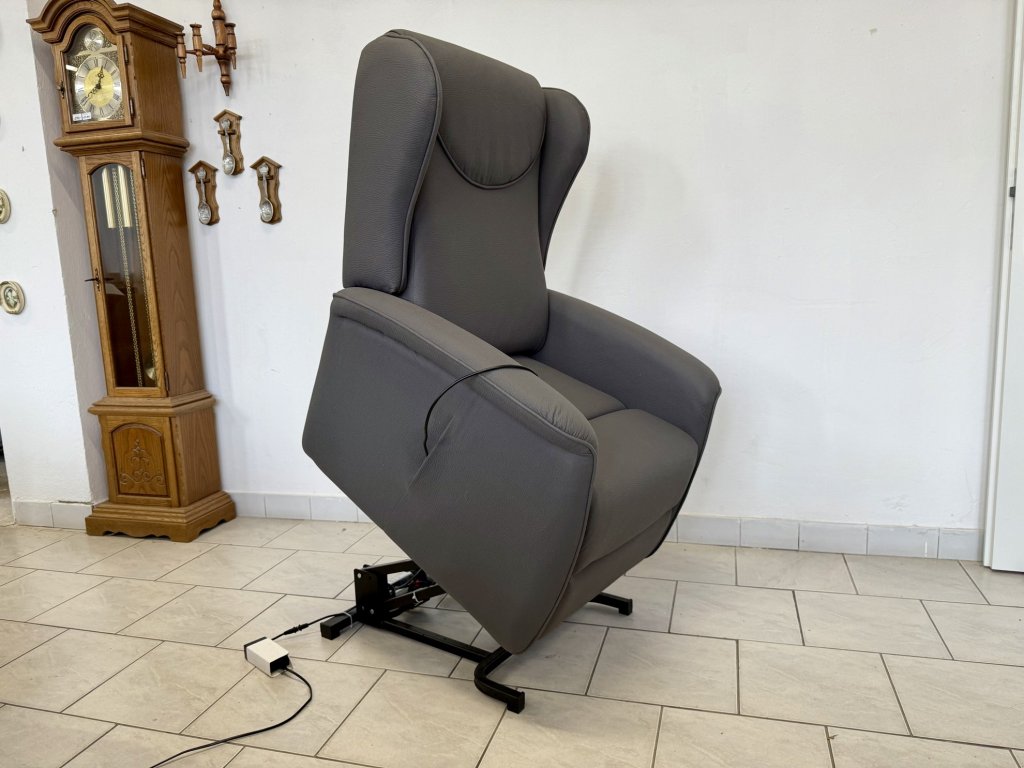 Elektricky polohovací křeslo s funkcí zdvihu pro snadné vstávání. Potah tvoří šedá látka s jemnou strukturou. Křeslo je celočalouněné a nepoužité. Ovládání je zajištěno dálkovým ovladačem.