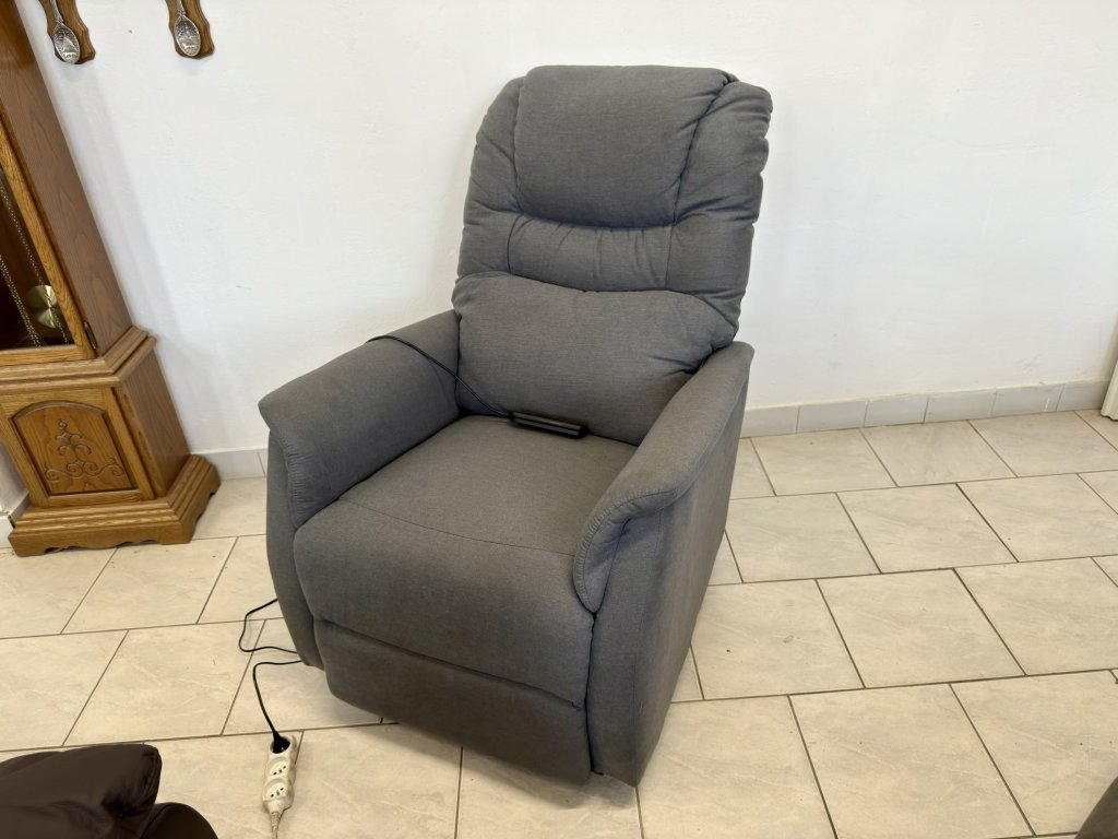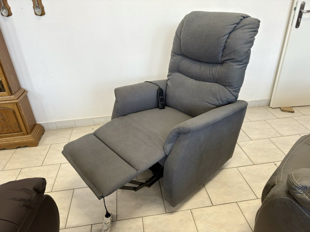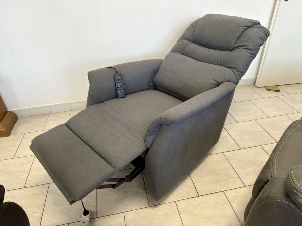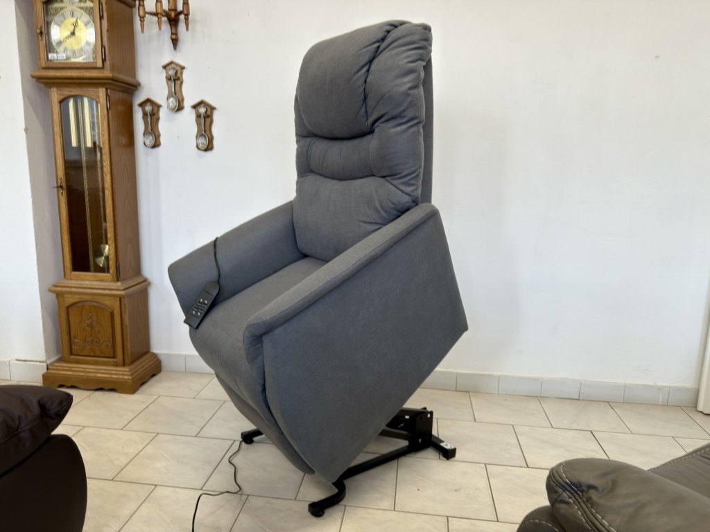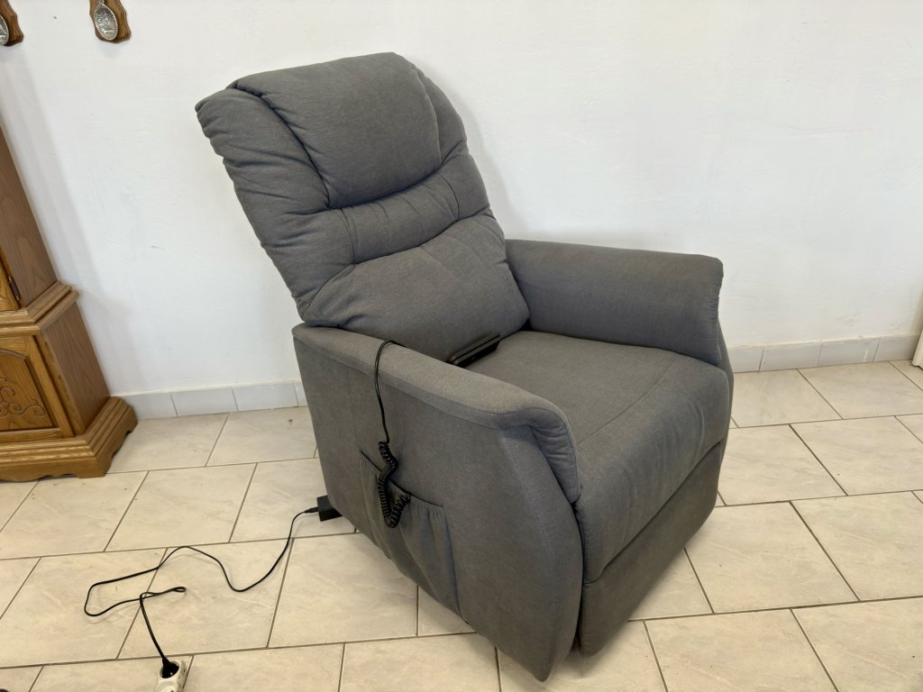 Elektricky ovládané polohovací křeslo s funkcí zdvihu pro snadné vstávání. Potah tvoří šedá látka s hladkou strukturou. Křeslo je celočalouněné a nepoužité.