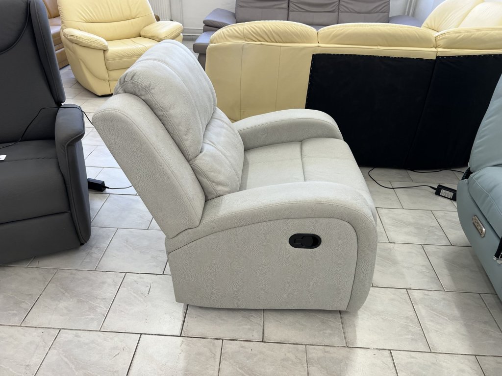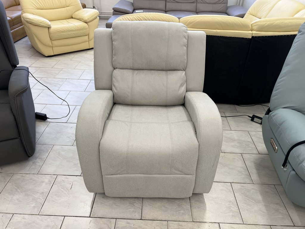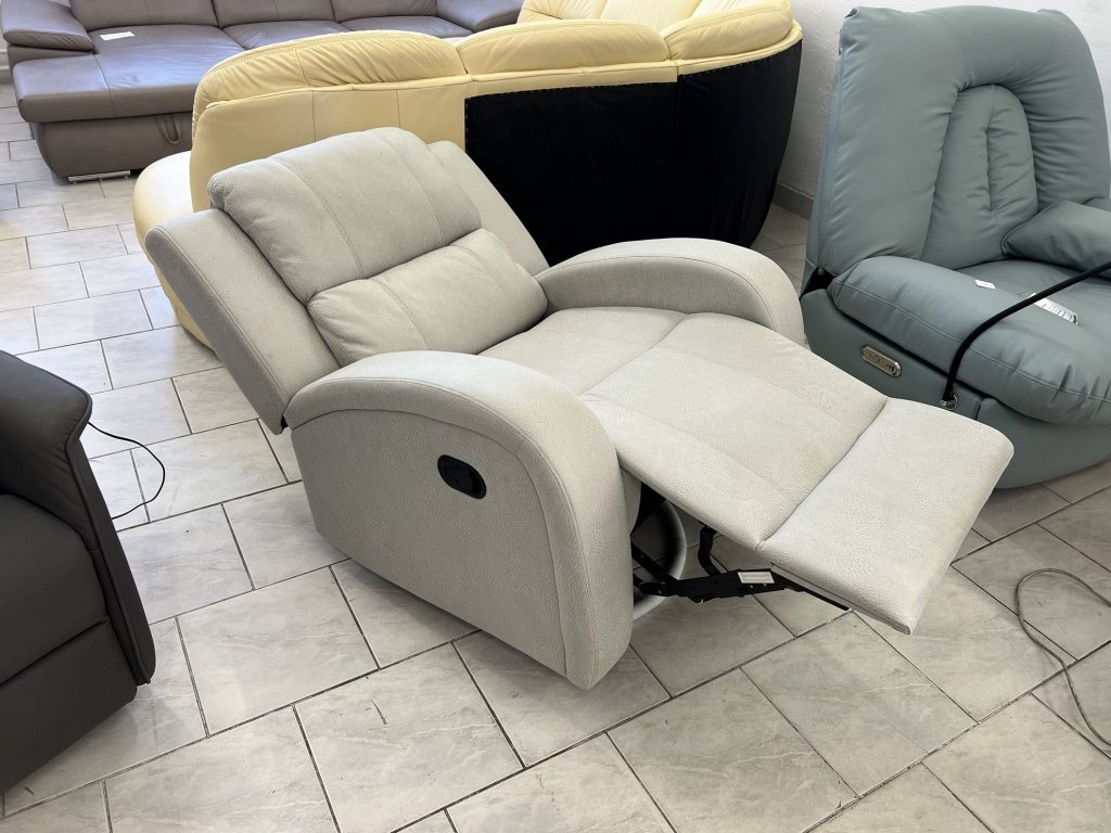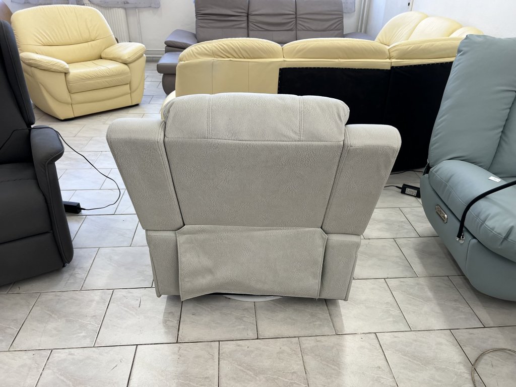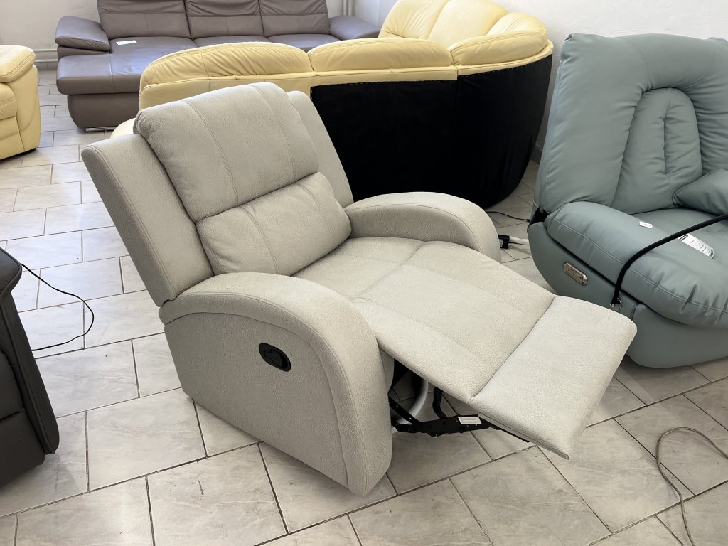 Látkové celočalouněné křeslo v šedém odstínu, nepoužité. Křeslo je vybaveno manuálním polohováním, houpací funkcí a otočnou základnou.