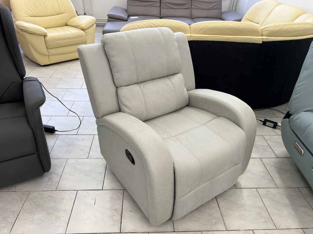 Polohovací látkové křeslo s otočnou základnou a funkcí houpání, vhodné pro odpočinek a každodenní sezení.