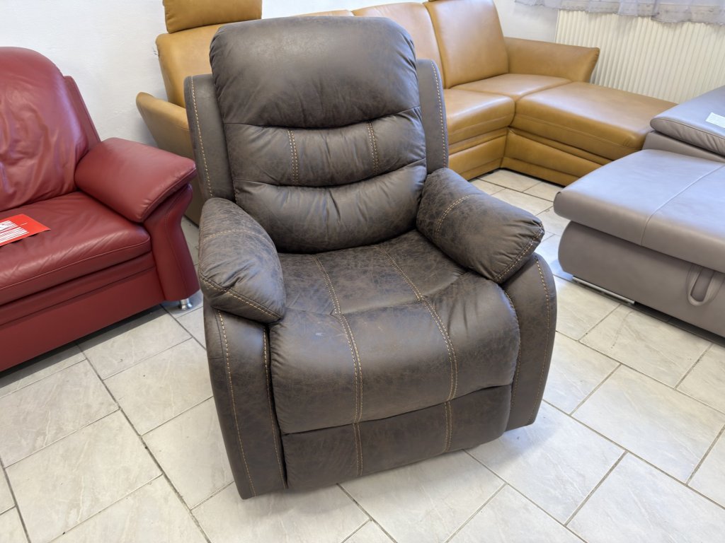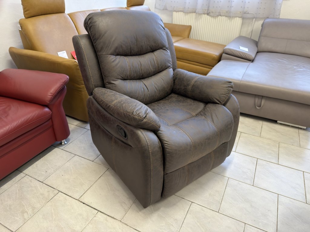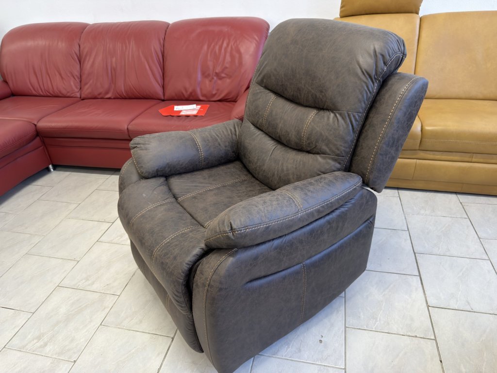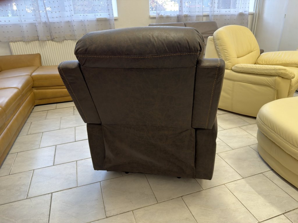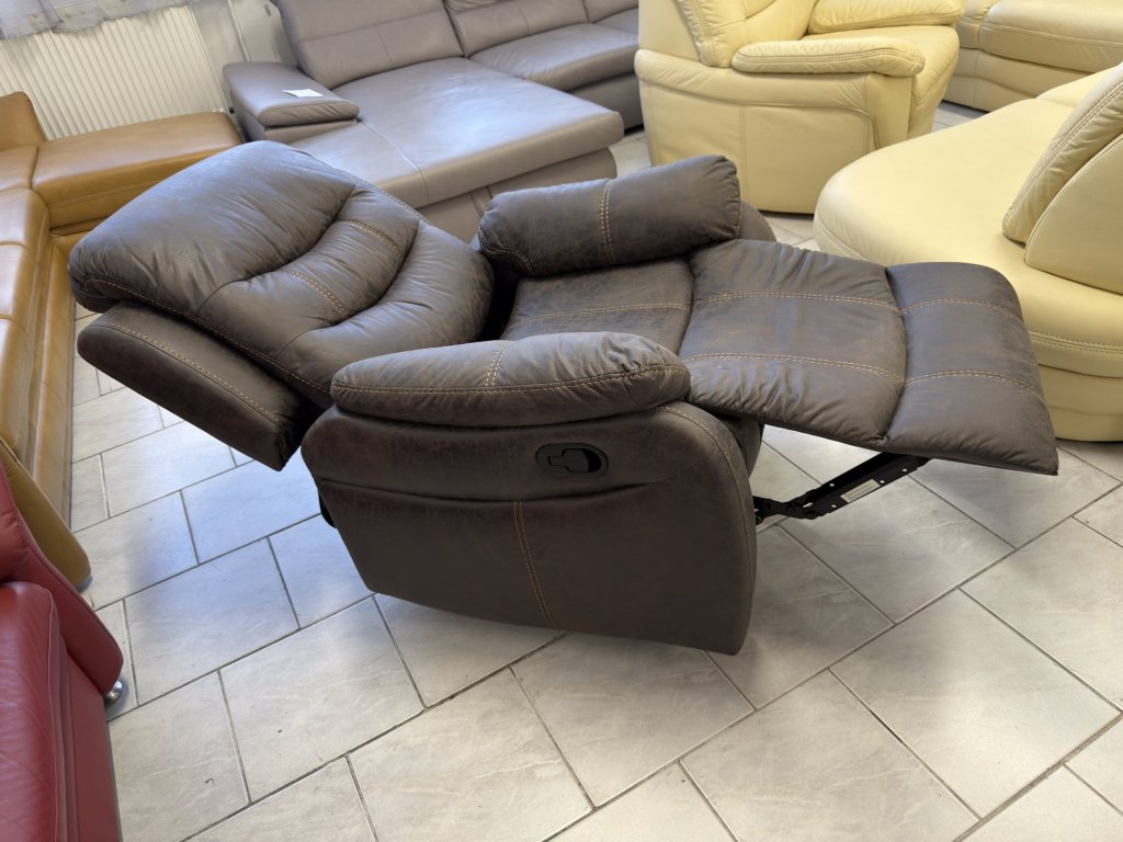 Polohovací relaxační křeslo s měkkým čalouněním v hnědé barvě. Ovládání je manuální pomocí páčky na boku. Křeslo je celočalouněné a nepoužité.