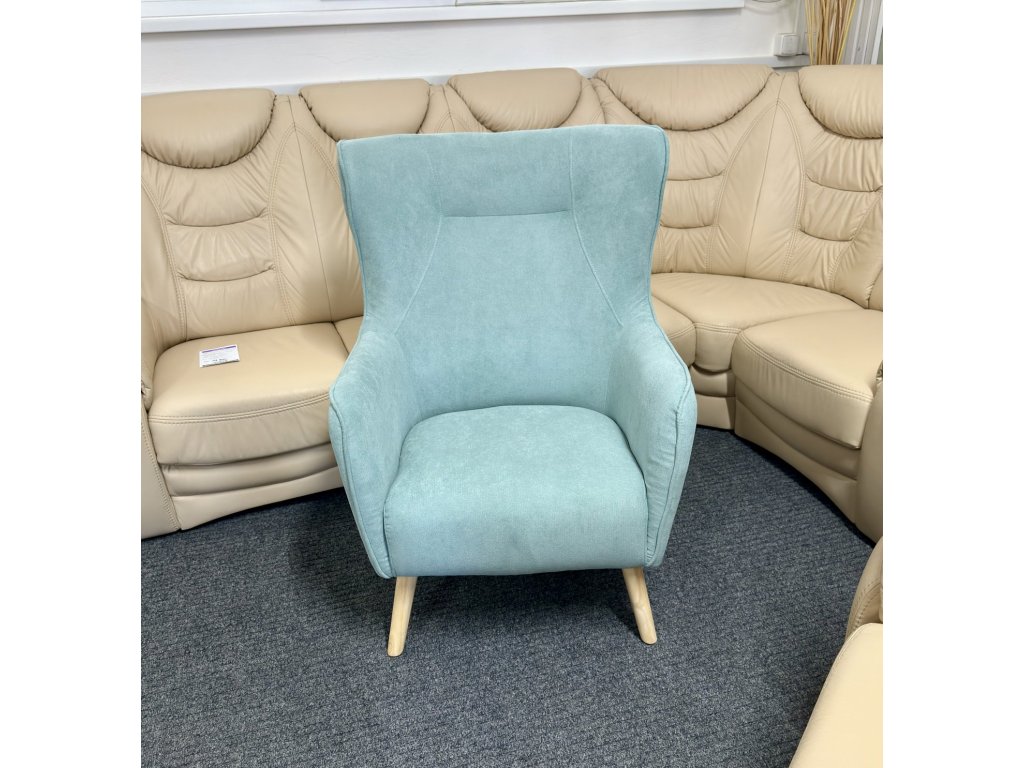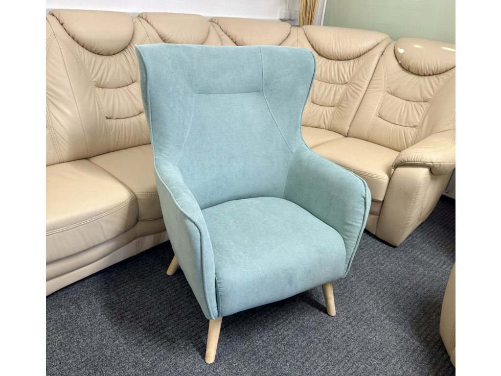 Křeslo má jednoduché čalouněné plochy s mírným tvarováním opěradla. Potah je látkový v jednobarevném provedení. Nohy jsou dřevěné v přírodním odstínu.
