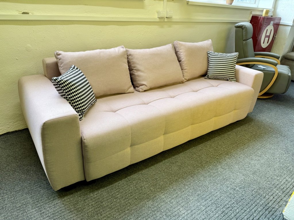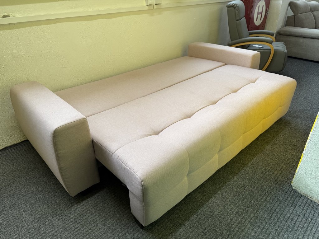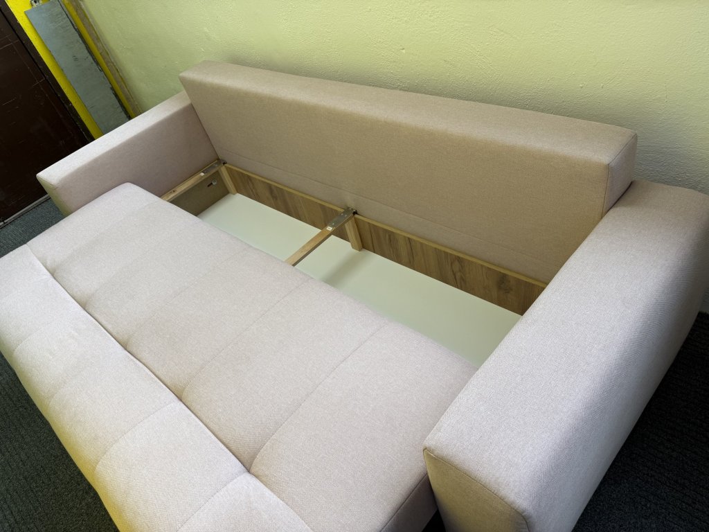 Rozkládací látková pohovka s úložným prostorem v celočalouněném provedení. Pohovka je nepoužitá. Světlý potah z jemné tkaniny doplňují měkké opěrné a dekorační polštáře.
