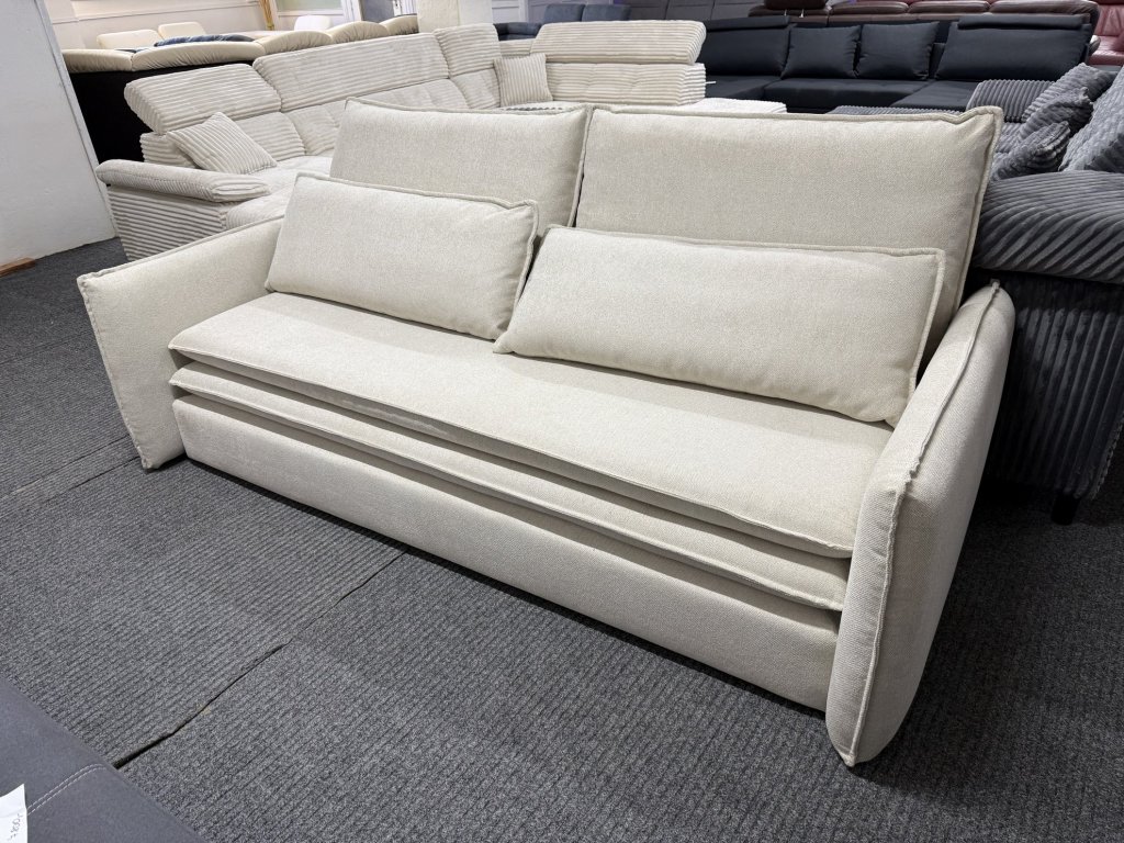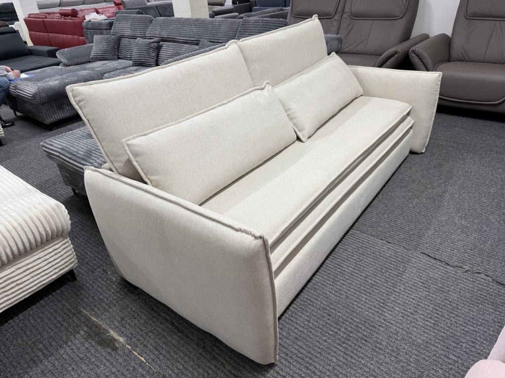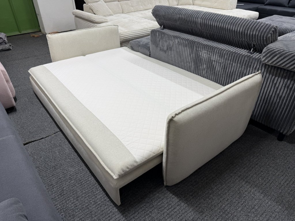 Rozkládací pohovka v látkovém provedení, celočalouněná, určená pro každodenní sezení i příležitostné spaní. Pohovka je nepoužitá a disponuje rozkládacím mechanismem s plochou lůžka pro dvě osoby.