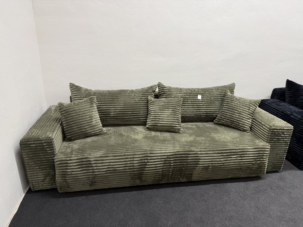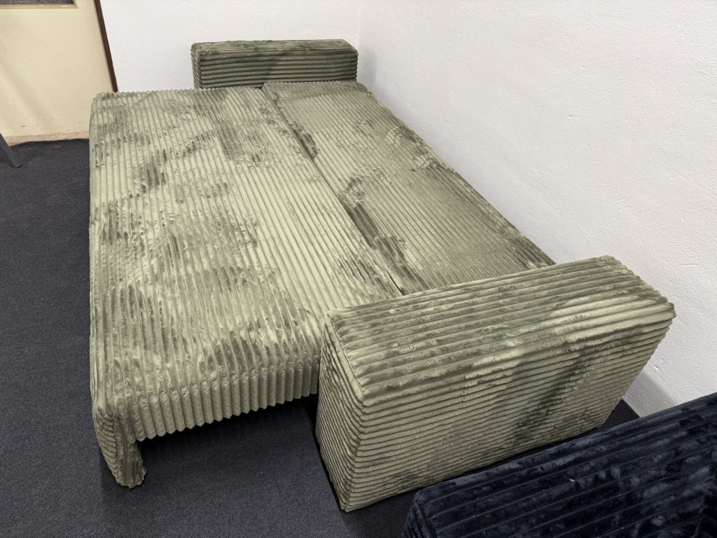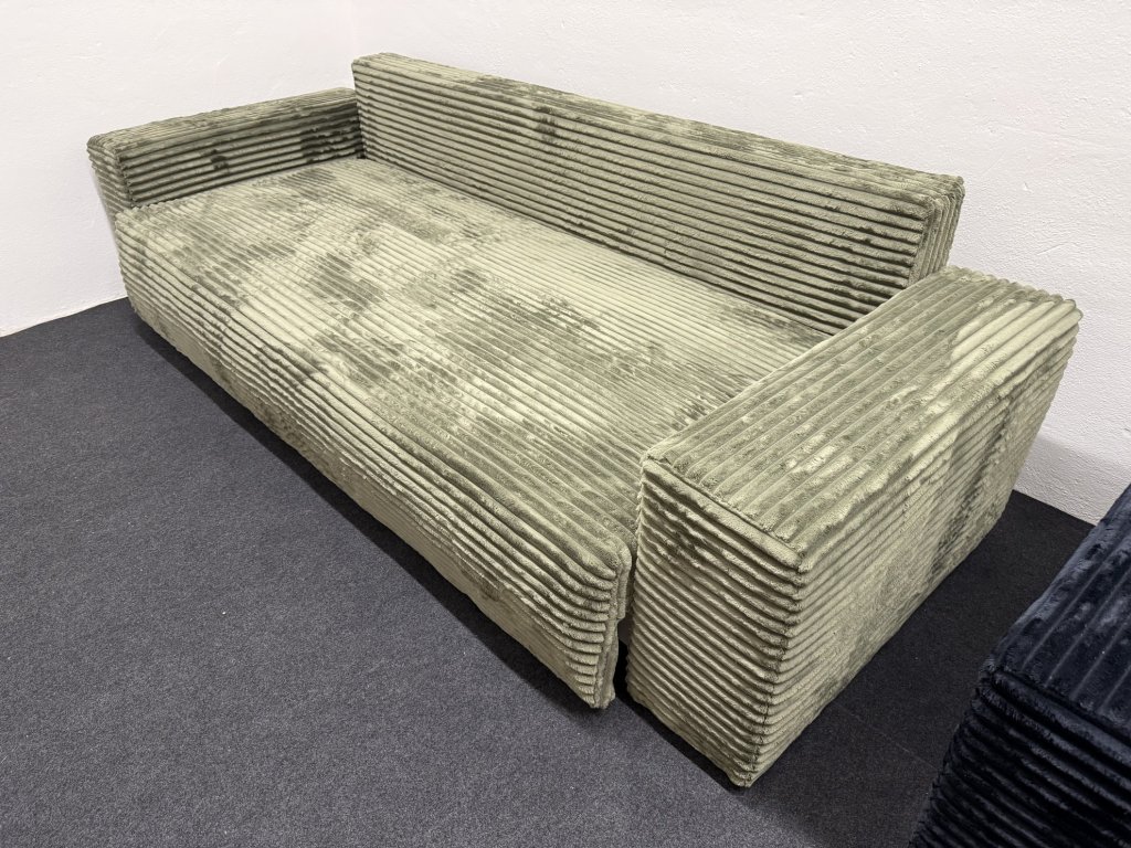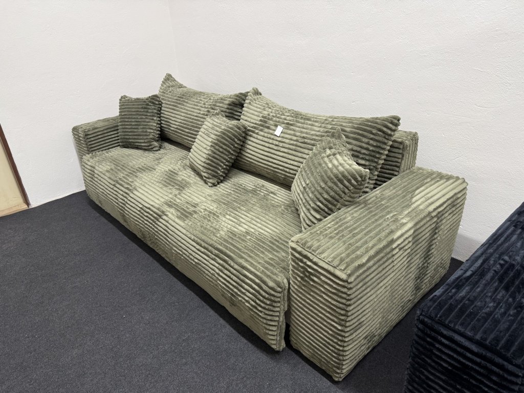 Pohovka je potažena látkou se strukturovaným povrchem v zeleném odstínu. Povrch tvoří podélná plastická struktura typická pro manšestrový typ textilie. Sedací část doplňují velké opěrné polštáře a menší polštáře ve stejném materiálu.