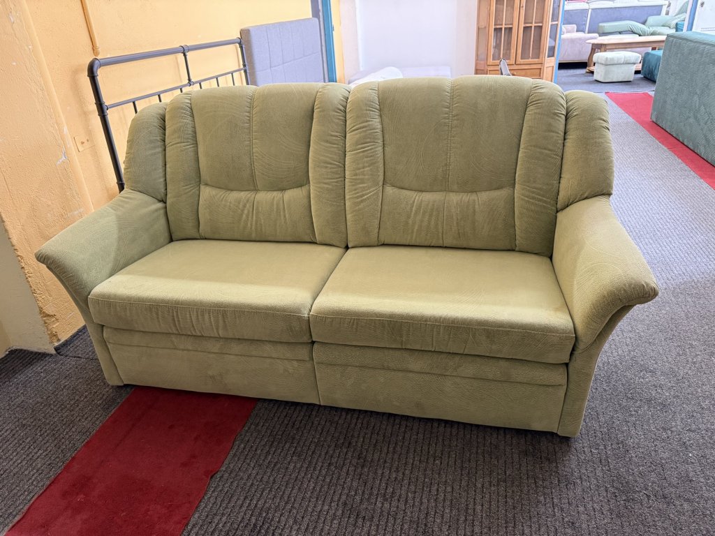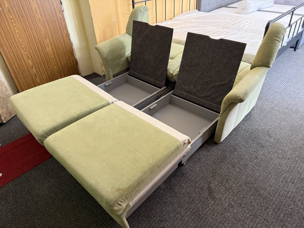 Rozkládací pohovka v látkovém provedení, zánovní stav. Pohovka není celočalouněná – zadní část je potažena technickou tkaninou. Je vybavena rozkládacím mechanismem pro příležitostné spaní a dvěma úložnými prostory přístupnými ze sedací části. Vhodná do obývacího pokoje, pracovny nebo pokoje pro hosty.