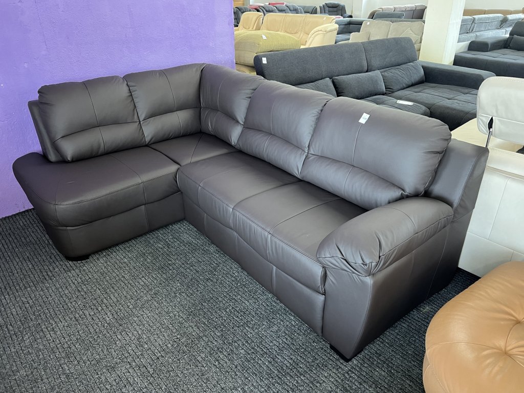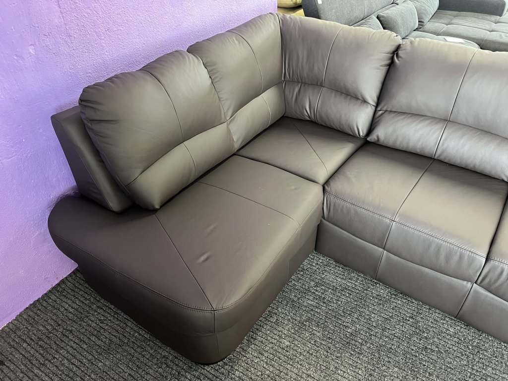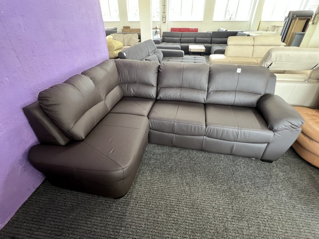 Rohová sedací souprava v provedení s levostranným rohem. Potah z hnědé kůže, souprava není celočalouněná. Nepoužitý kus. Vhodná k umístění ke zdi.