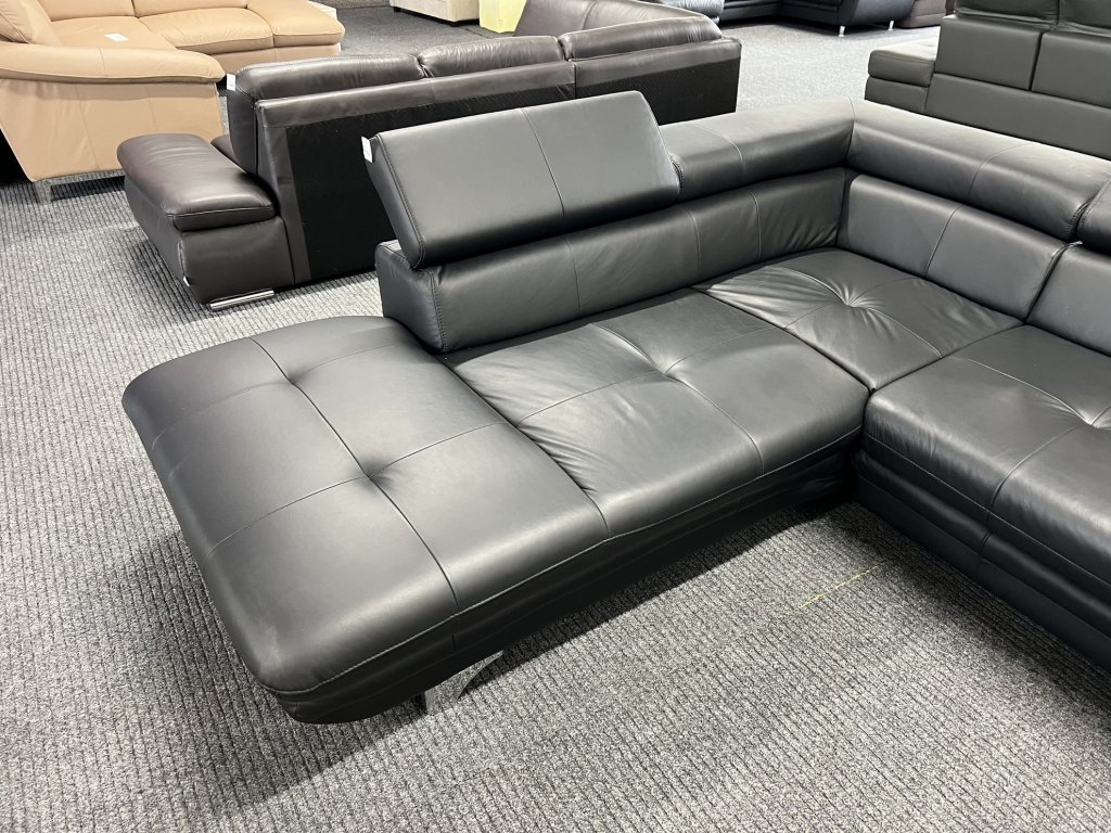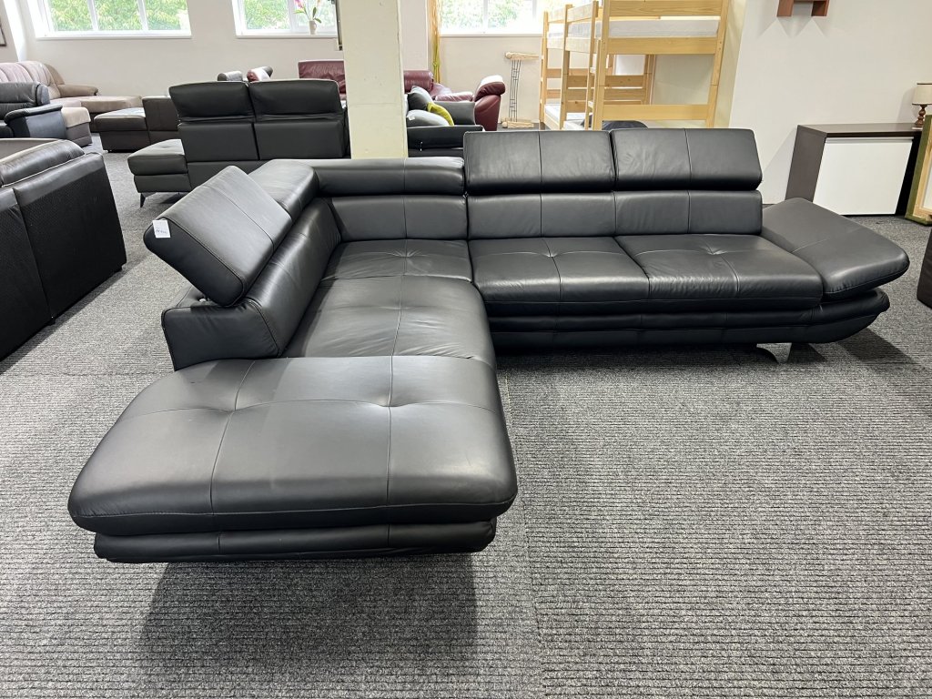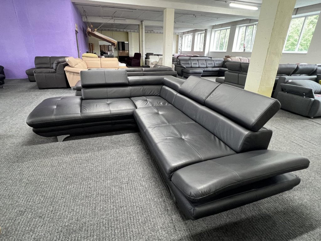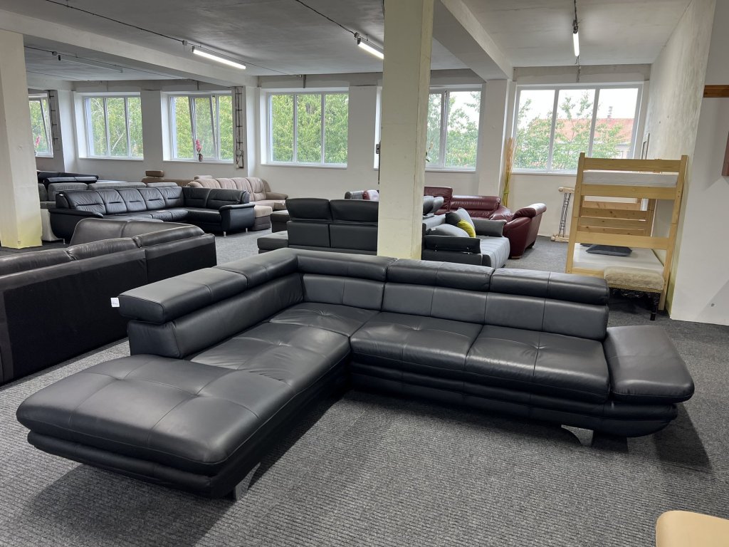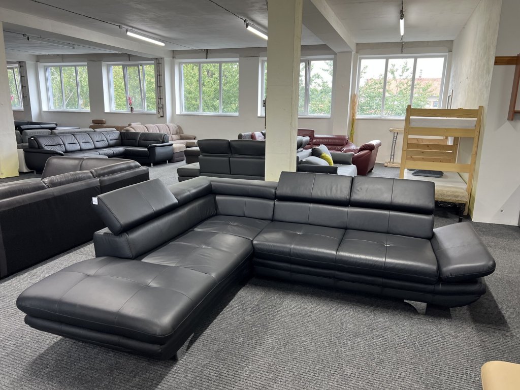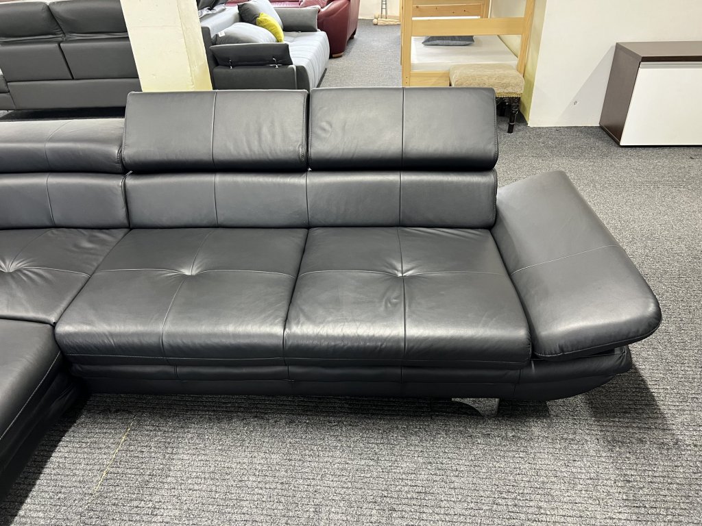 Rohová sedací souprava z pravé kůže v černé barvě. Souprava není celočalouněná, je doplněna o polohovací opěrky hlavy a také polohovací područku. Vhodná pro větší prostory.