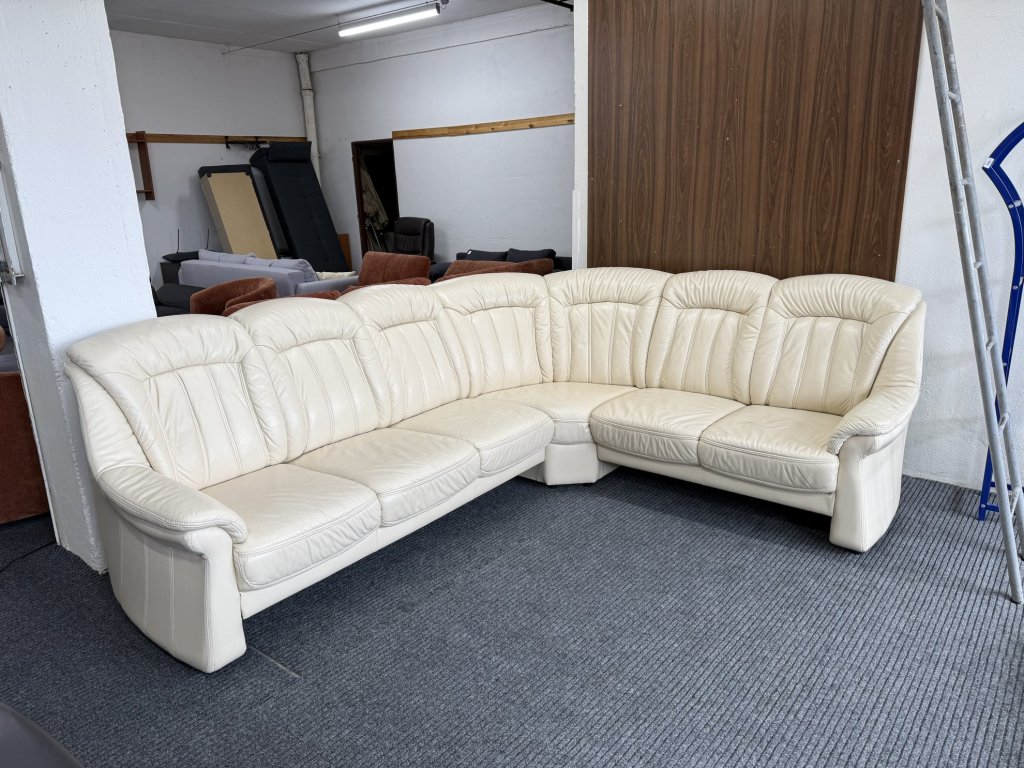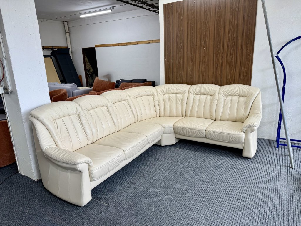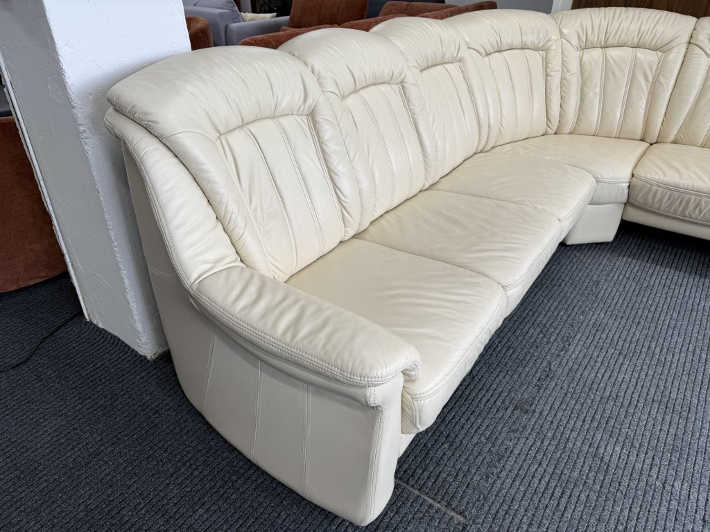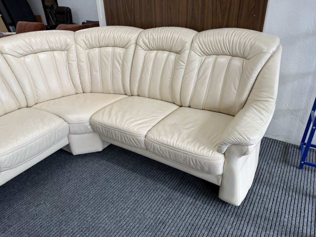 Rohová sedací souprava v provedení z pravé kůže. Není celočalouněná – zadní část je z technické tkaniny. Sedačka je nepoužitá, vhodná do rohu místnosti.