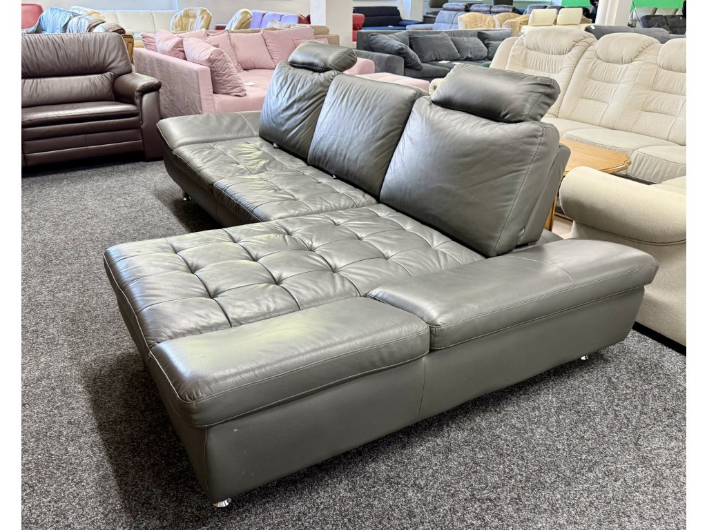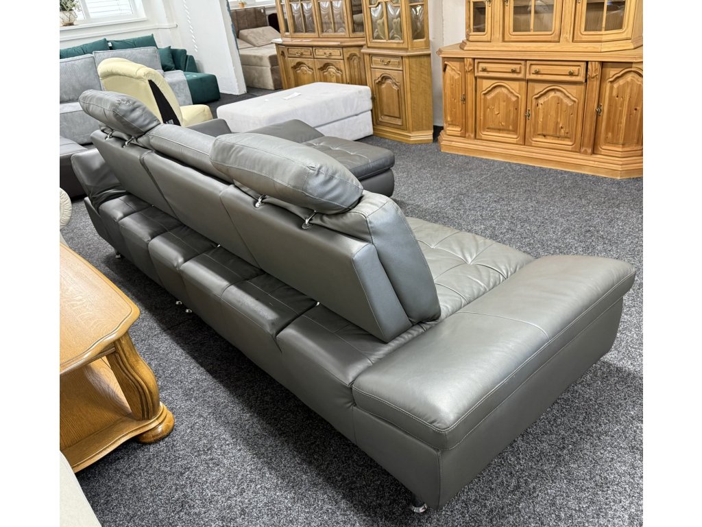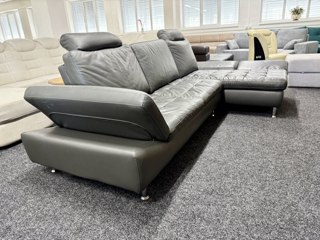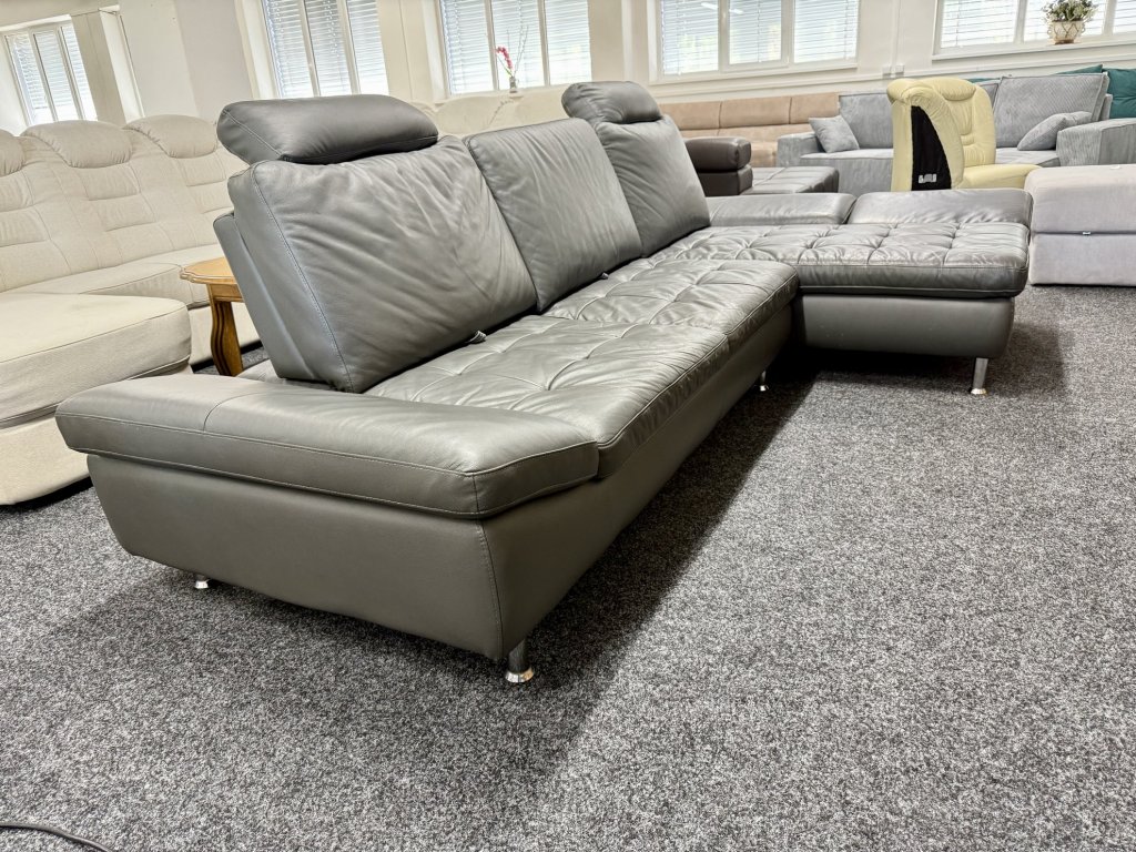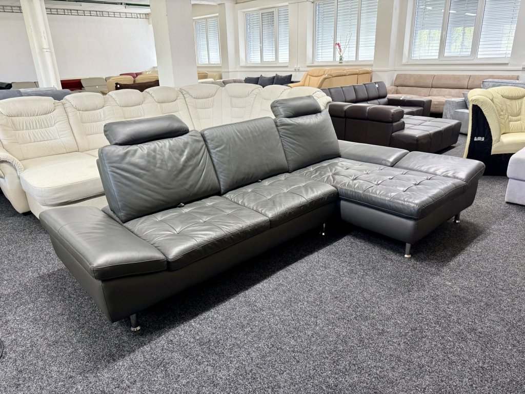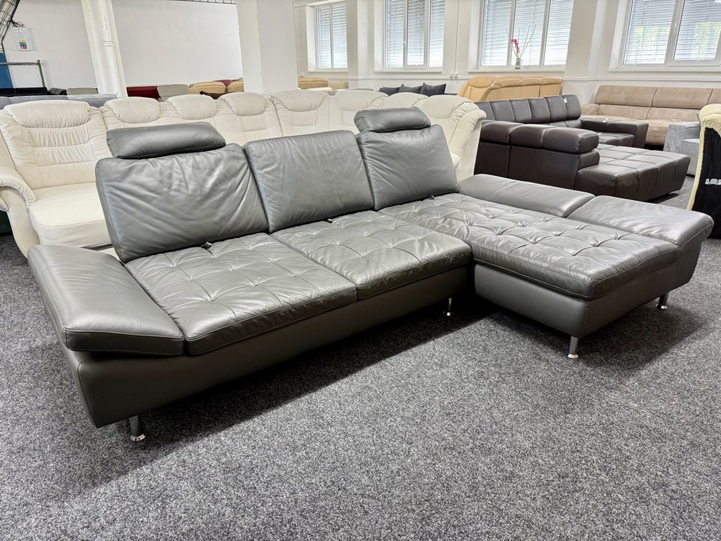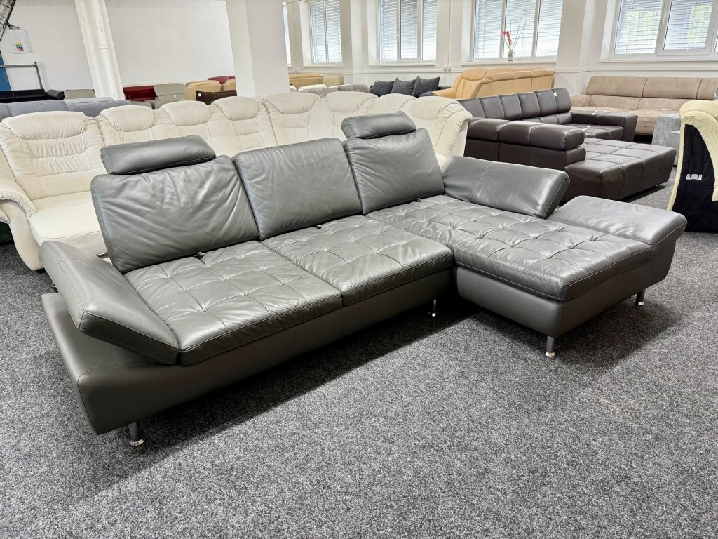 Rohová kožená sedací souprava s posuvnými zády a polohovacími područkami v šedém odstínu. Souprava je celočalouněná, vhodná k umístění volně do prostoru, a je ve zánovním stavu.