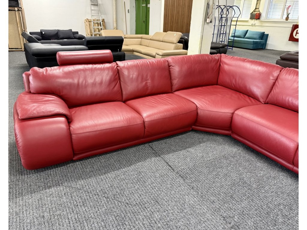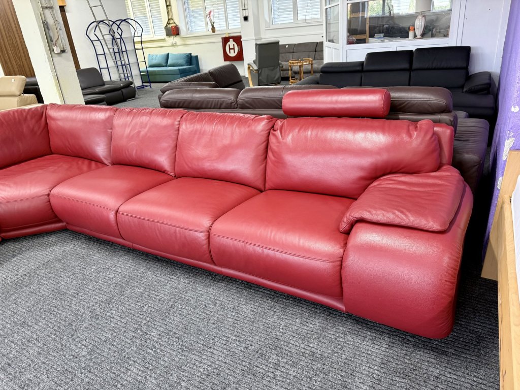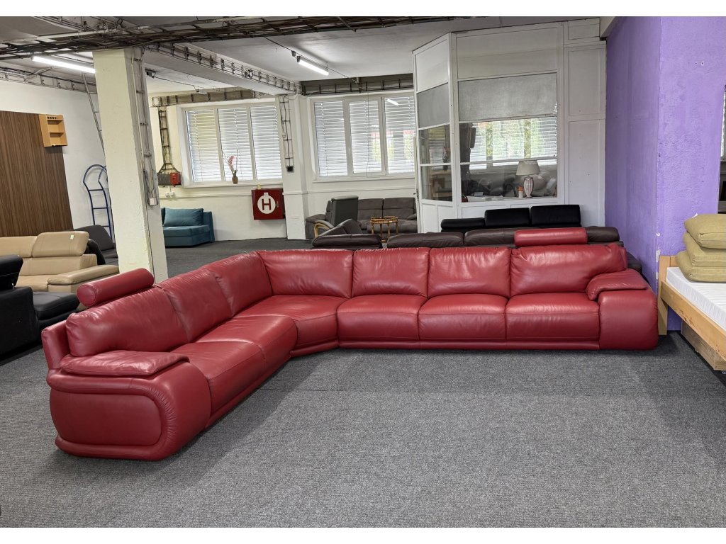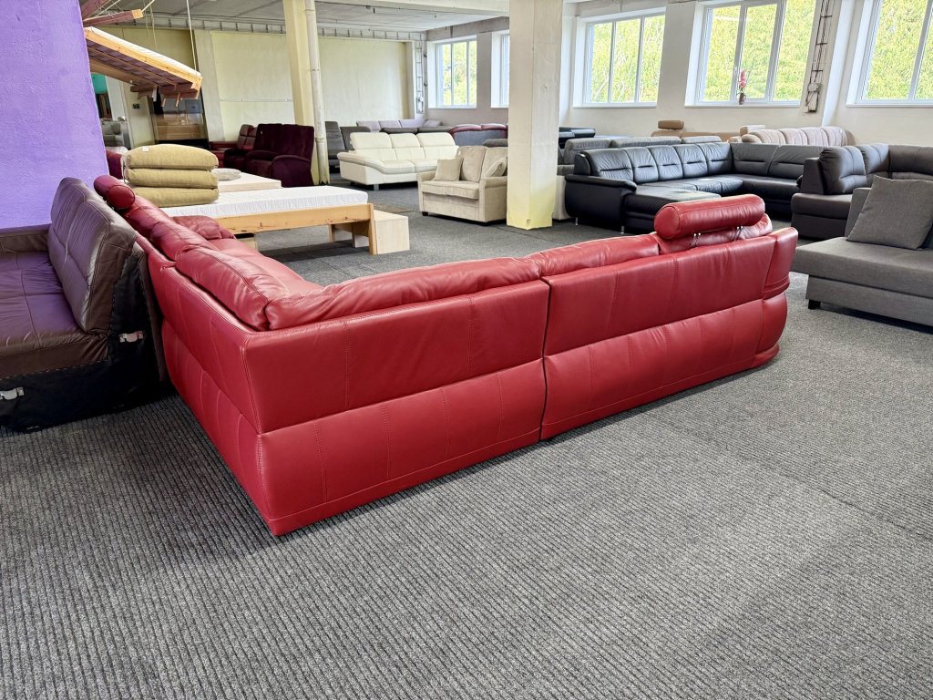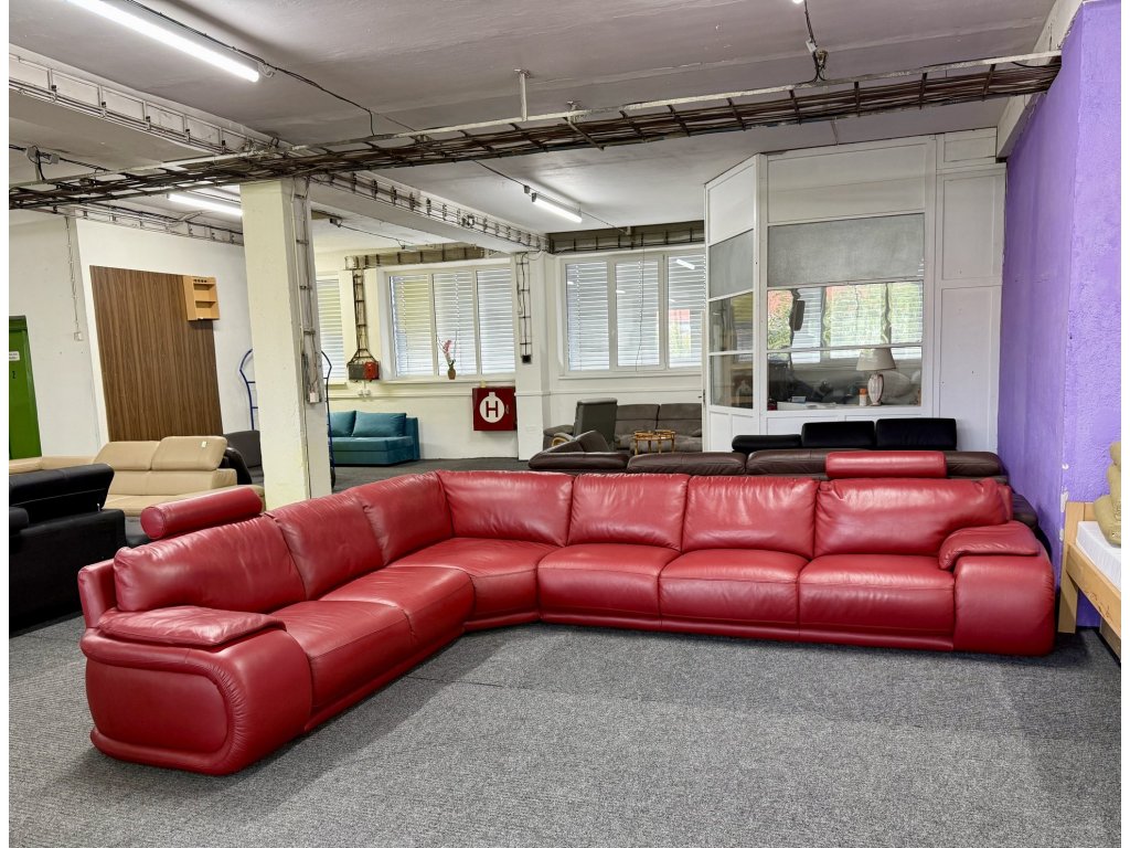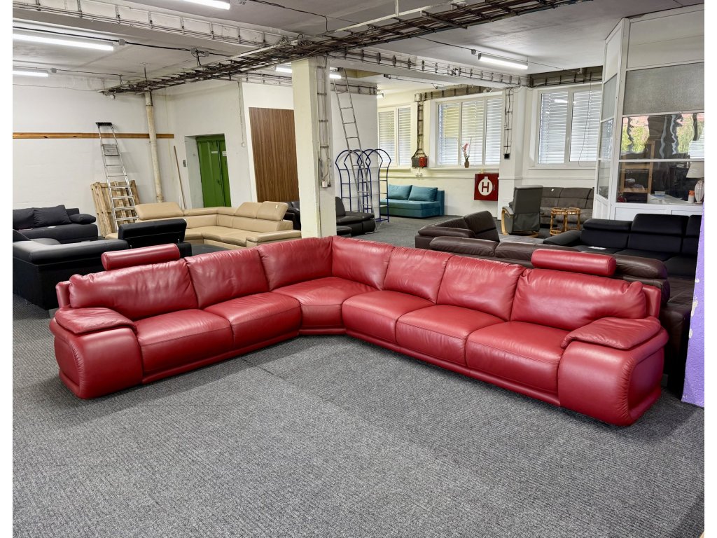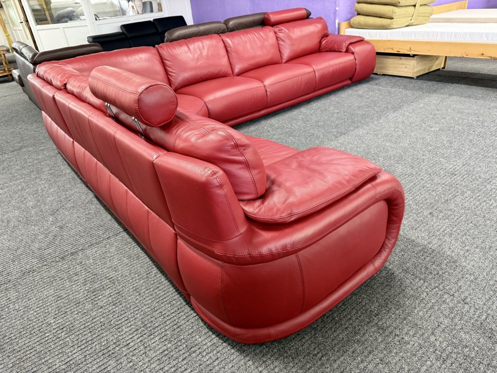 Rohová sedací souprava z pravé kůže v červeném provedení, zánovní, vhodná do prostorných interiérů.