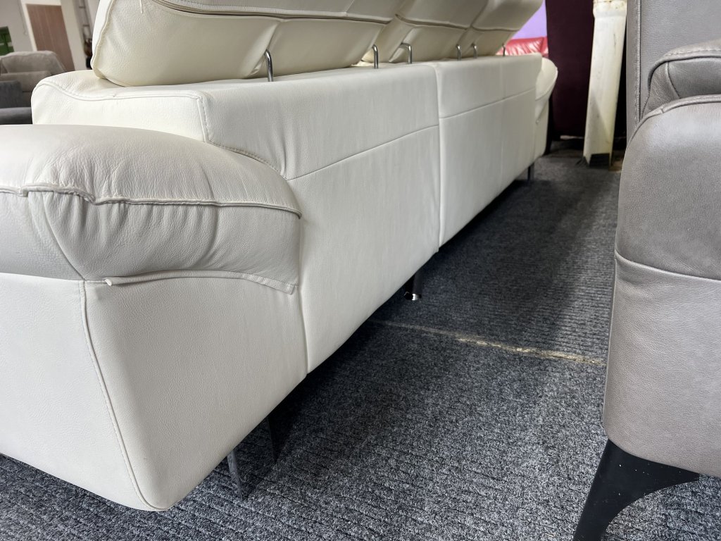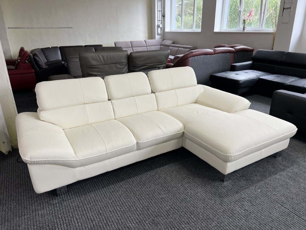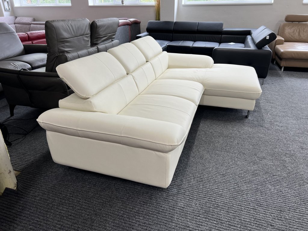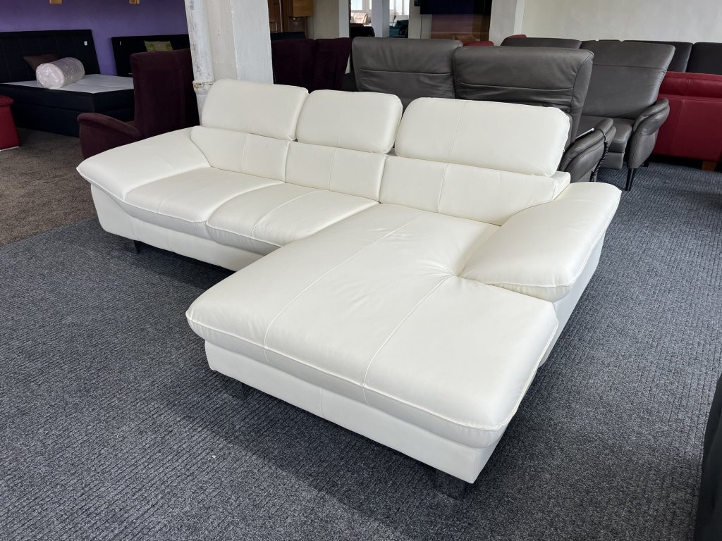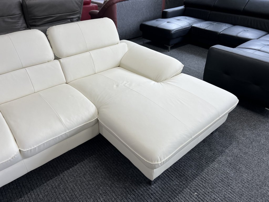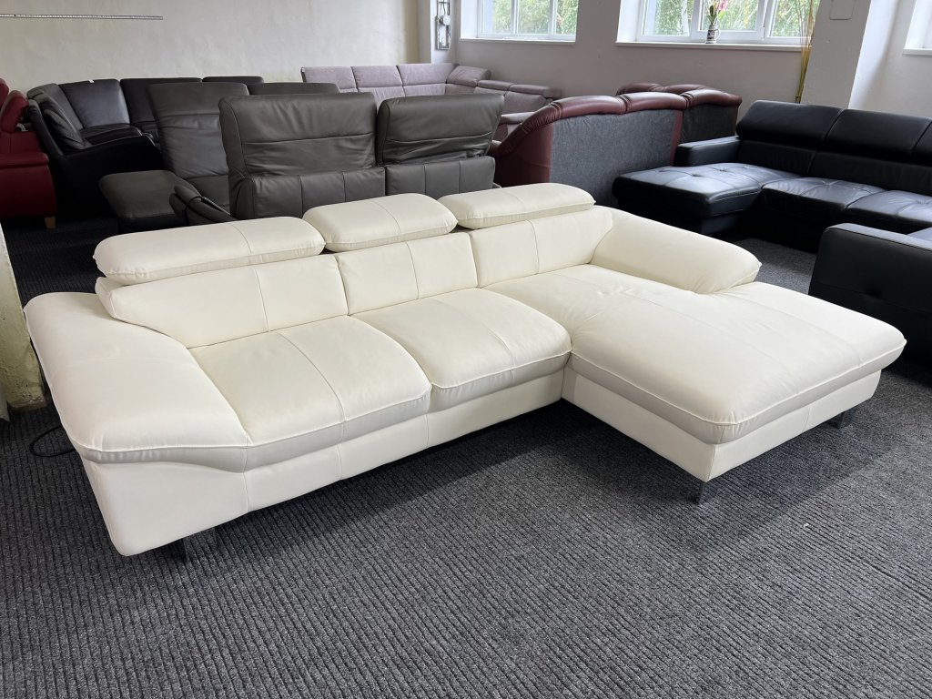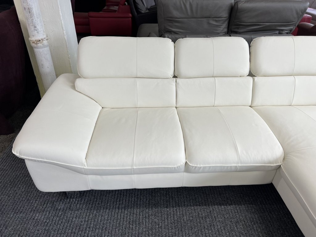 Rohová kožená sedací souprava v bílé barvě. Provedení není celočalouněné. Sedačka je vybavena polohovacími opěrkami hlavy. Stav nepoužitá.