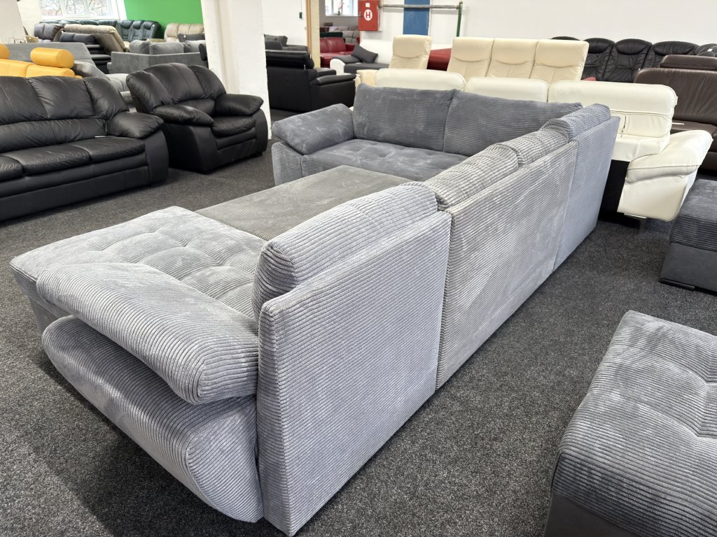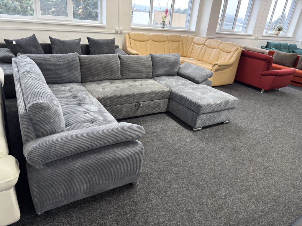 Sedací souprava do tvaru U, látková, manšestr, rozkládací, s úložným prostorem, celočalouněná, nepoužitá. Sedací souprava je řešena do tvaru U, tvořeného propojenými rovnými sedacími plochami. Jednotné šedé manšestrové provedení vytváří kompaktní vzhled. Boční opěrné plochy i sedací části navazují v pravidelných liniích.
