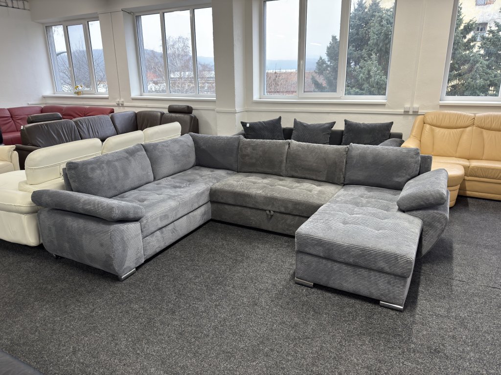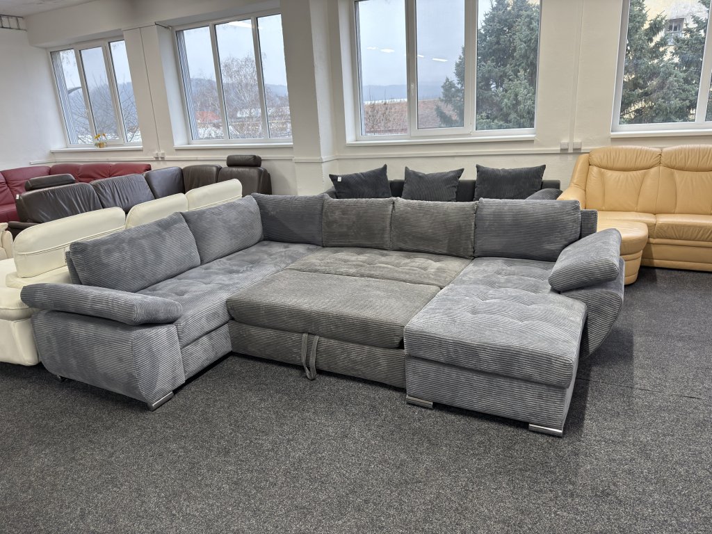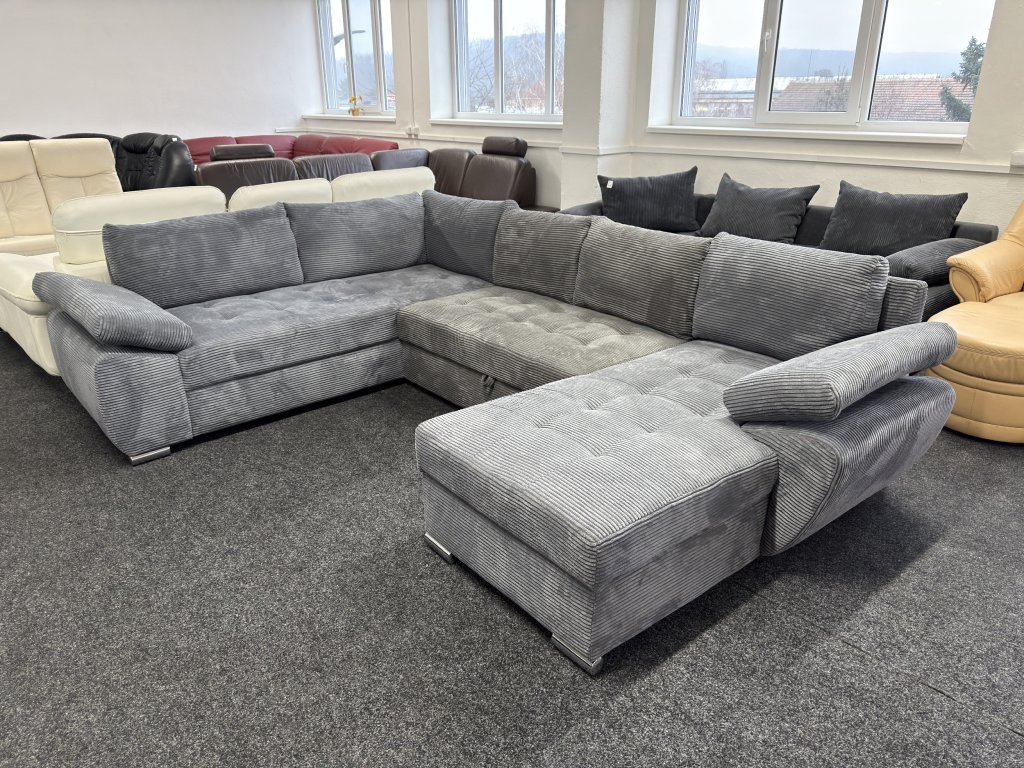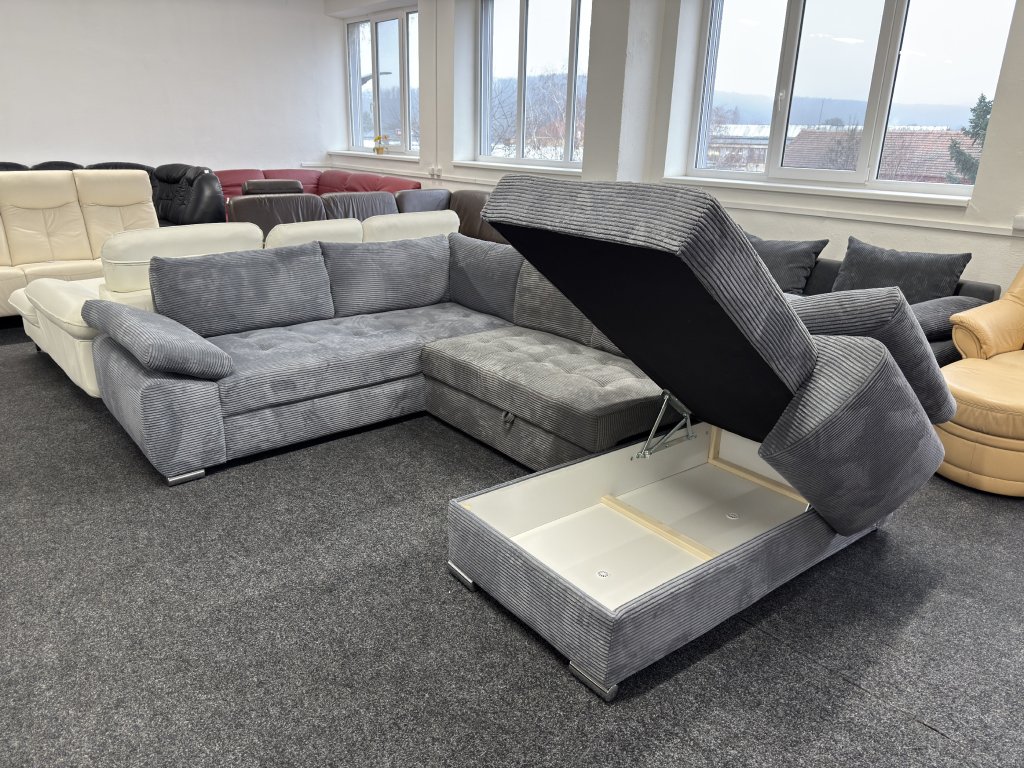 Sedací souprava do tvaru U v manšestrovém provedení nabízí rozkládací funkci, úložný prostor a jednotný tvarový koncept pro větší obytné prostory.