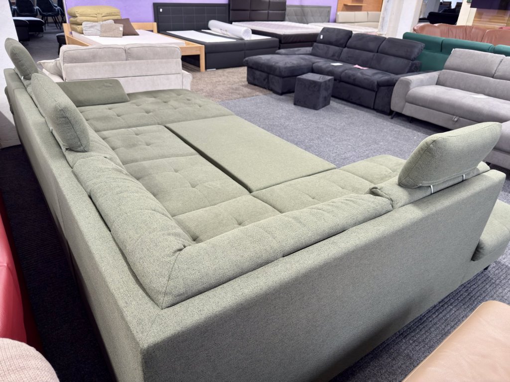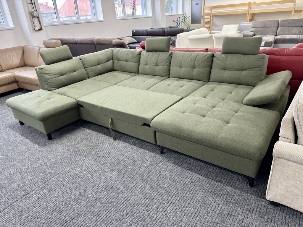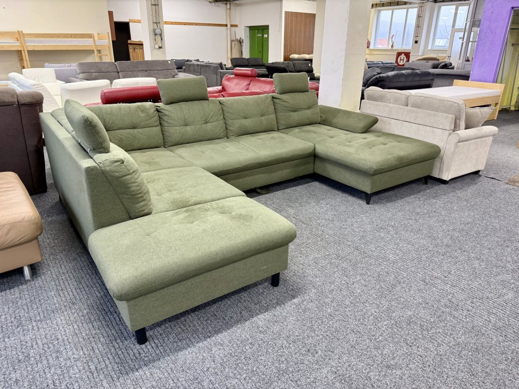 Sedací souprava do tvaru U je celočalouněné provedení s látkovým potahem. Model nabízí rozkládací funkci, polohovací područku a tři polohovací opěrky hlavy. Sedačka je nepoužitá.