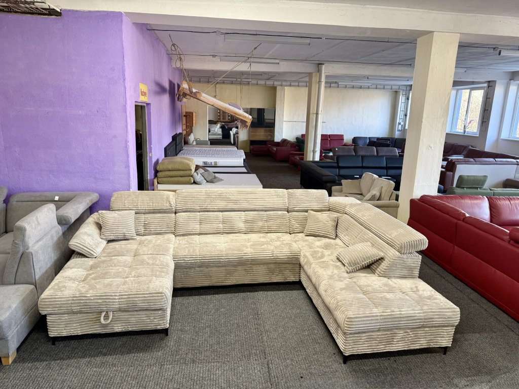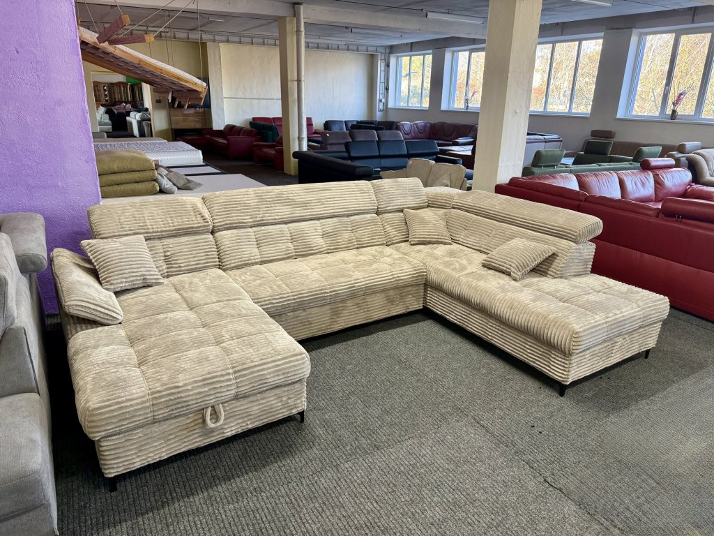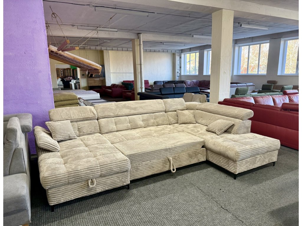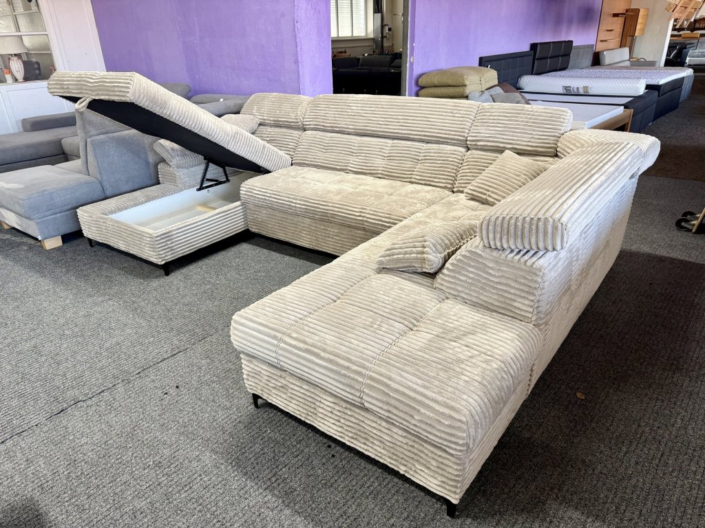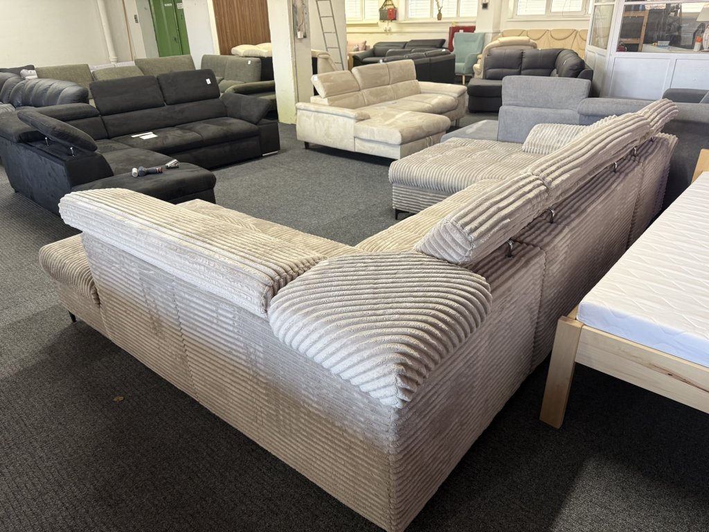 Sedací souprava ve tvaru U je celočalouněné provedení s látkovým potahem. Model je nepoužitý. Součástí jsou polohovací opěrky hlavy, polohovací područka, rozkládací funkce a integrovaný úložný prostor.