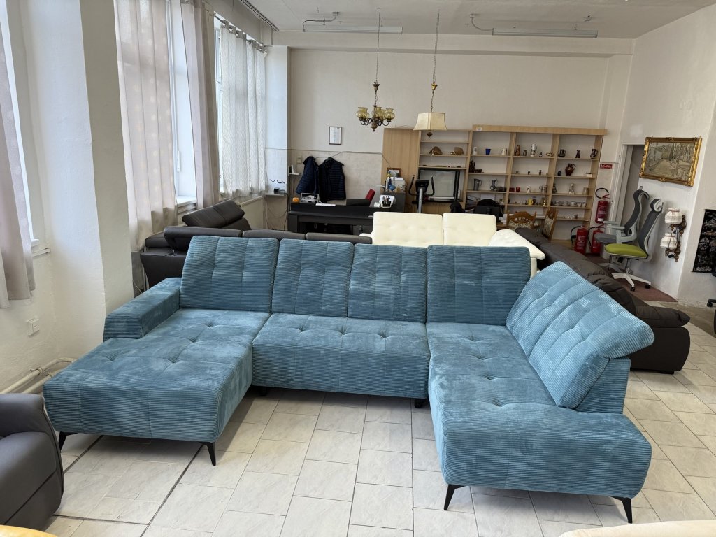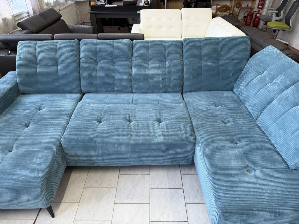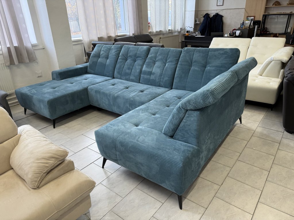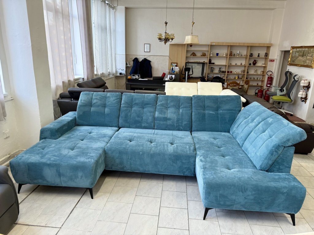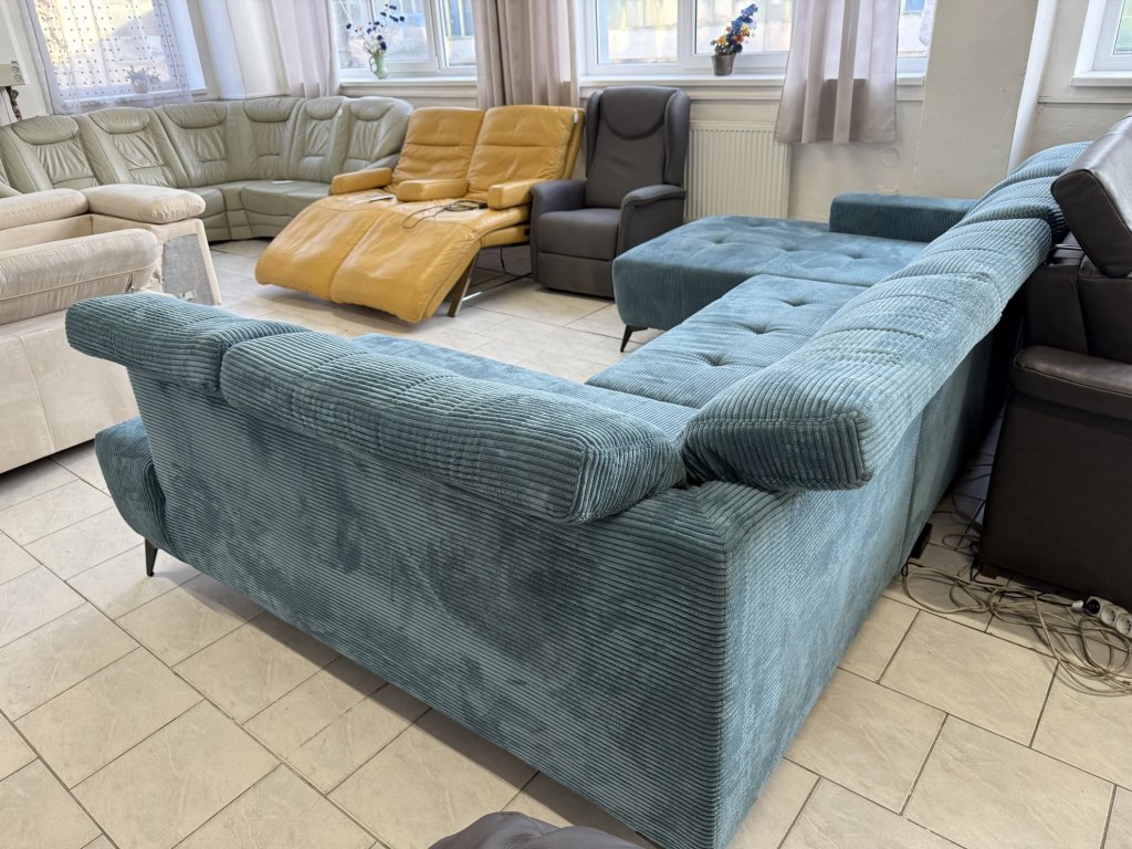Rohová sedací souprava ve tvaru U je celočalouněná a potažená strukturální látkou v odstínu modrozelené barvy. Nabízí elektrické rozkládání a polohovací opěrky hlavy. Souprava je nepoužitá.