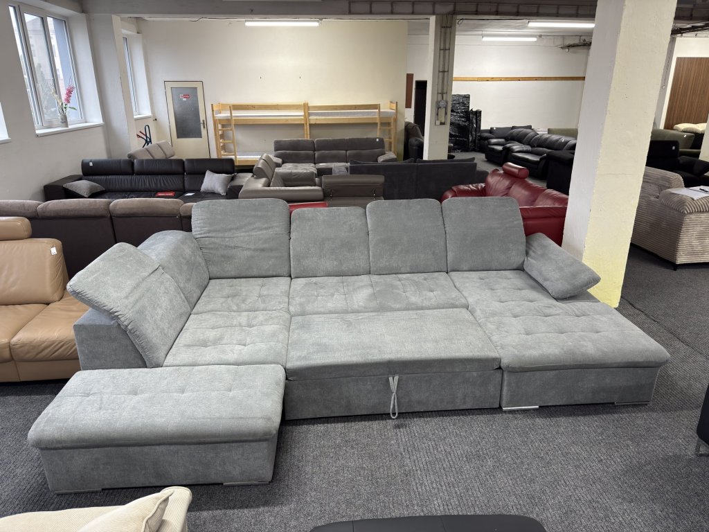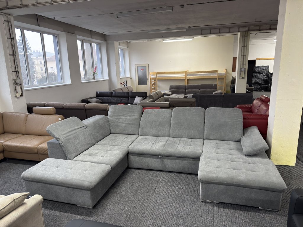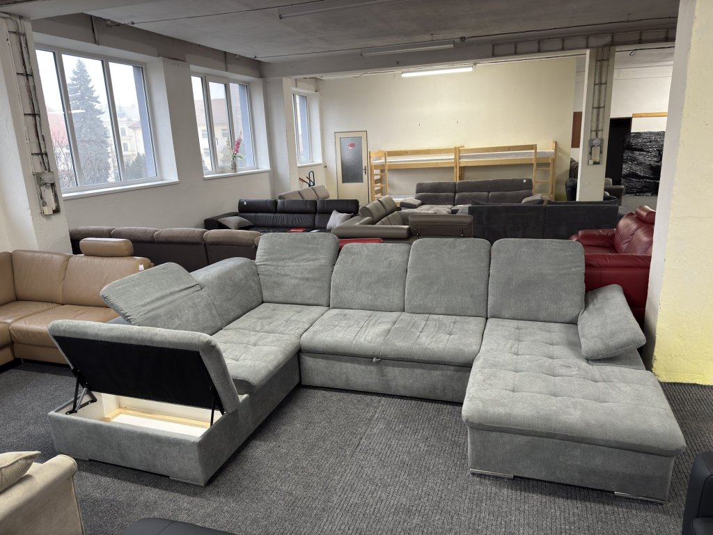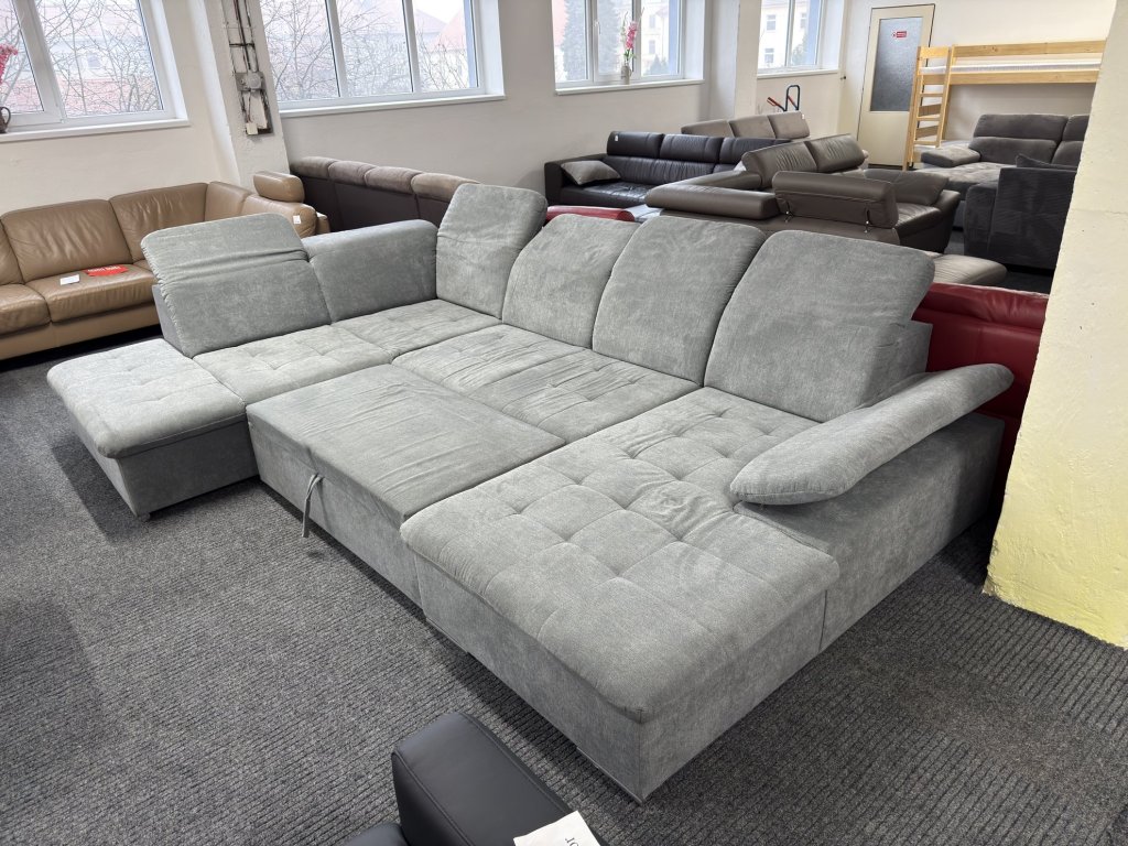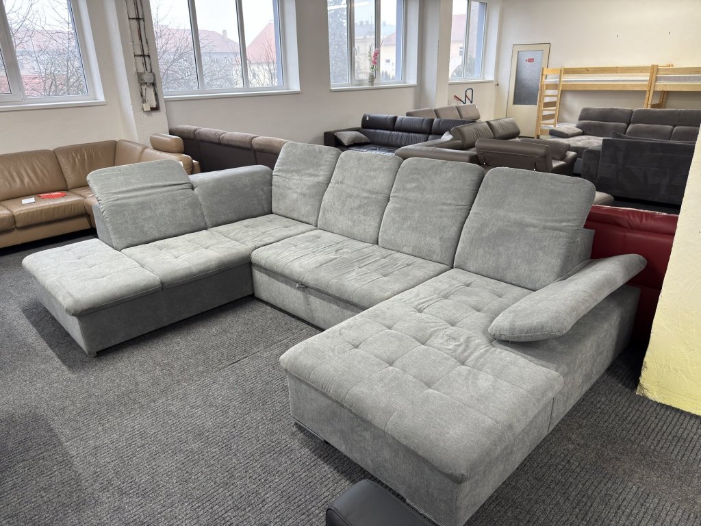 Sedací souprava ve tvaru U v látkovém celočalouněném provedení. Model je nepoužitý. Součástí je rozkládací funkce, malý úložný prostor, polohovací opěrky hlavy a polohovací područka.