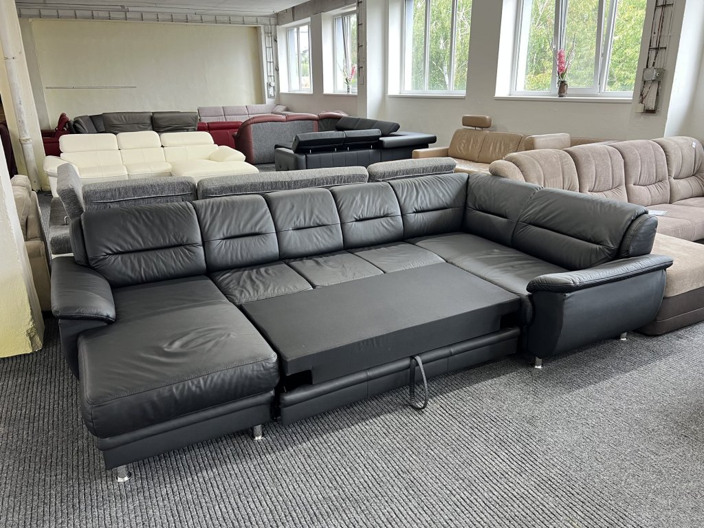 Sedací souprava ve tvaru U v celokoženém provedení, potažená pravou kůží v černé barvě. Souprava je vybavena rozkládací funkcí s plochou spaní.