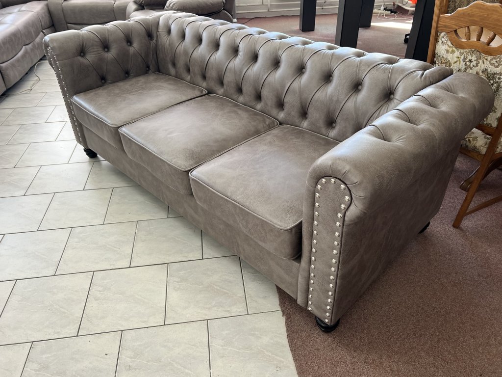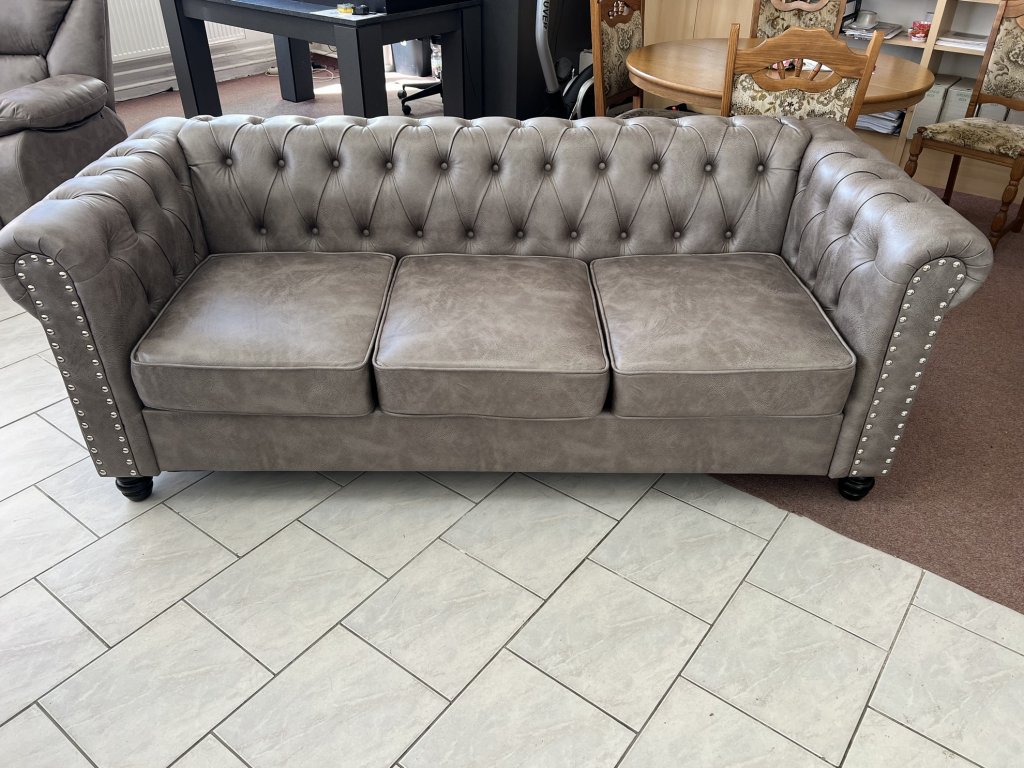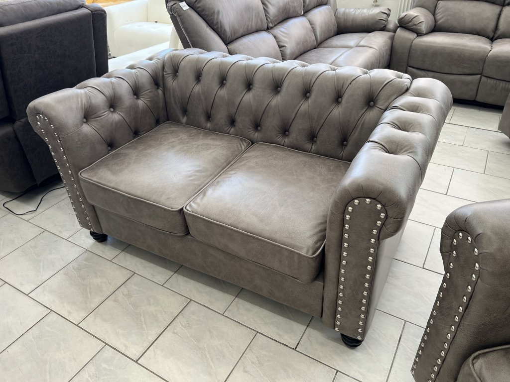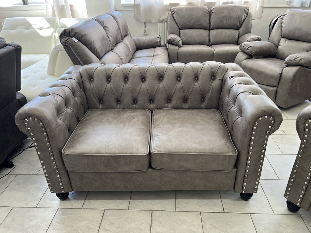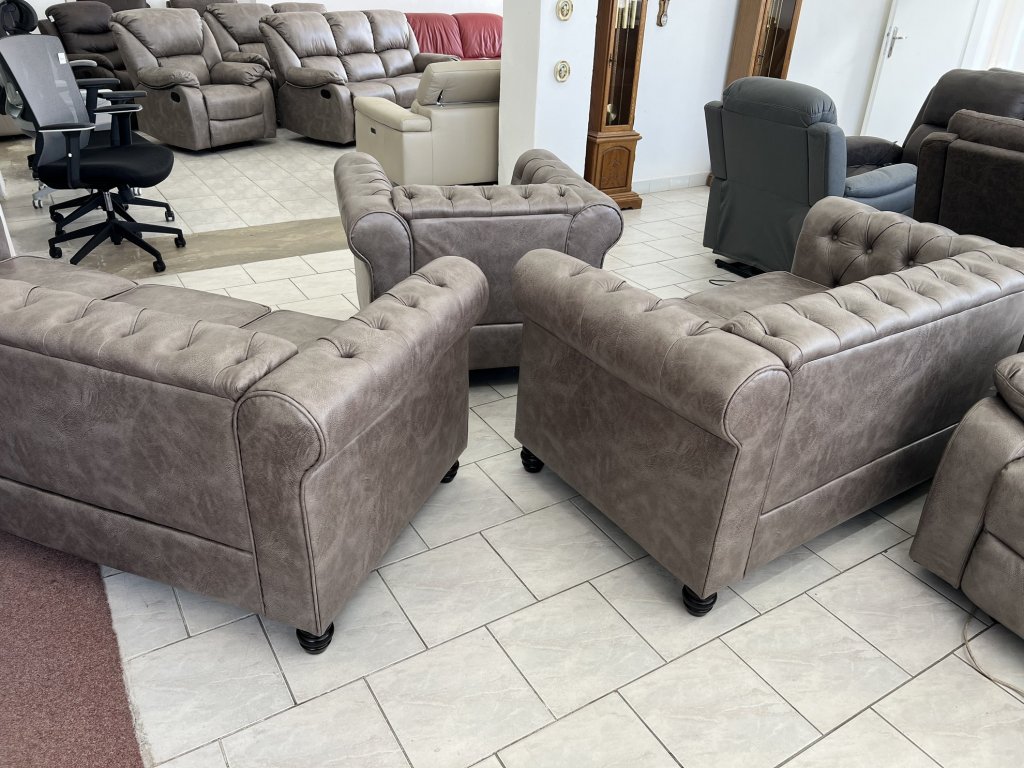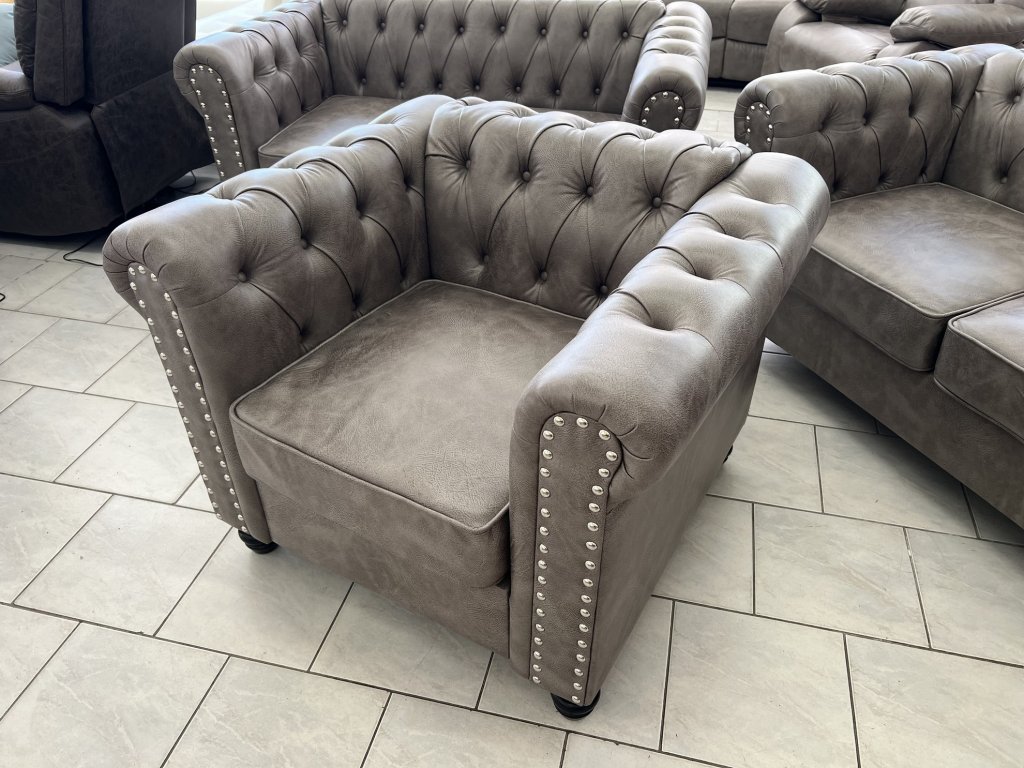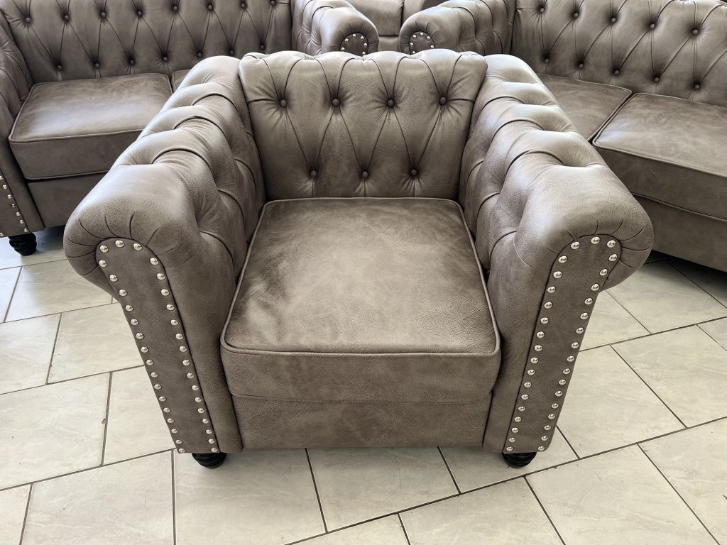 Klasické provedení s vysokými područkami a hlubokým sedákem. Opěradla a područky zdobí pravidelné prošívání s čalounickými knoflíky. Na přední straně područek jsou dekorativní kovové cvočky.