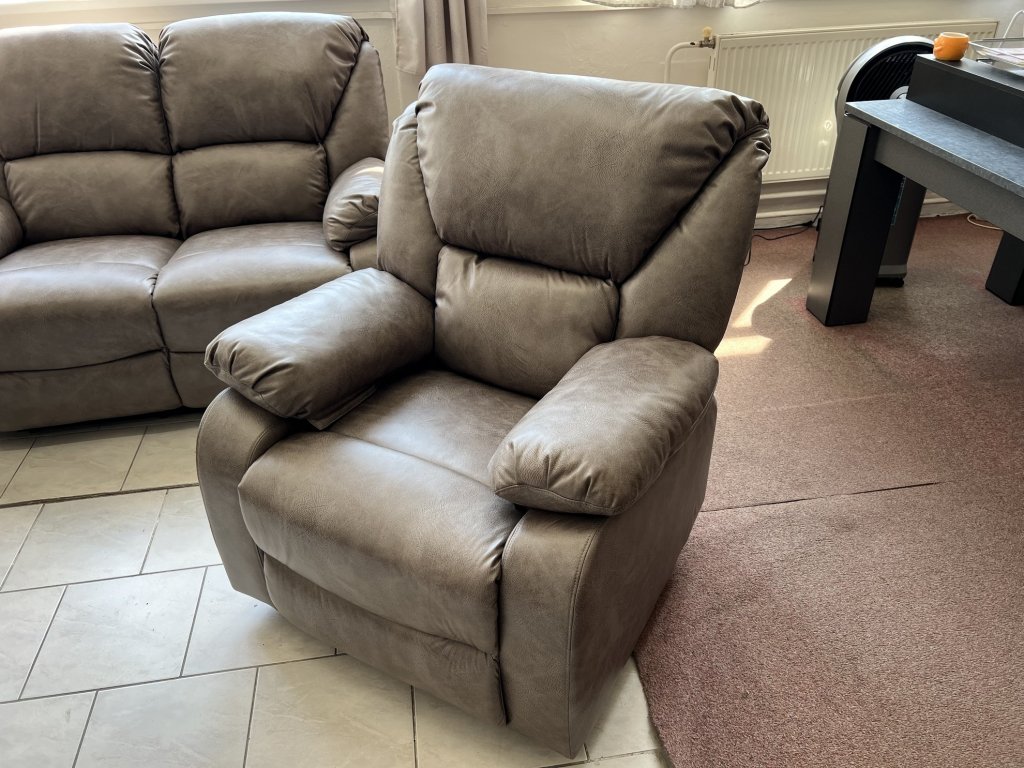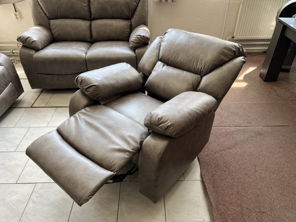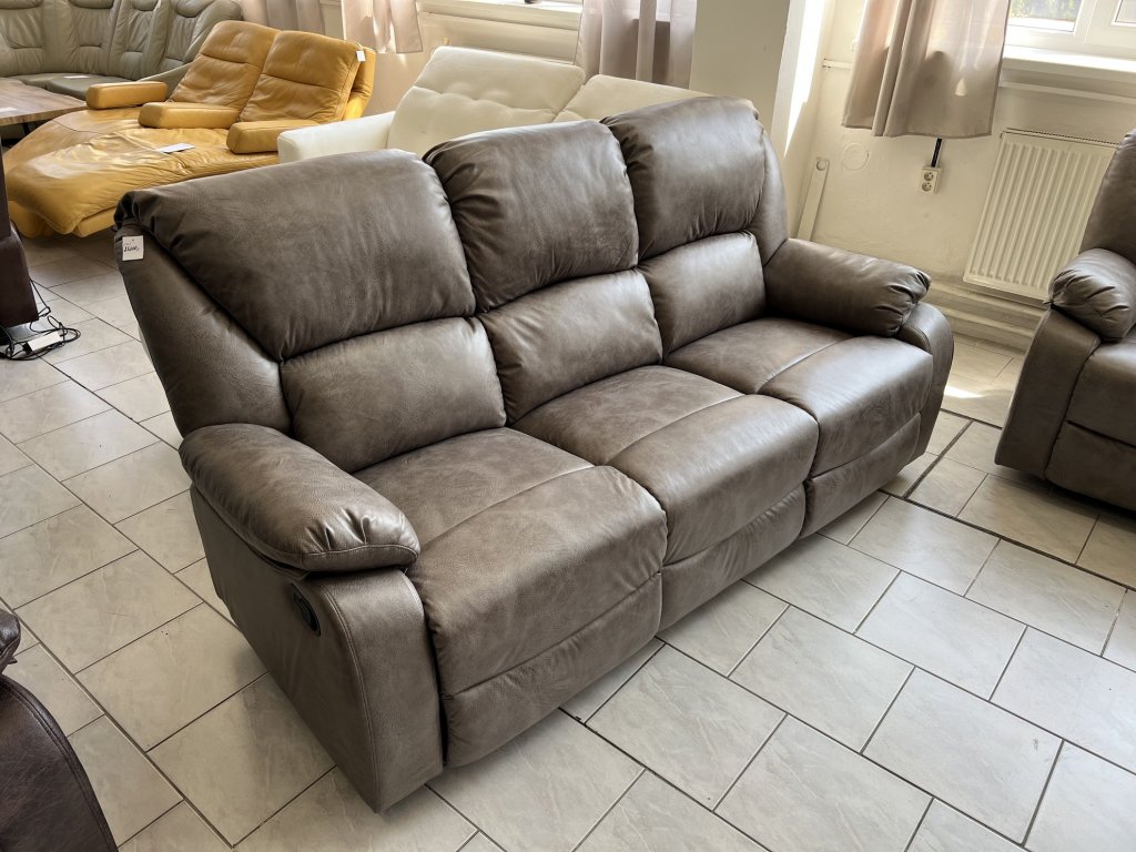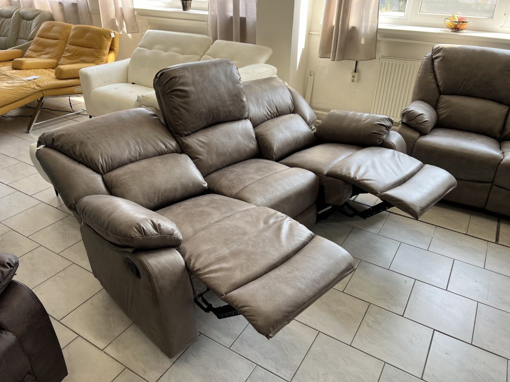 Sestava čalouněného nábytku v konfiguraci trojmístné, dvoumístné pohovky a jednoho křesla. Všechny části jsou celočalouněné a vybaveny manuálním polohovacím mechanismem. Nepoužitý kus.