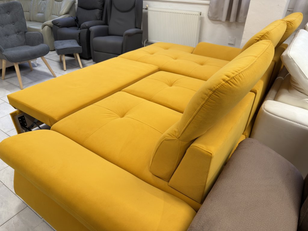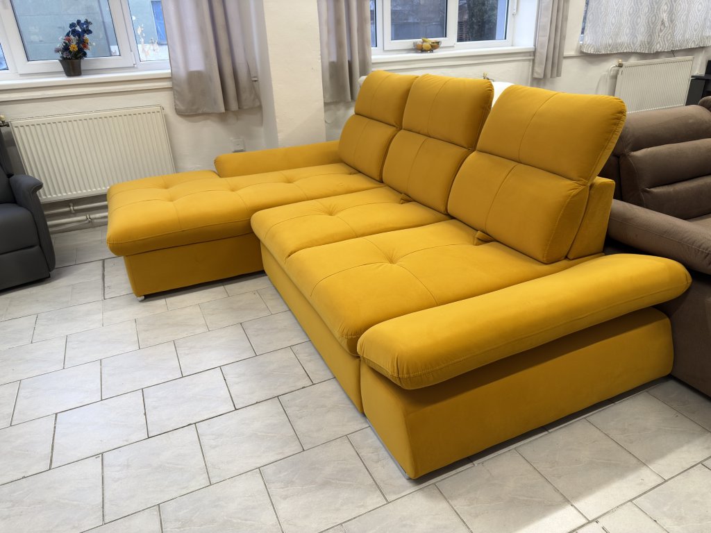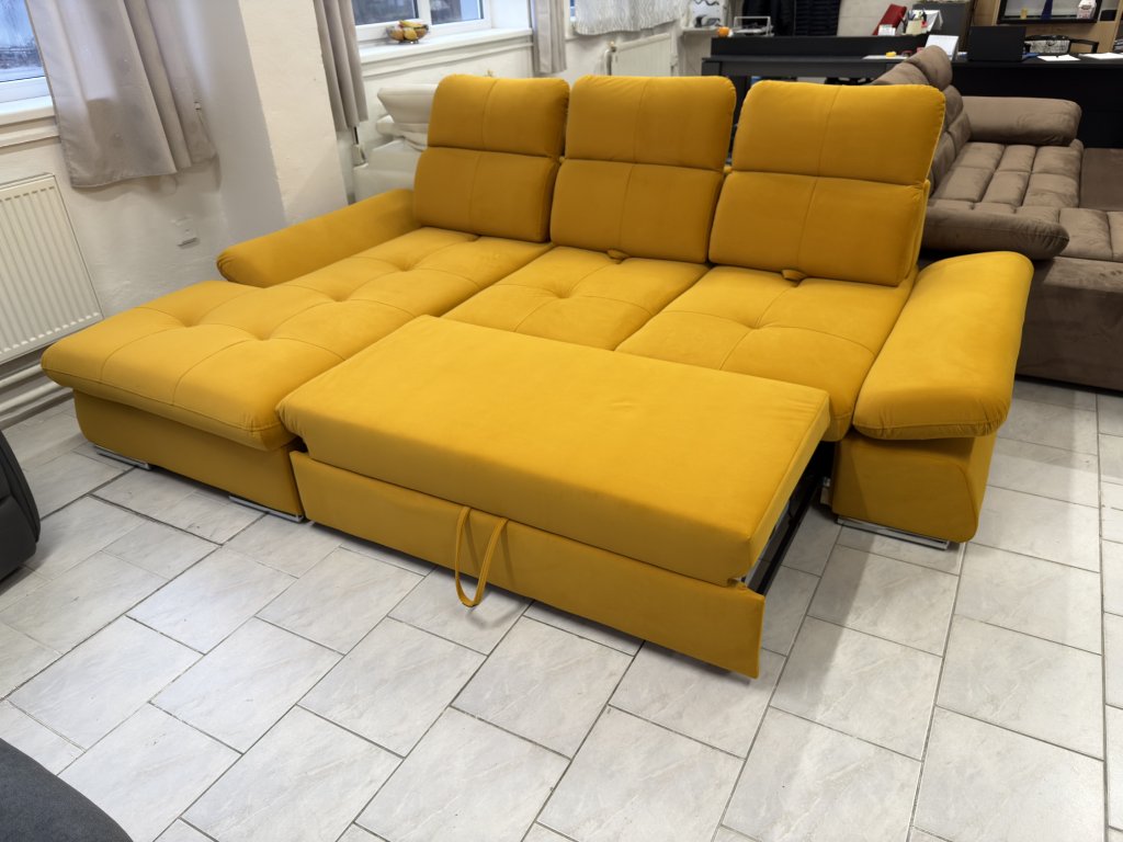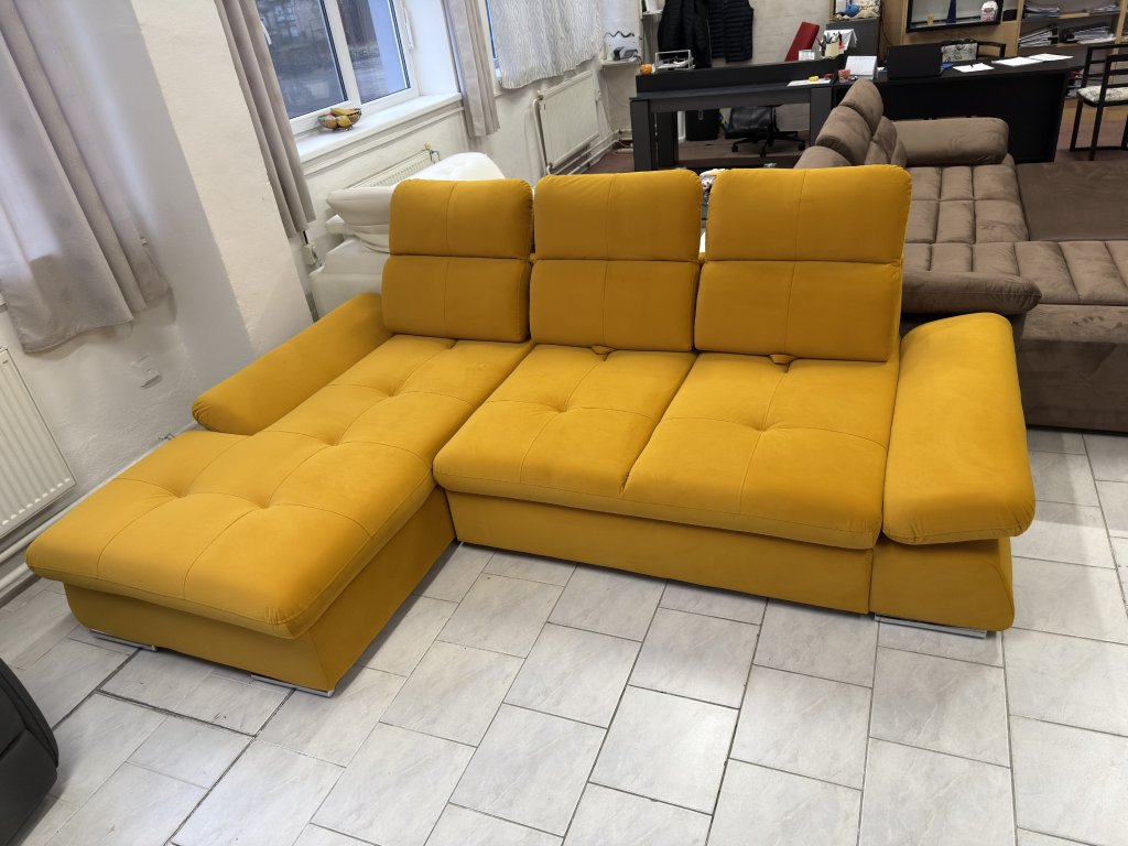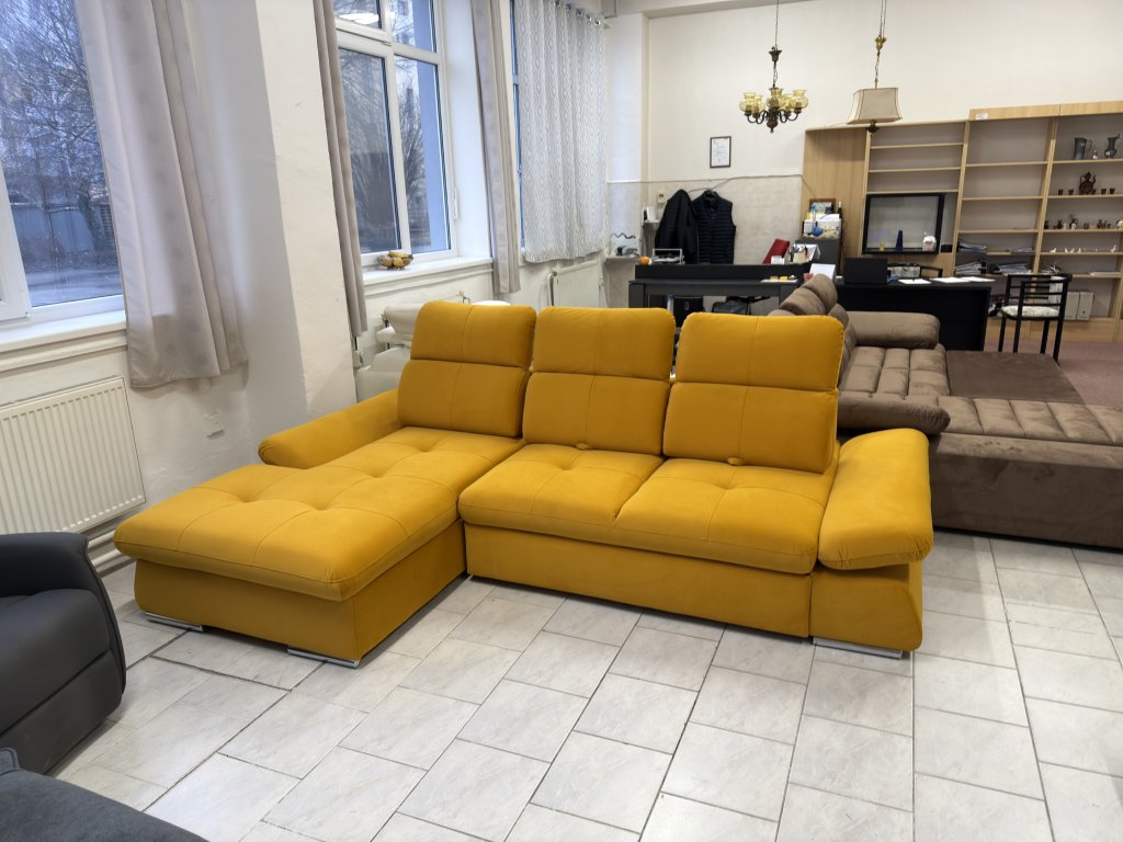 Rohová sedací souprava v látkovém provedení s rozšířenou funkční výbavou. Konstrukce do tvaru L je doplněna o posuvná záda, polohovací opěrky hlavy a polohovatelné područky, které umožňují variabilní nastavení hloubky sedu i celkového komfortu. Souprava je nepoužitá.