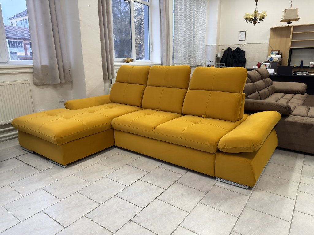 Rohová sedací souprava v látkovém provedení s rozšířenou funkční výbavou. Konstrukce do tvaru L je doplněna o posuvná záda, polohovací opěrky hlavy a polohovatelné područky, které umožňují variabilní nastavení hloubky sedu i celkového komfortu. Souprava je nepoužitá, pochází z výstavního kusu.