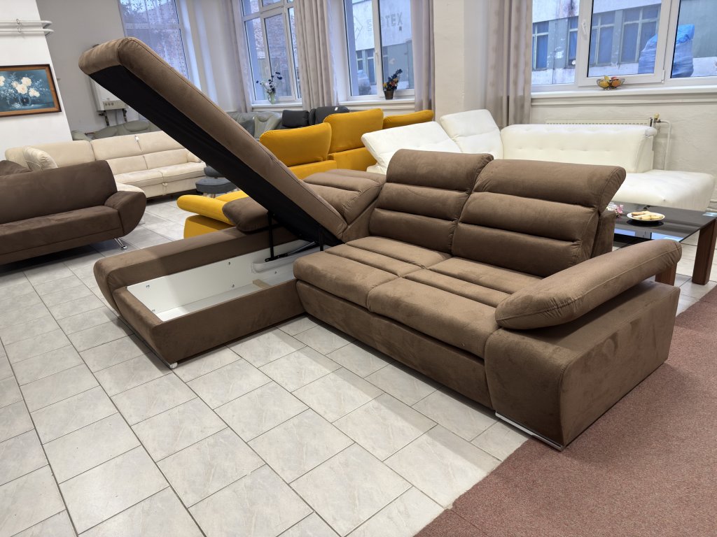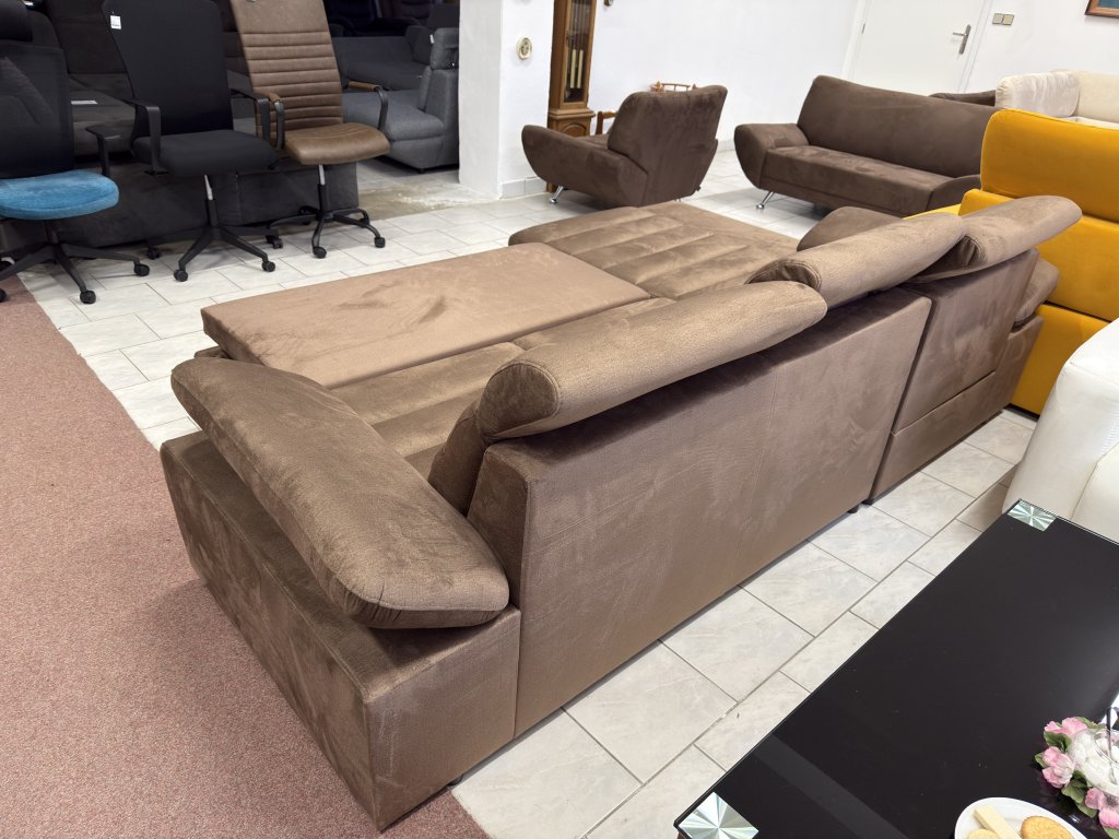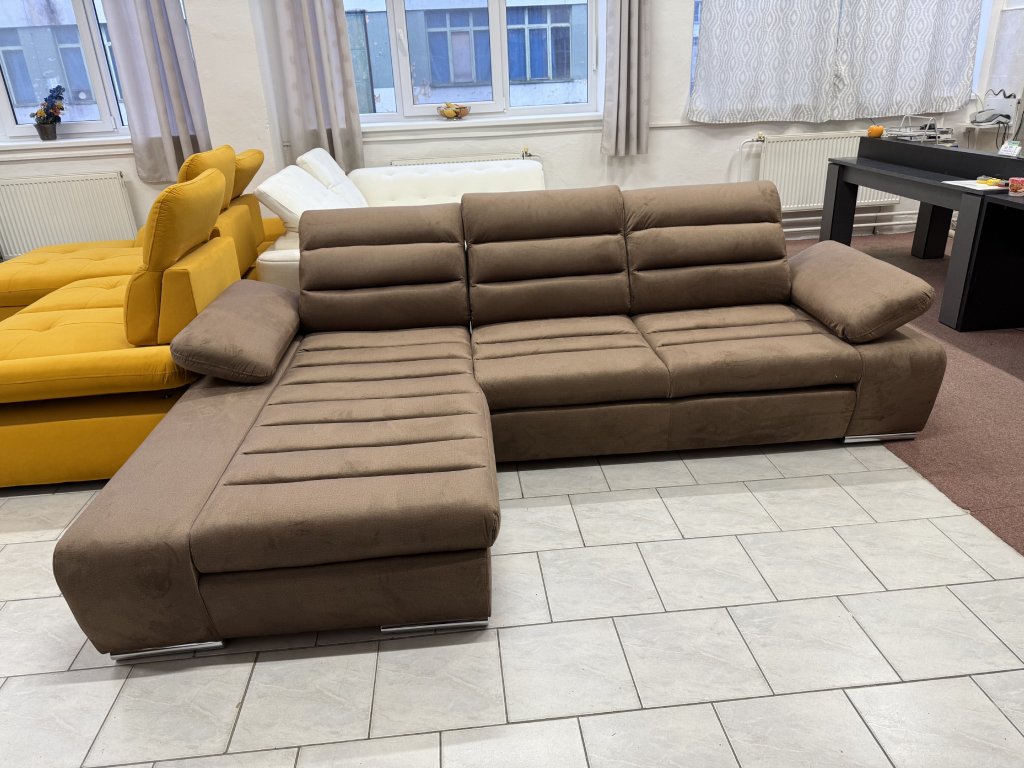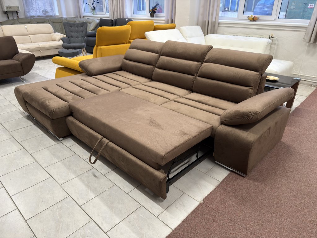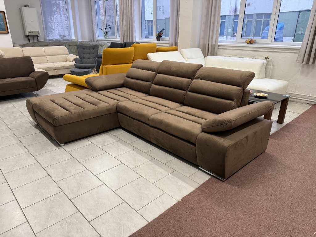 Rohová sedací souprava v látkovém provedení určená pro každodenní sezení i příležitostné spaní. Konstrukce do tvaru L umožňuje efektivní využití prostoru v obývacím pokoji. Souprava je nepoužitá .
