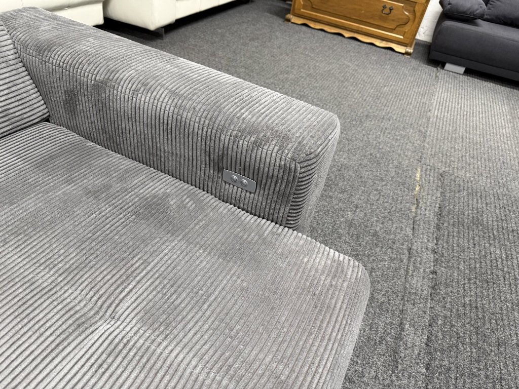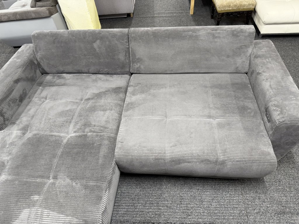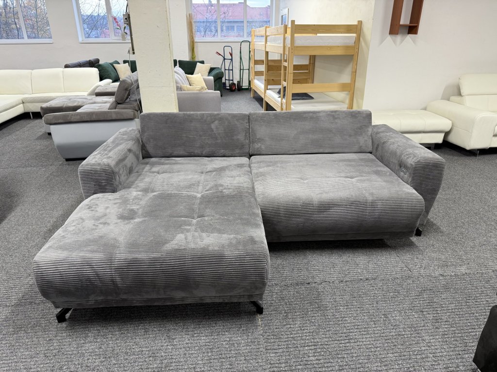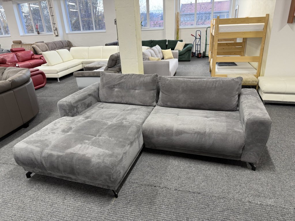 Rohová sedací souprava v levém provedení potažená měkkou strukturovanou látkou typu manšestr v šedém odstínu. Souprava je celočalouněná a vybavená funkcí elektrického rozkladu pro vytvoření spací plochy.