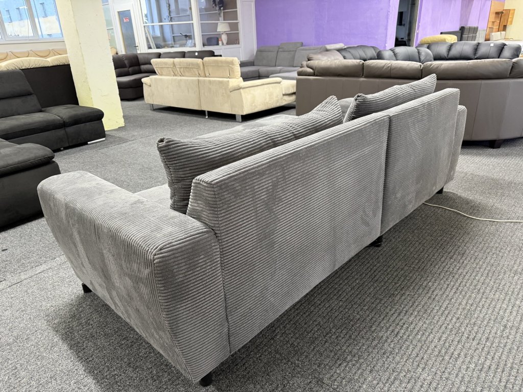 Jednoduché moderní linie doplněné o nízké černé kovové nožky. Potah tvoří příjemná látka s výraznou strukturou manšestru v šedé barvě.