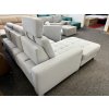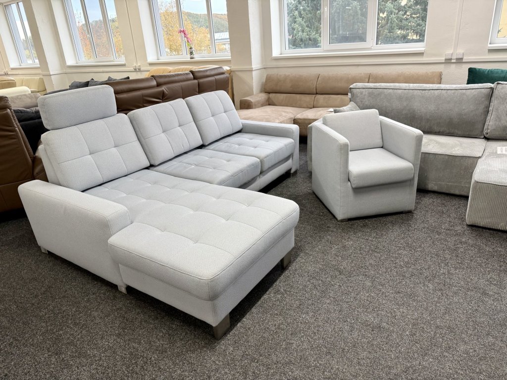 Rohová sedací souprava s křeslem v moderním stylu a světlém odstínu látky. Čisté linie, prošívané sedáky a nastavitelné opěrky hlavy vytvářejí elegantní a praktický celek vhodný do moderních interiérů.