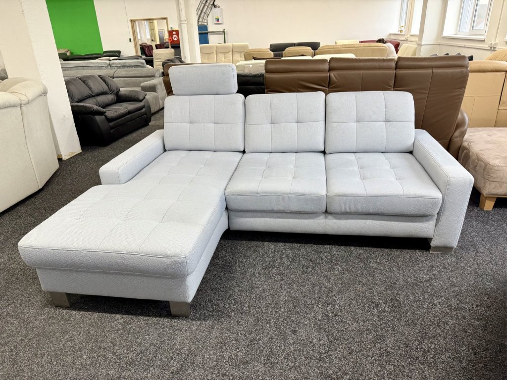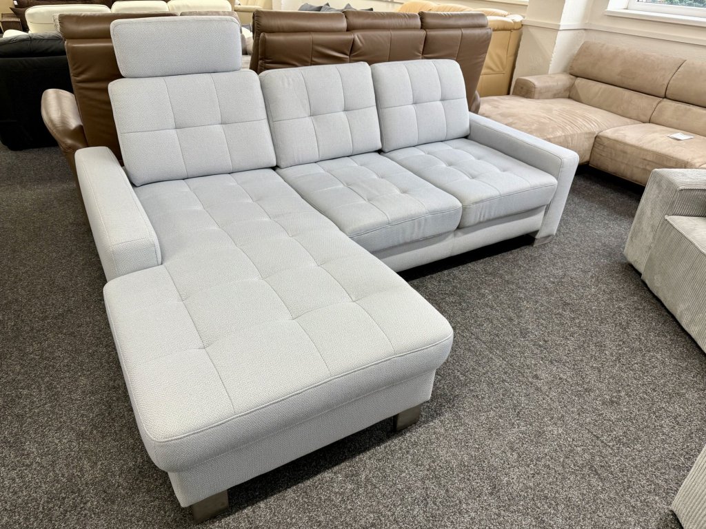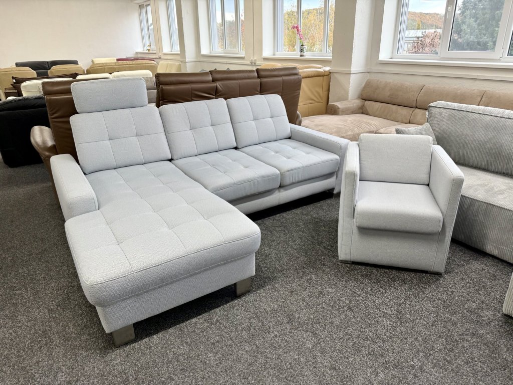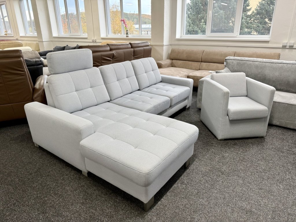 Rohová sedací souprava s křeslem v moderním stylu a světlém odstínu látky. Čisté linie, prošívané sedáky a nastavitelné opěrky hlavy vytvářejí elegantní a praktický celek vhodný do moderních interiérů.