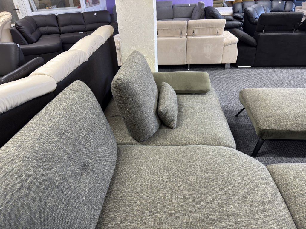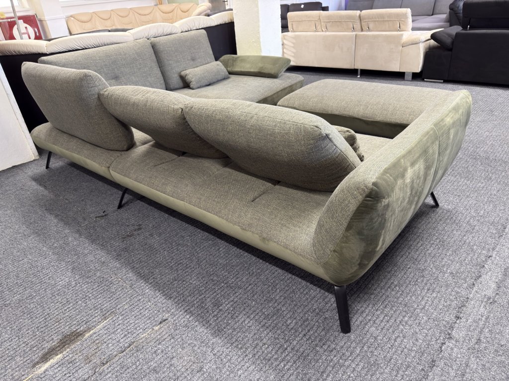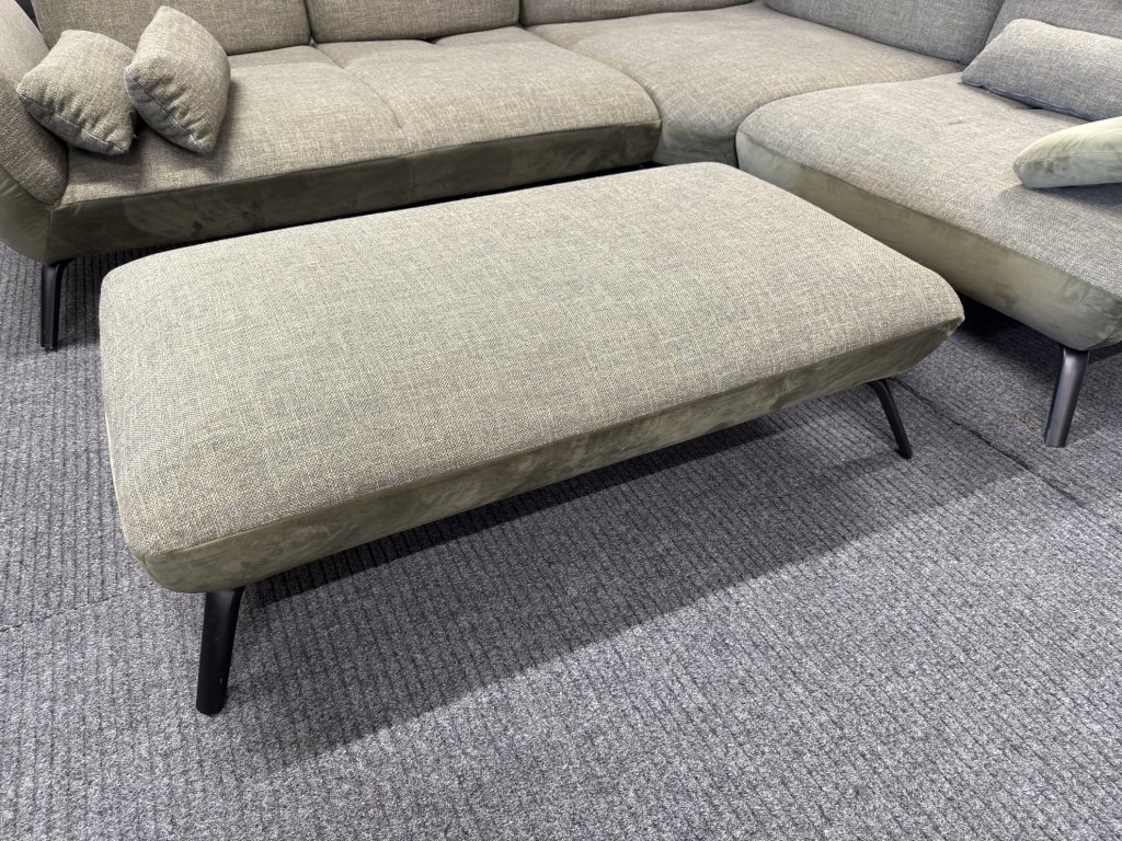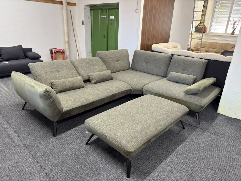 Rohová sedací souprava v látkovém provedení včetně samostatného taburetu. Souprava je celočalouněná a nepoužitá. Záda jsou posuvná a polohovací, područka je rovněž polohovací. Taburet má samostatnou plochu 80 × 140 cm.