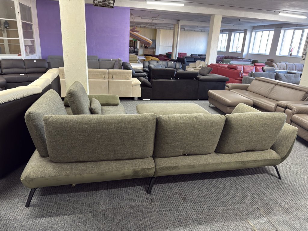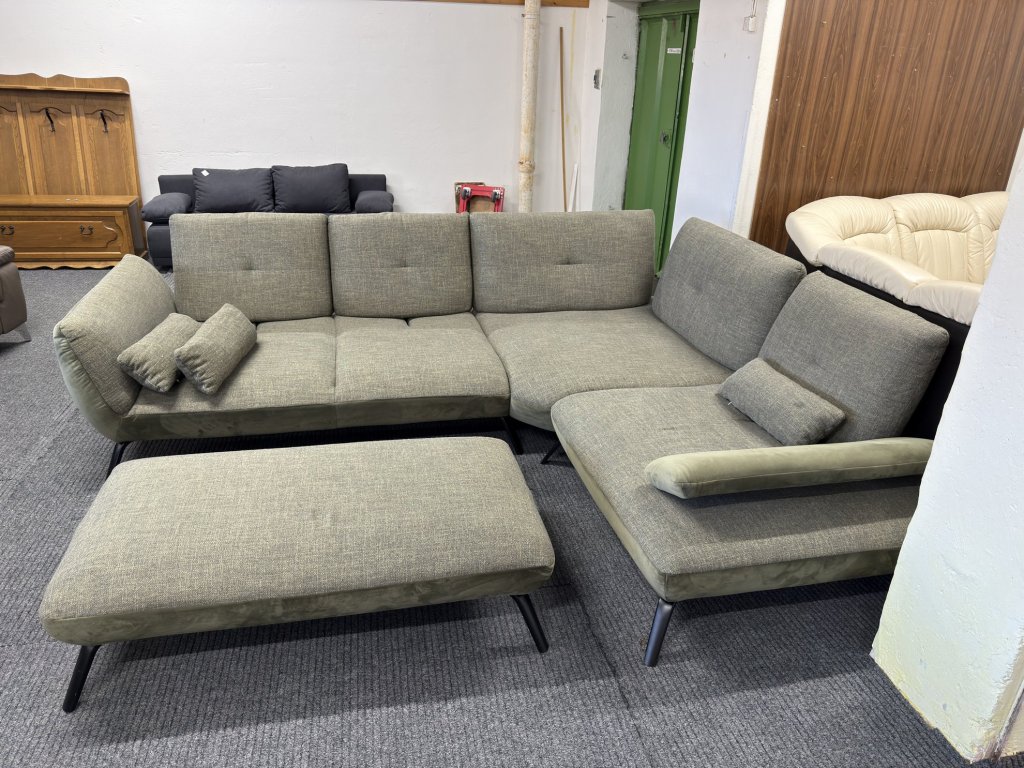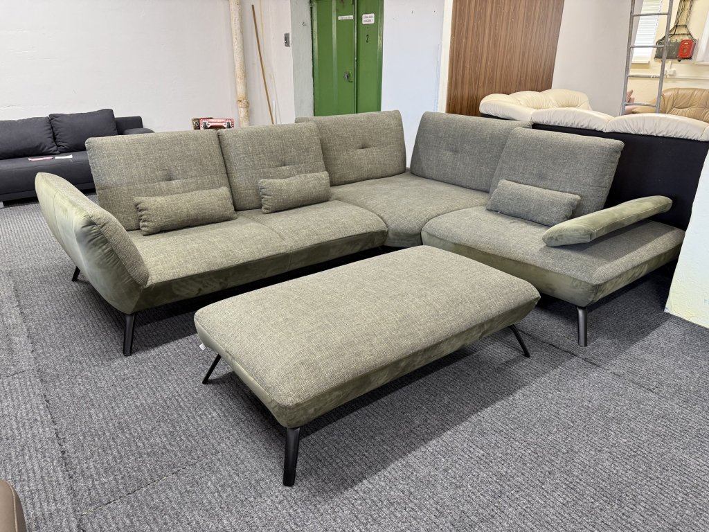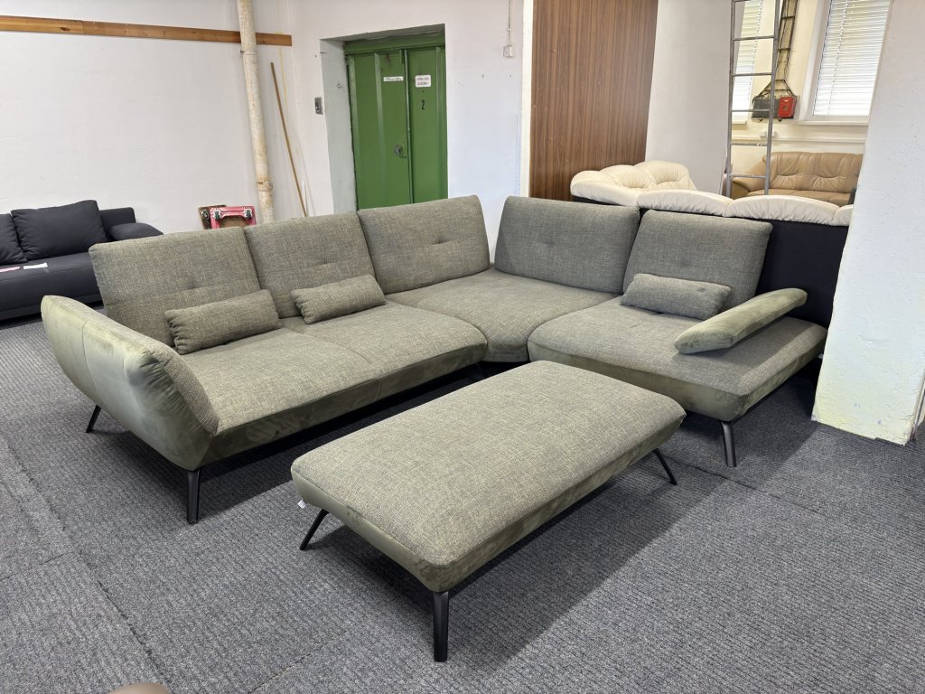 Rohová sedací souprava v látkovém provedení včetně samostatného taburetu. Souprava je celočalouněná a nepoužitá. Záda jsou posuvná a polohovací, područka je rovněž polohovací. Taburet má samostatnou plochu 80 × 140 cm.