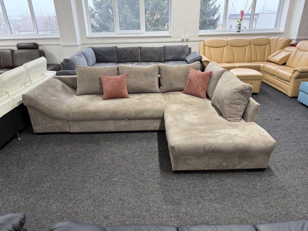 Rohová sedací souprava v látkovém provedení je rozkládací, s velkou plochou pro spaní. Konstrukce je celočalouněná, souprava je nepoužitá.