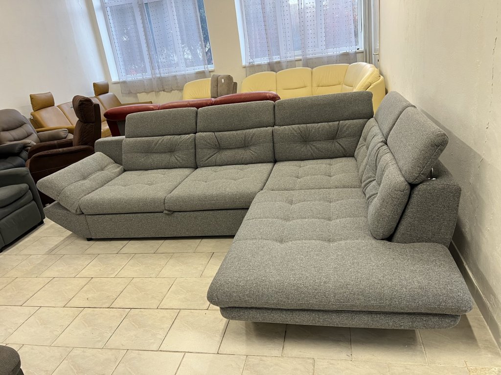 Sedací souprava rohová, rozkládací, látková, s polohovacími opěrkami hlavy a područkou – nepoužitá