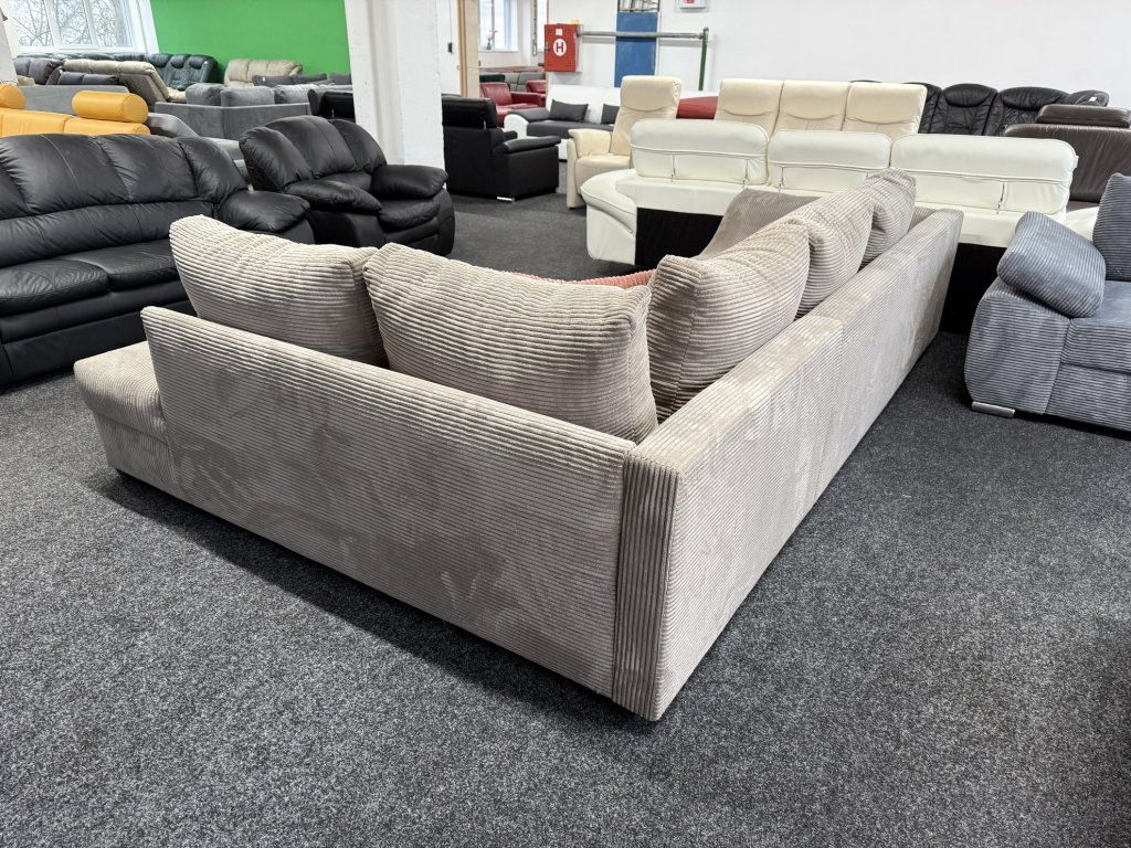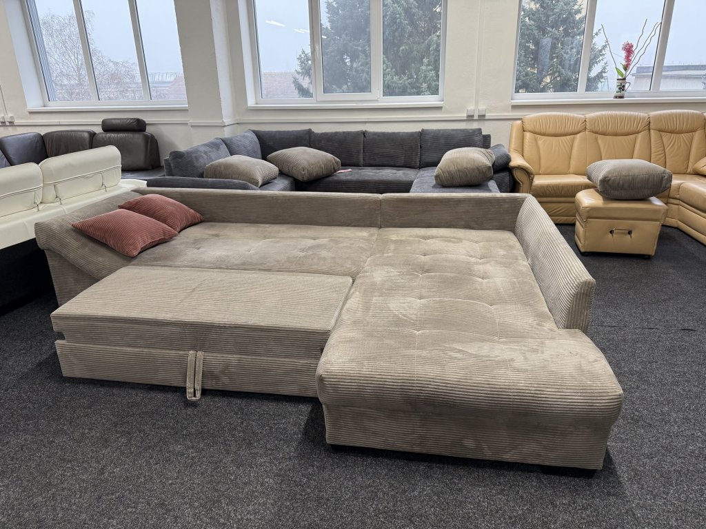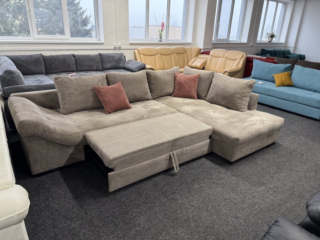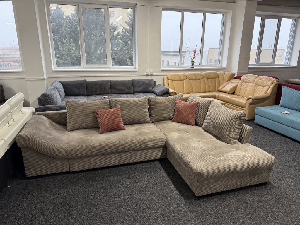 Rohová sedací souprava v látkovém provedení je rozkládací, s velkou plochou pro spaní. Konstrukce je celočalouněná, souprava je nepoužitá.