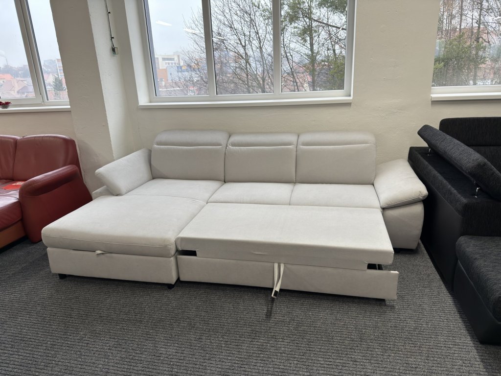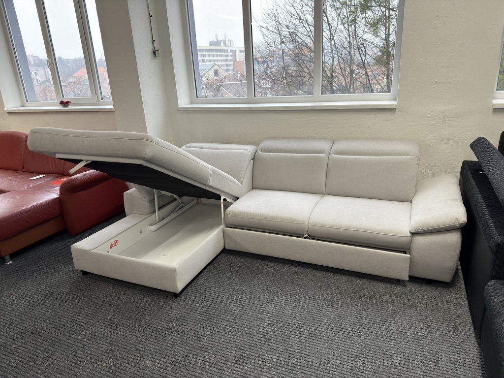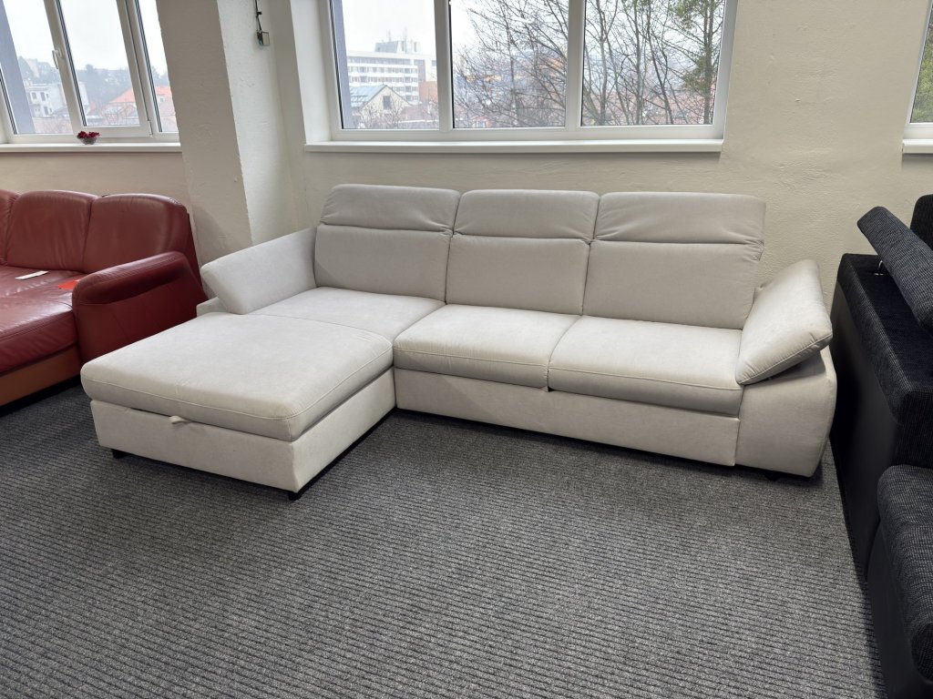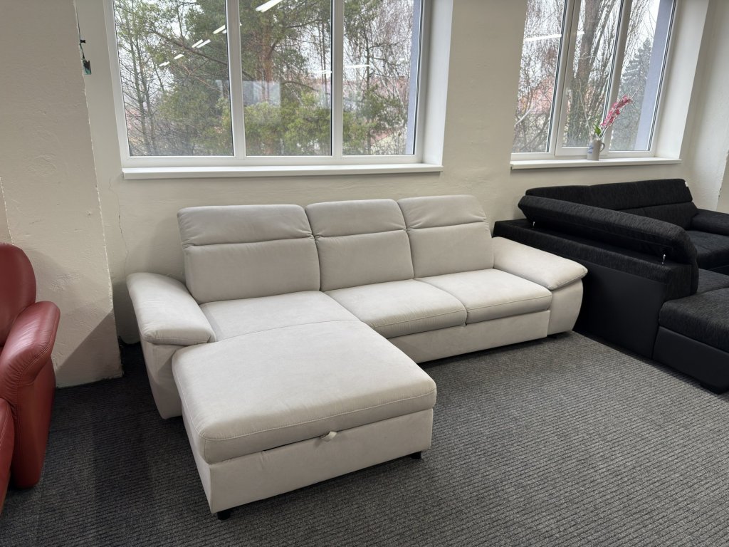 Rohová sedací souprava v látkovém, celočalouněném provedení. Nabízí funkci rozkladu, úložný prostor, polohovací opěrky hlavy a polohovací područky. Souprava je nepoužitá. Konstrukce je řešena jako pravý roh.