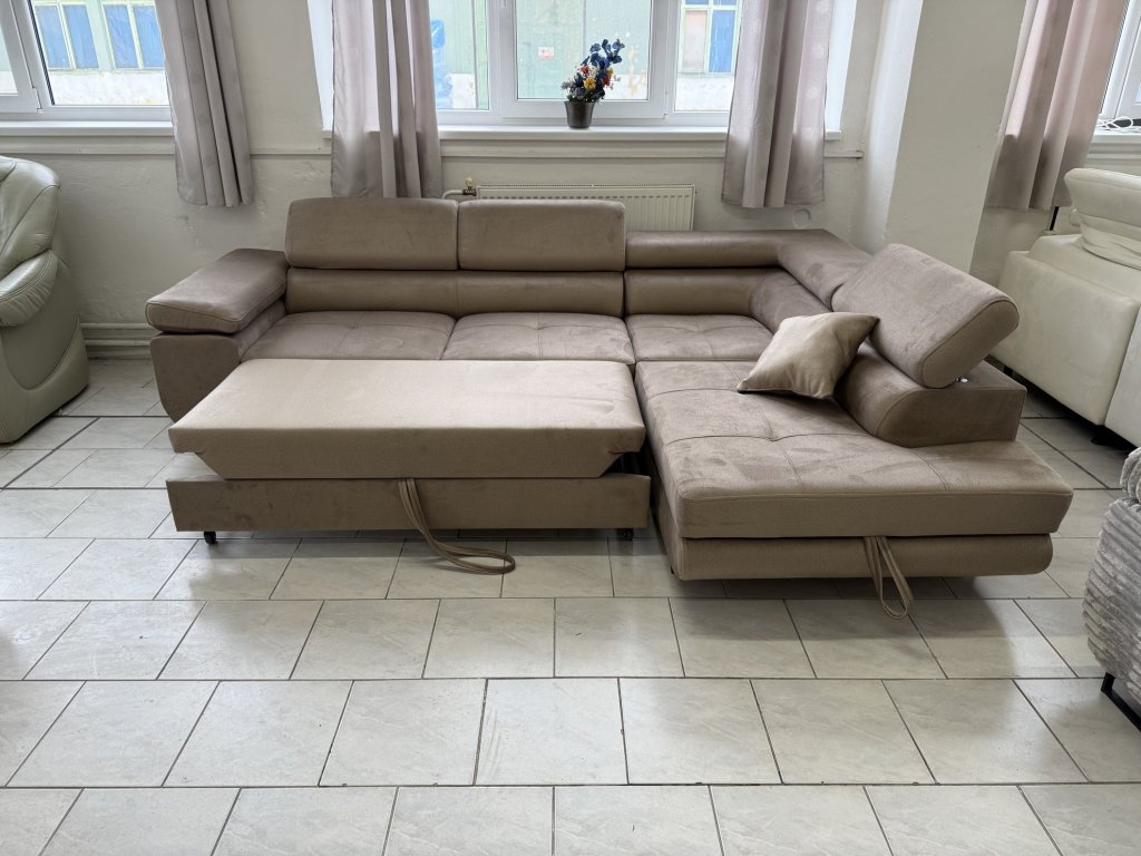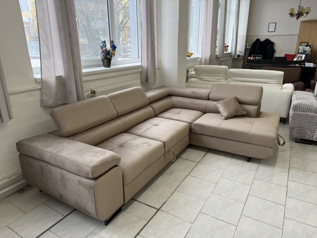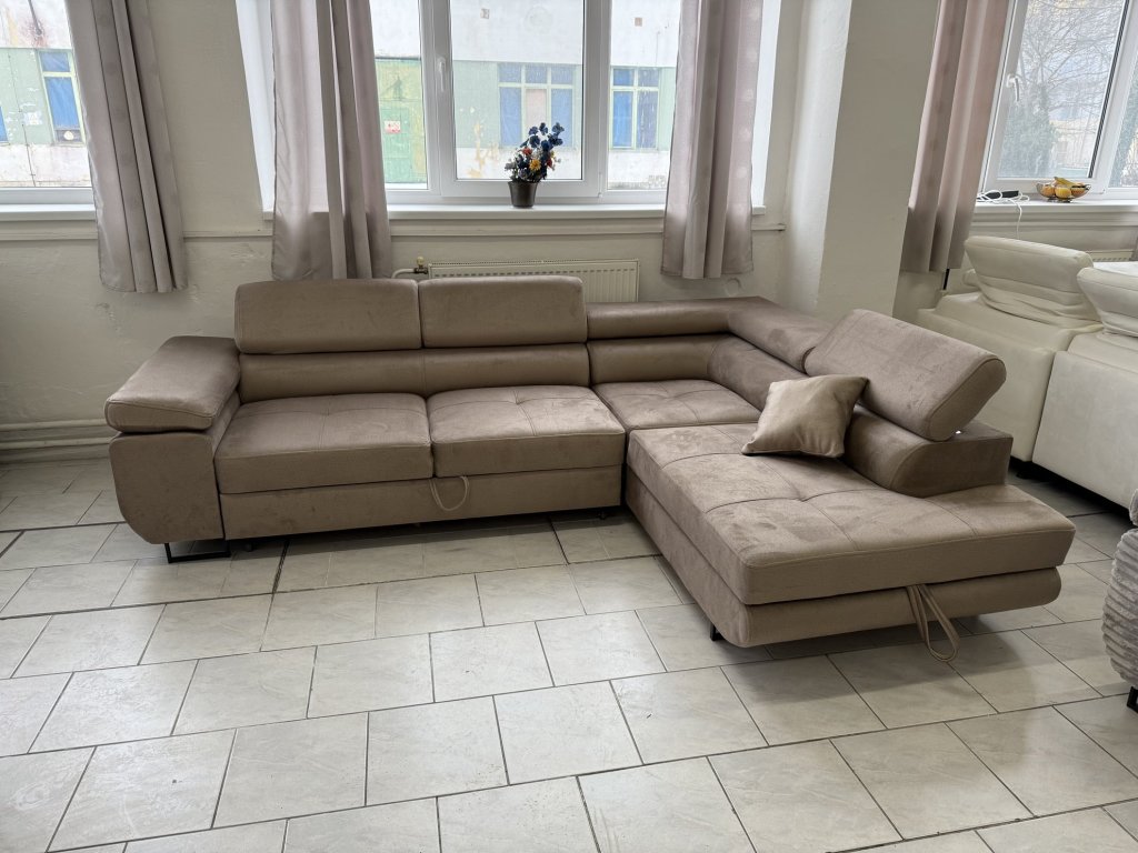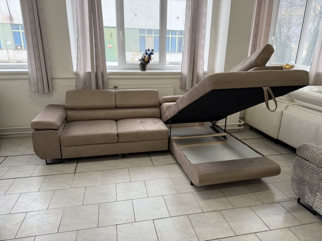 Rohová sedací souprava v látkovém provedení, celočalouněná ze všech stran. Souprava je vybavena rozkládací funkcí pro příležitostné spaní, úložným prostorem a polohovacími opěrkami hlavy. Stav nepoužitá.