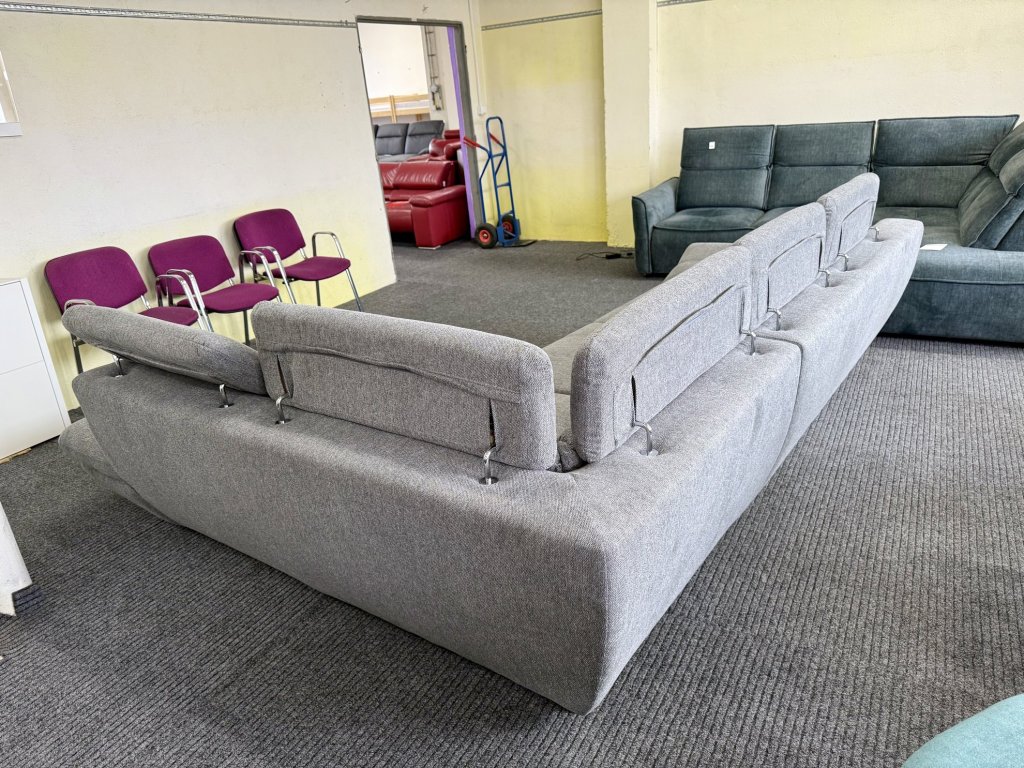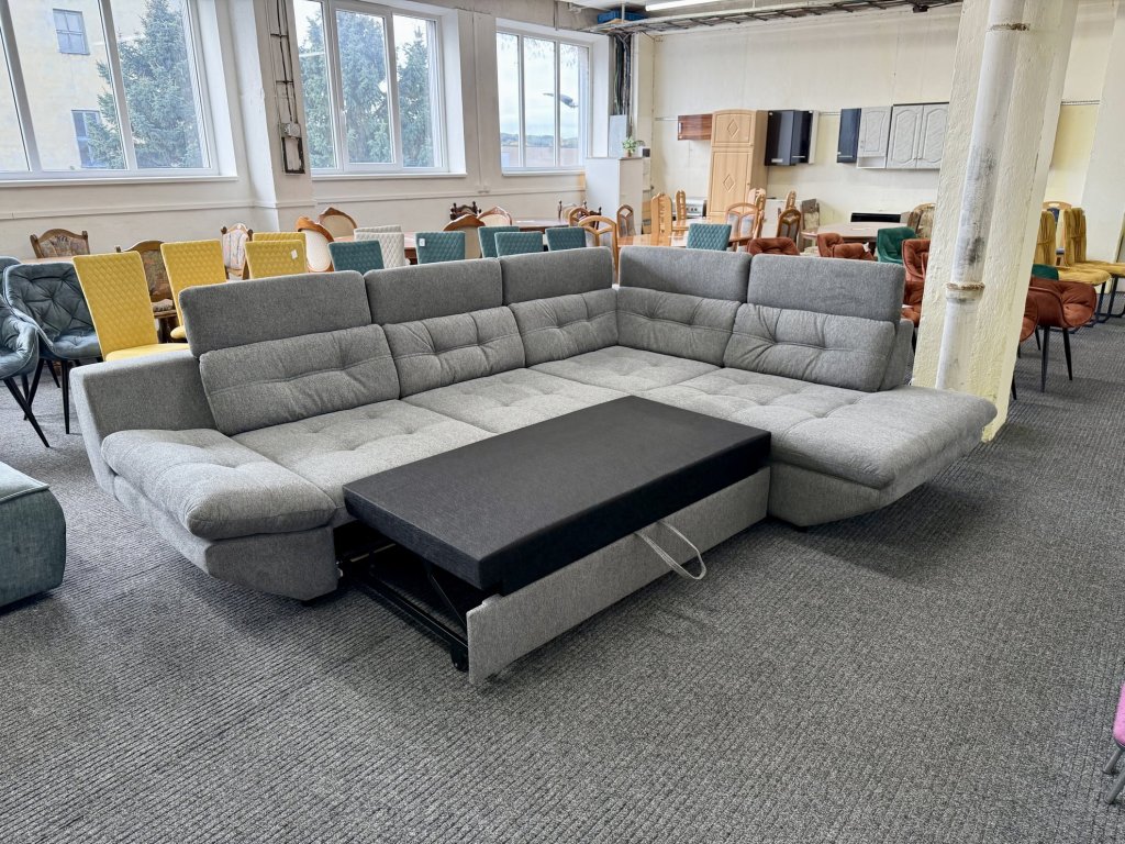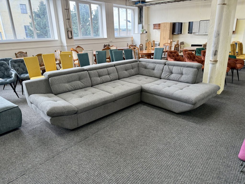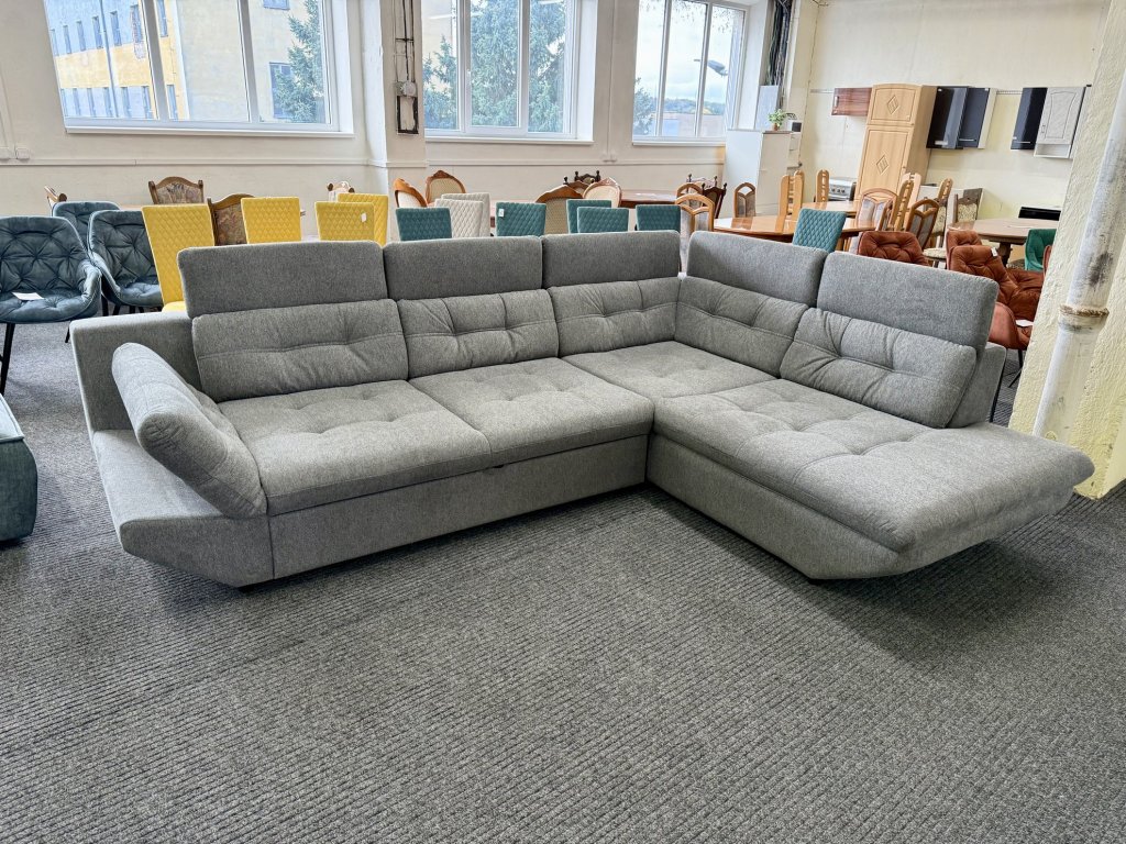 Rohová sedací souprava v látkovém provedení je celočalouněná a nabízí možnost rozložení pro příležitostné spaní. Součástí jsou polohovací opěrky hlavy a nastavitelná područka. Sedačka je nepoužitá.