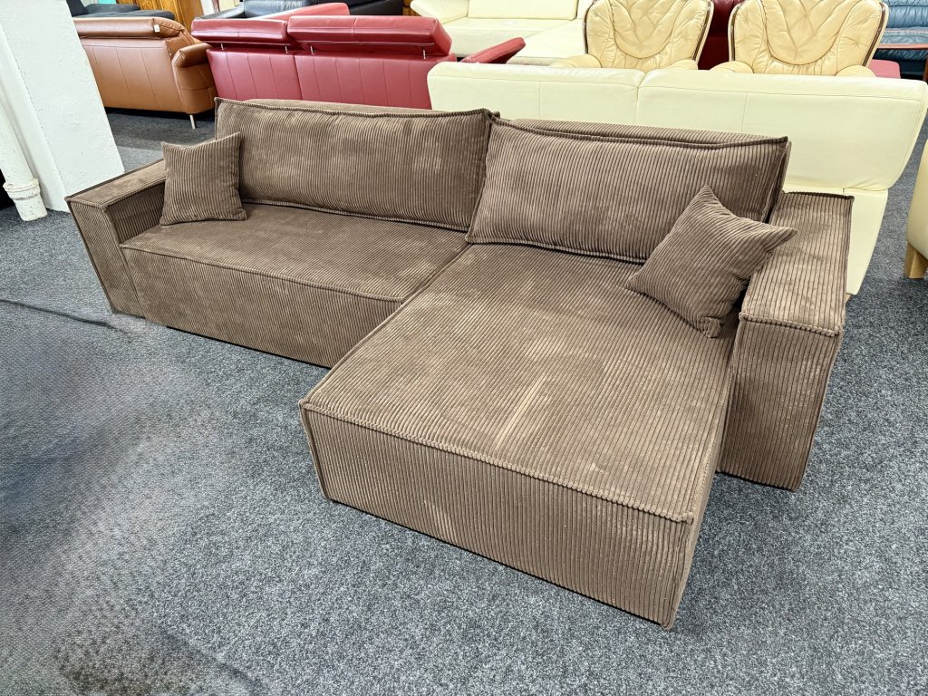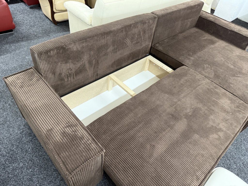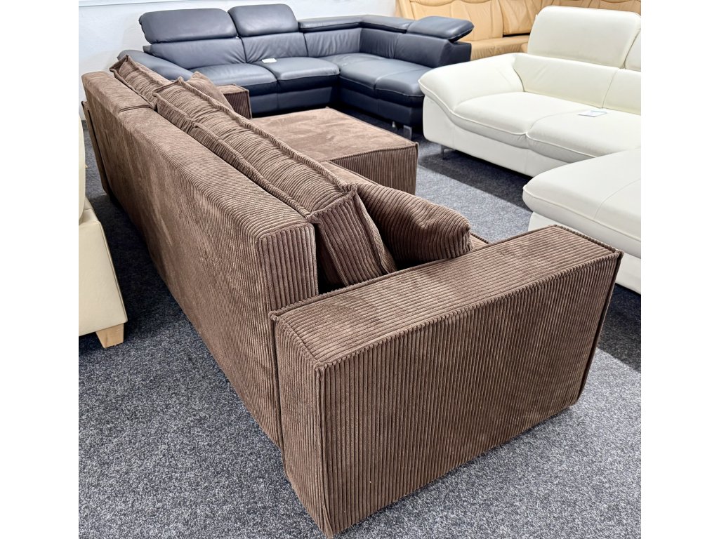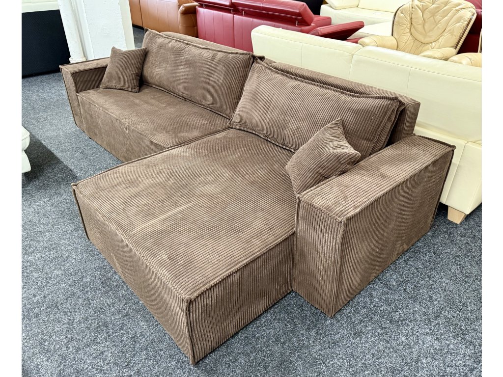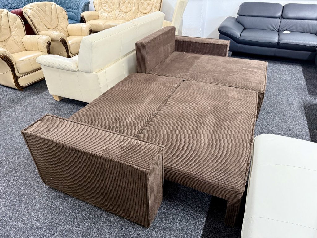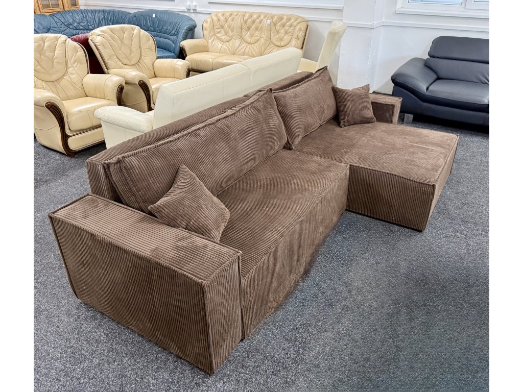 Rohová sedací souprava v celočalouněném provedení s látkovým potahem v hnědé barvě. Souprava je rozkládací, s úložným prostorem a plochou pro spaní 140 × 230 cm. Stav nepoužitá.