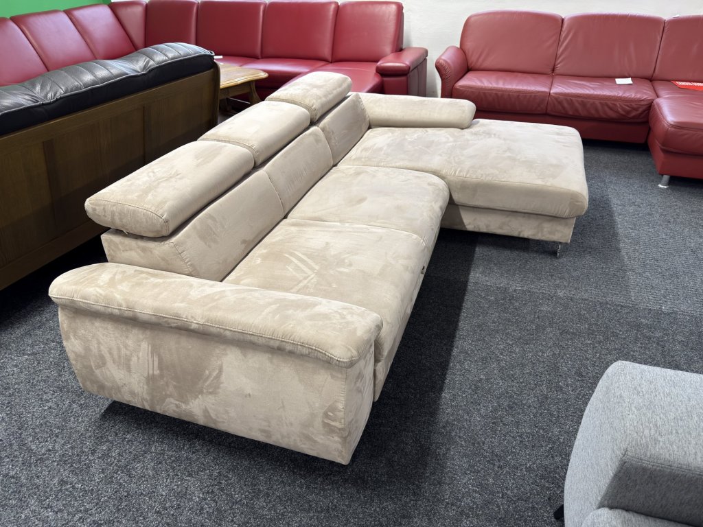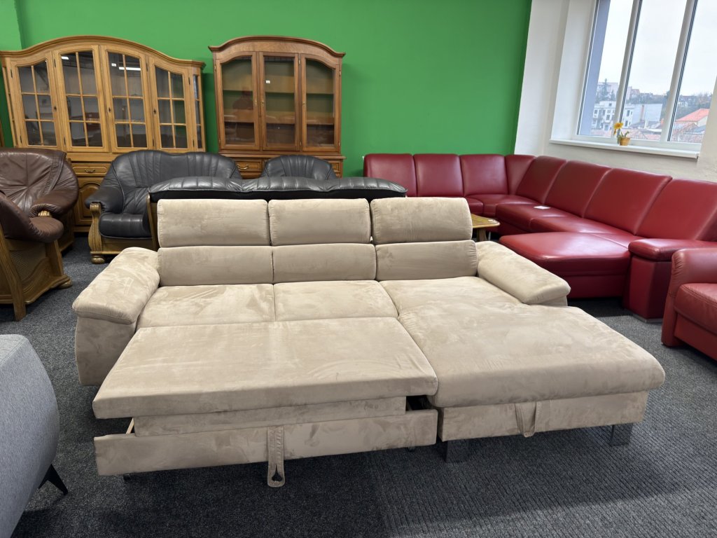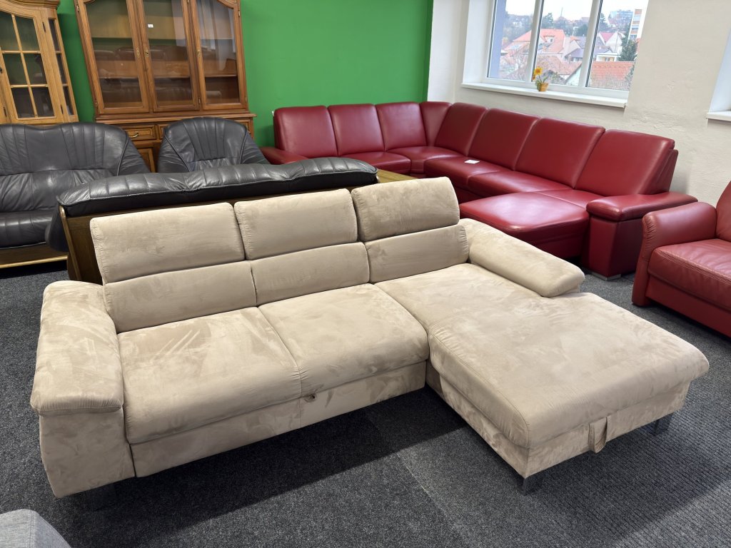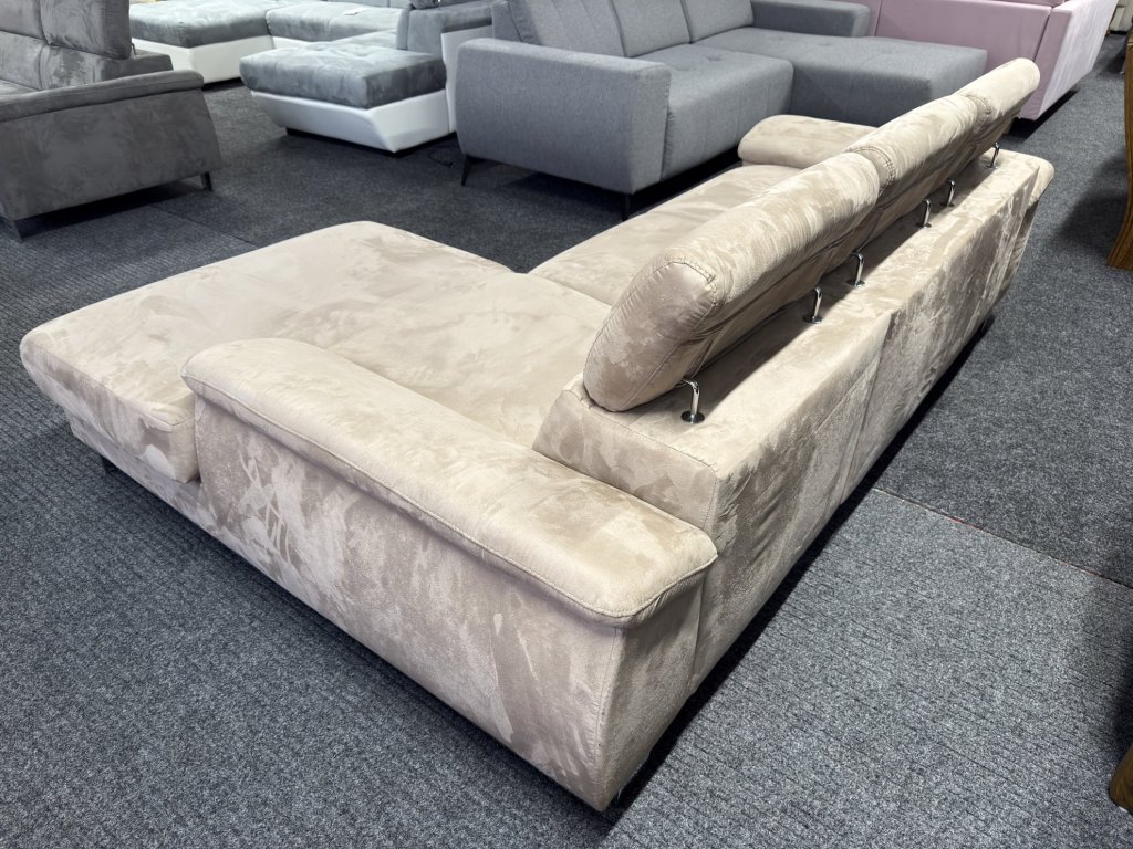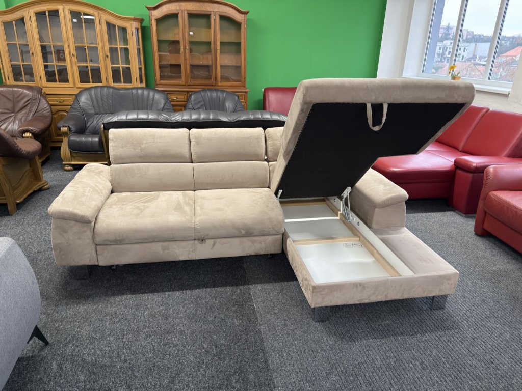 Sedací souprava ve tvaru L nabízí funkci rozkladu na lůžko a praktický úložný prostor pod otomanem. Součástí jsou polohovatelné opěrky hlavy a široké loketní opěrky. Potah je z jemné látky v světle béžovém odstínu.