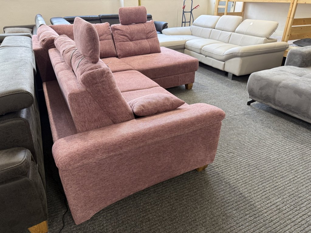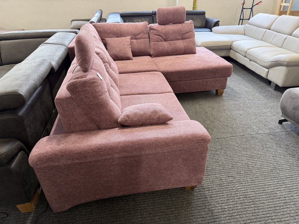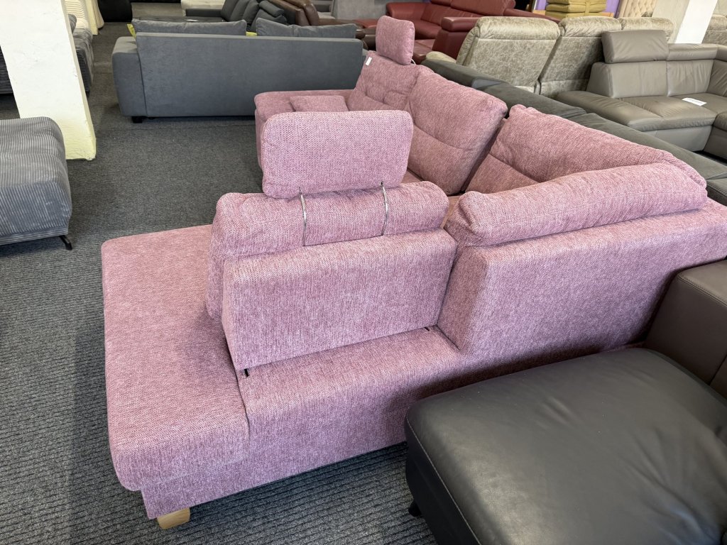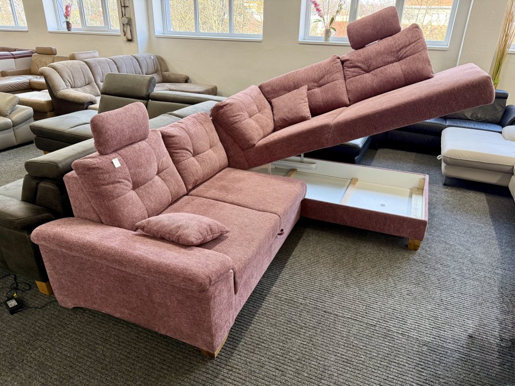 Rohová sedací souprava s látkovým potahem v celočalouněném provedení. Konstrukce umožňuje rozložení na plochu pro spaní a využití úložného prostoru. Souprava je vybavena posuvnými zádovými opěrkami. Sedací souprava je nepoužitá.
