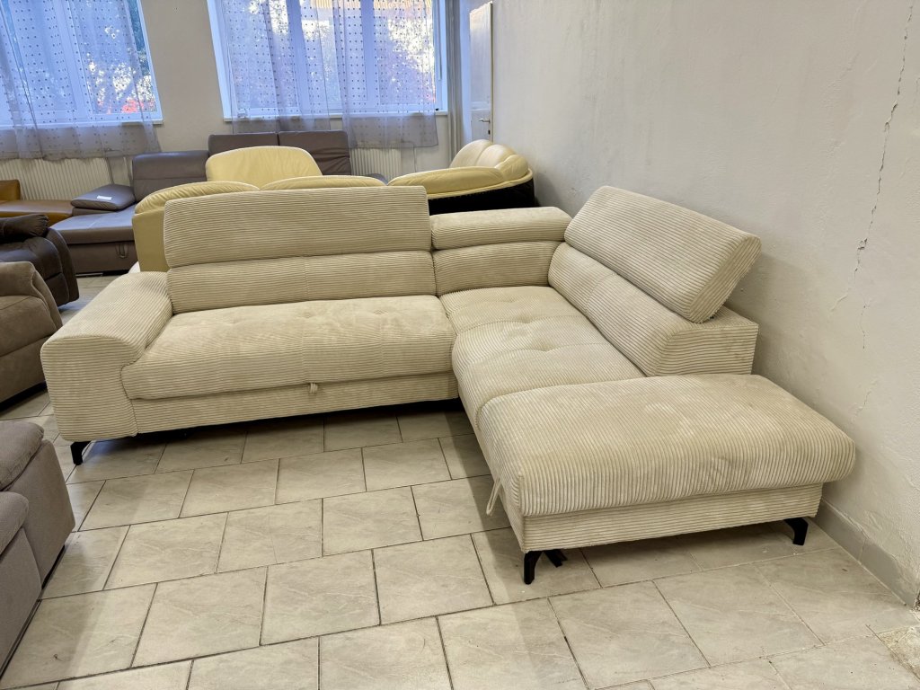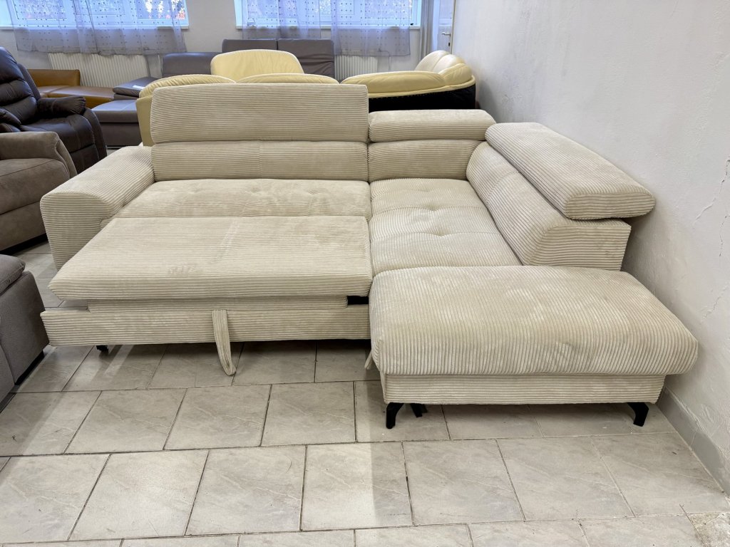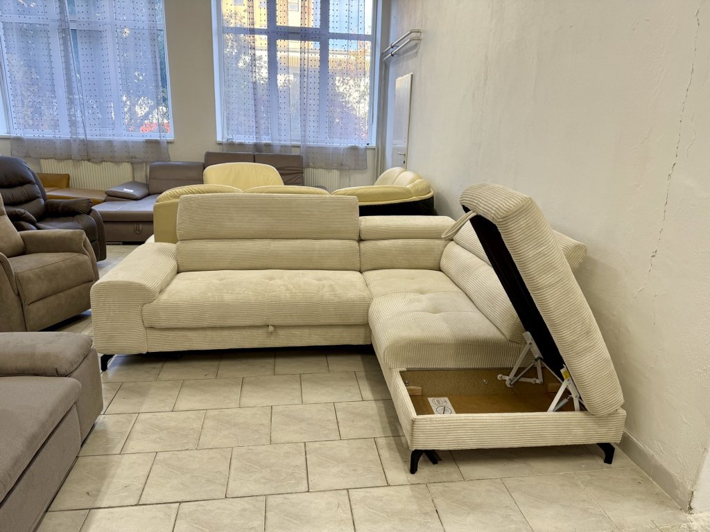 Rohová celočalouněná sedací souprava v béžové barvě s potahem ze strukturované látky nabízí rozkládací funkci a malý úložný prostor. Opěrky hlavy jsou polohovací. Souprava je nepoužitá.