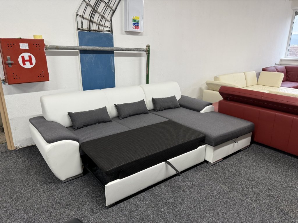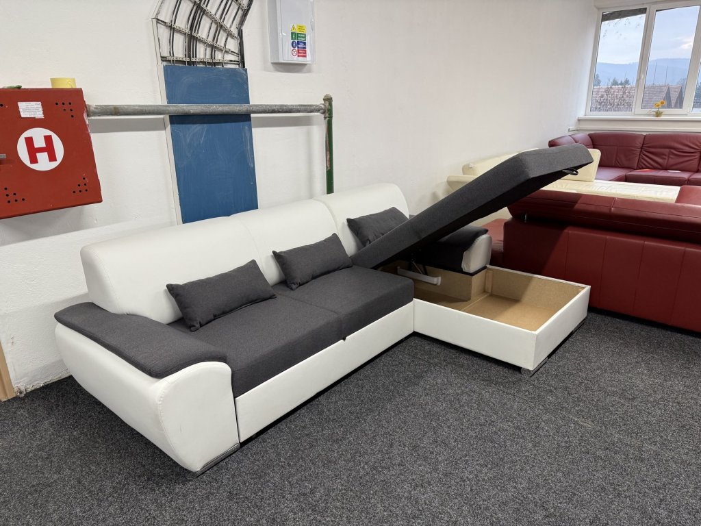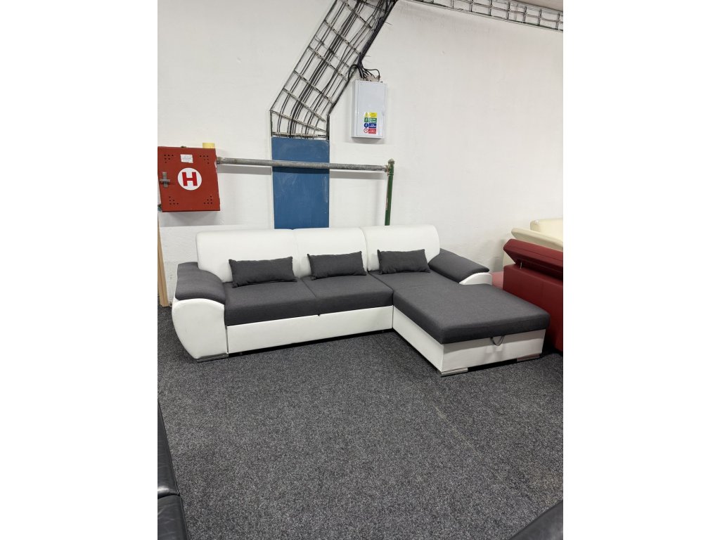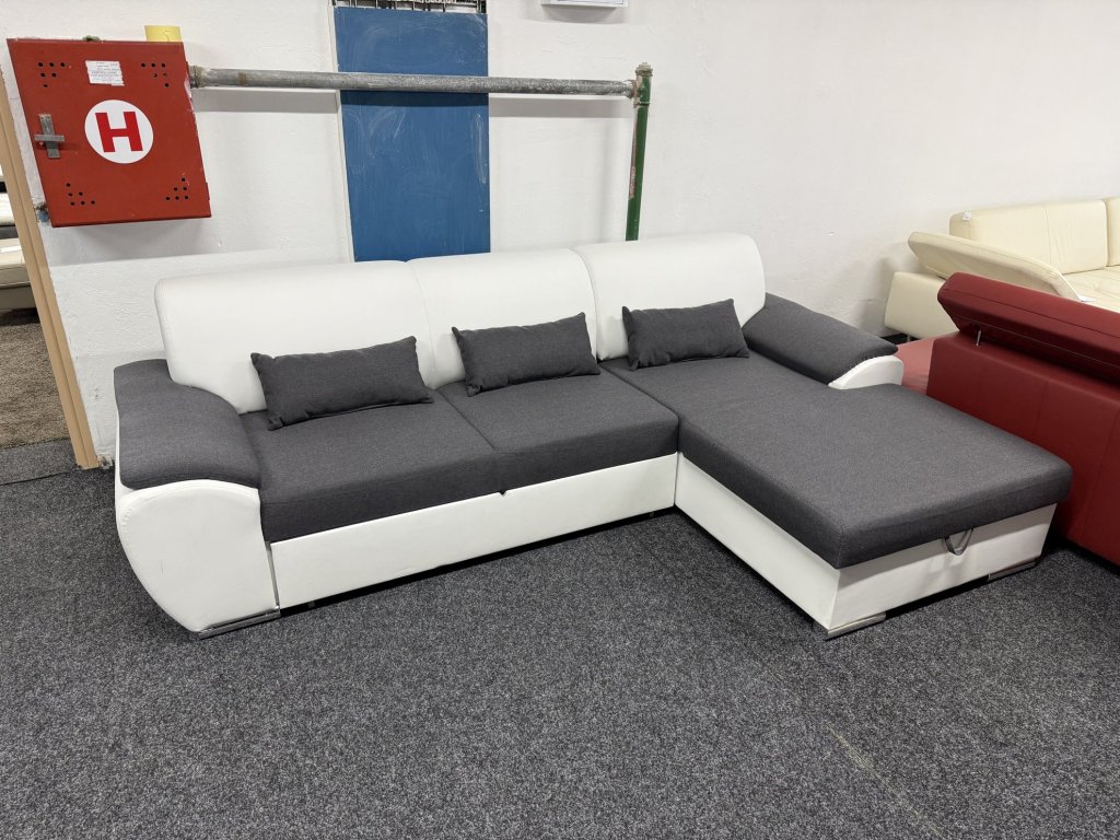 Rohová sedací souprava v kombinaci eko kůže a látky. Souprava je rozkládací a doplněná o praktický úložný prostor pod sedákem. Vhodná pro každodenní sezení i příležitostné spaní.