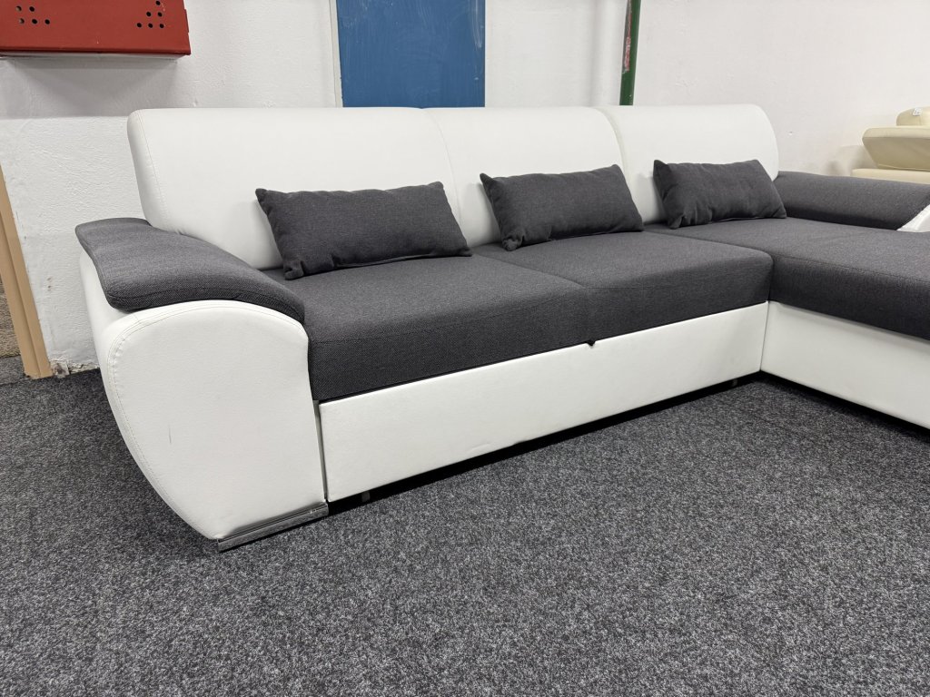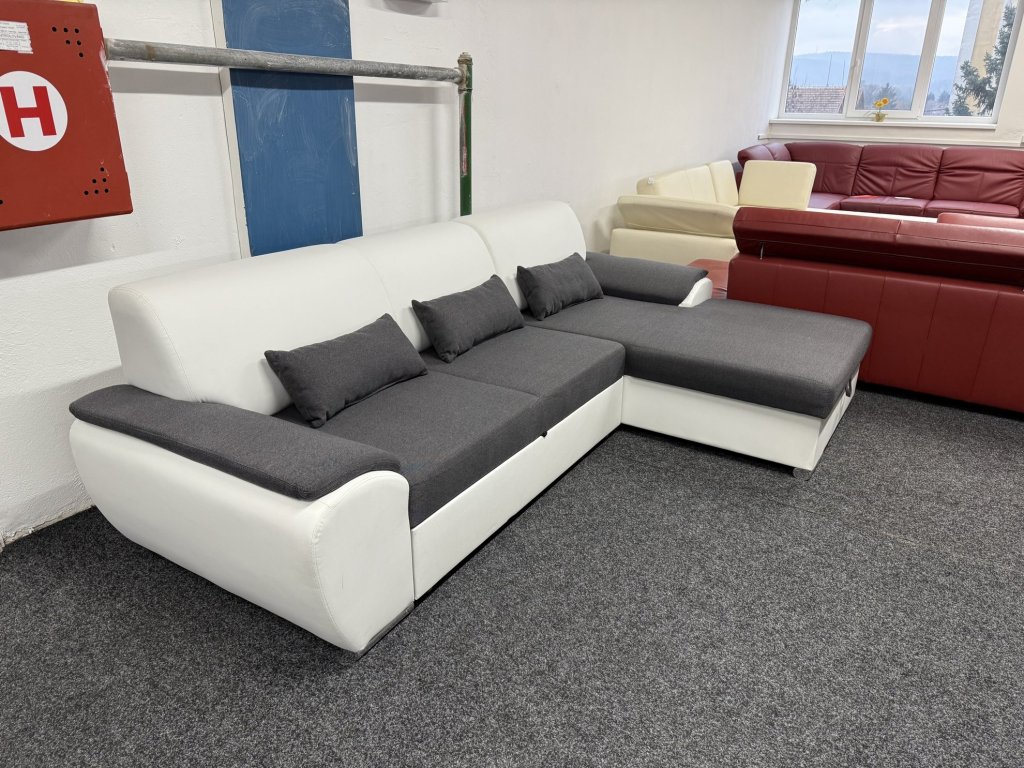 Souprava má tvar písmene L s levým provedením. Kombinace bílé eko kůže na korpusu a šedé látky na sedací části působí kontrastně a čistě. Součástí jsou tři opěrné polštáře v tmavě šedém odstínu.